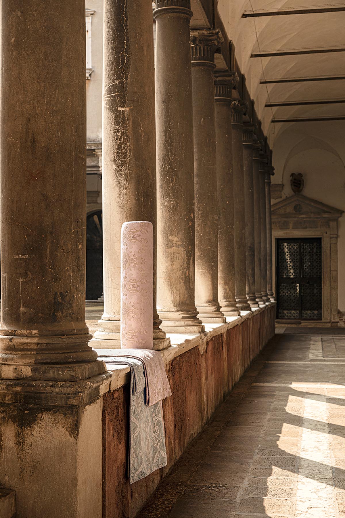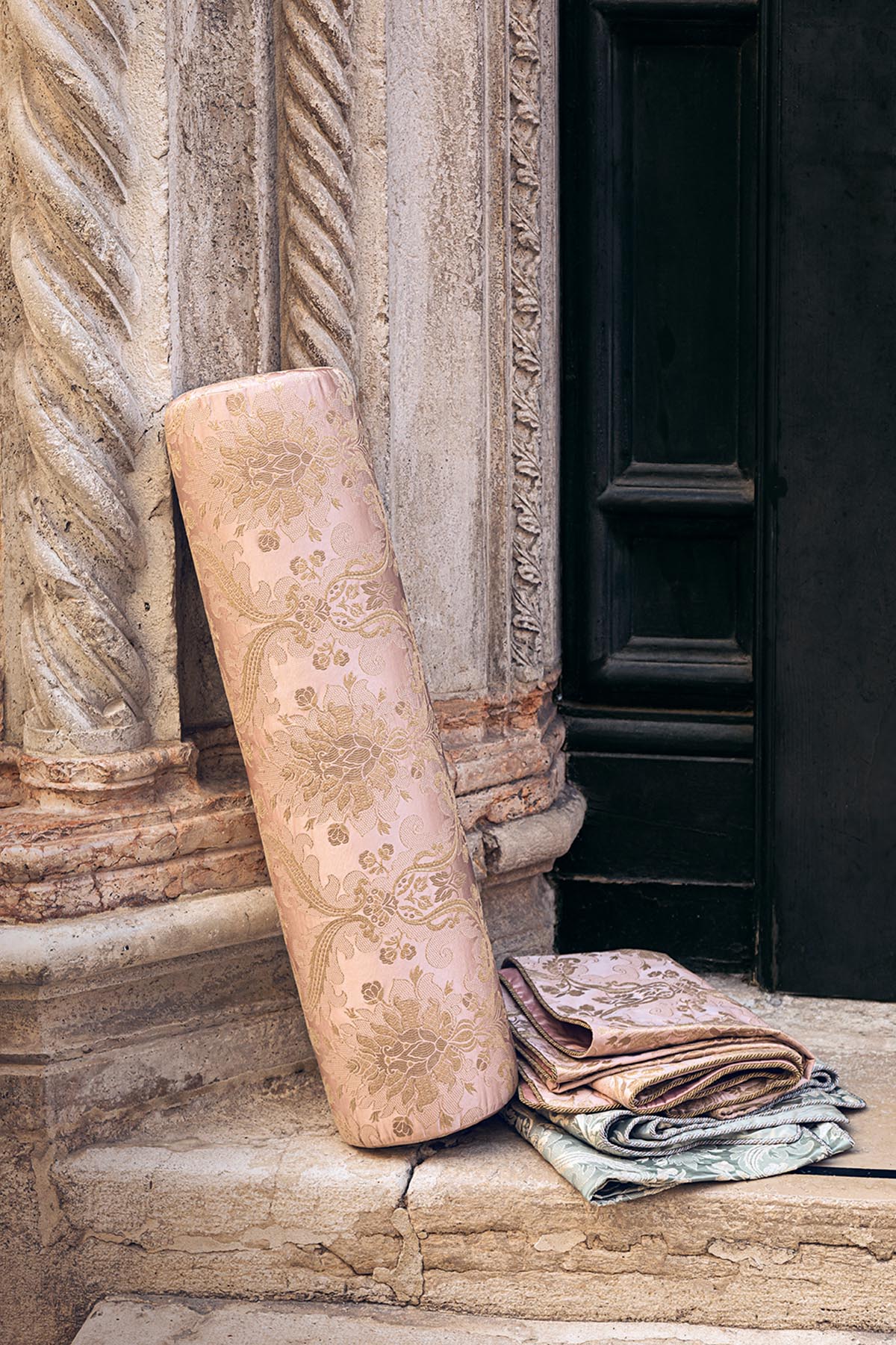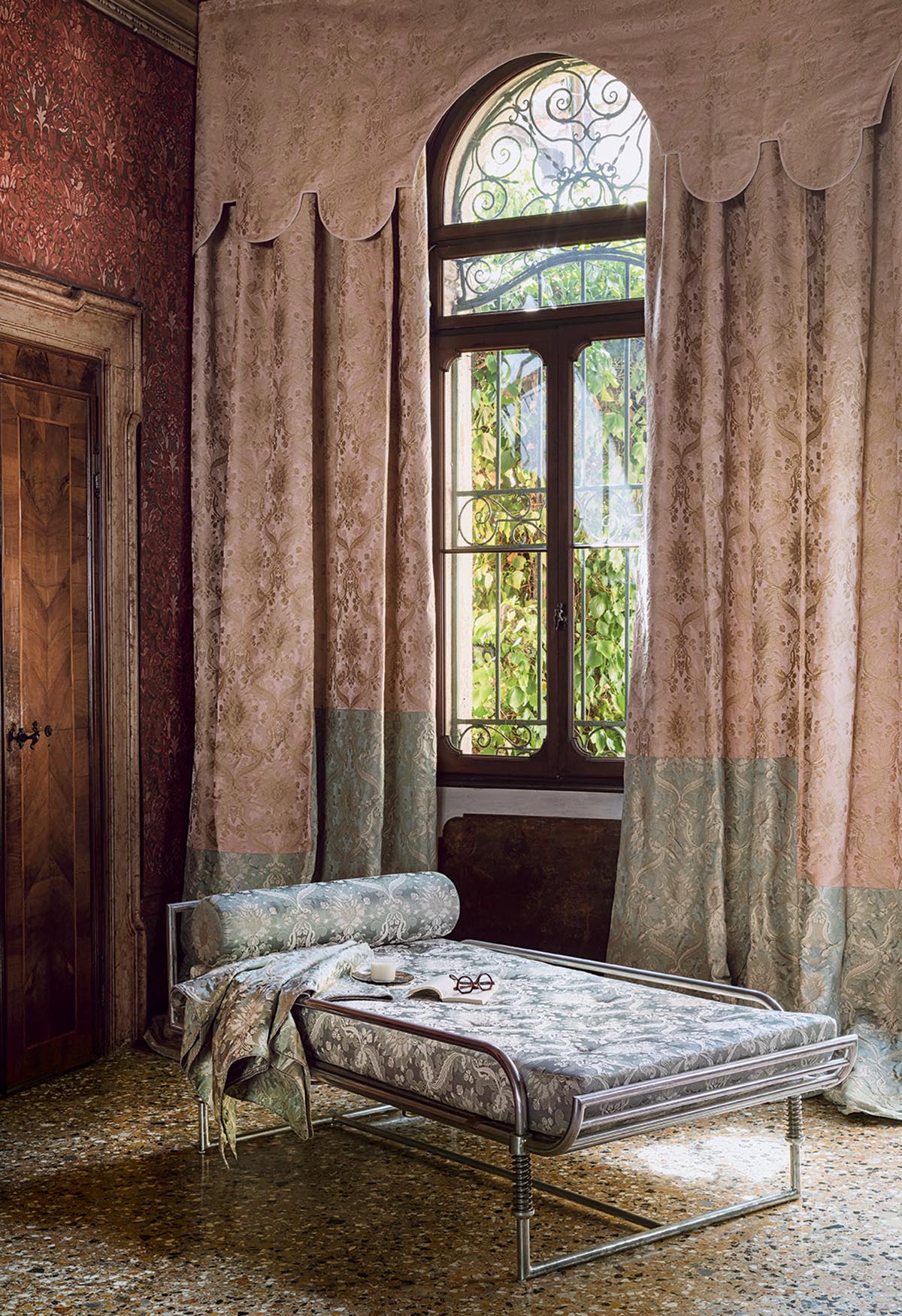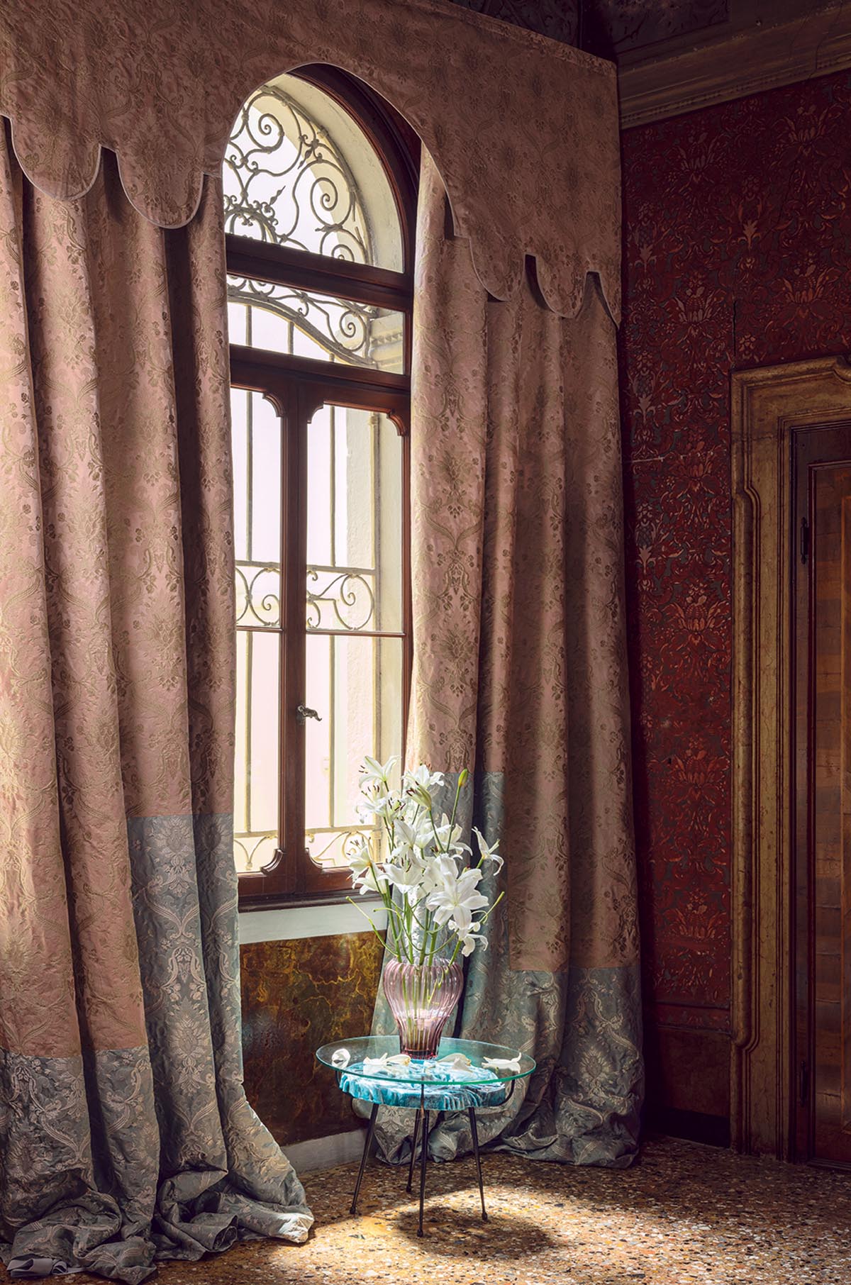 In the spirit of the great Italian classics of the late 17th century, the gold and silver yarns of this figured lampas, in the colors of Venice, sparkle and bring out the volutes of the design.