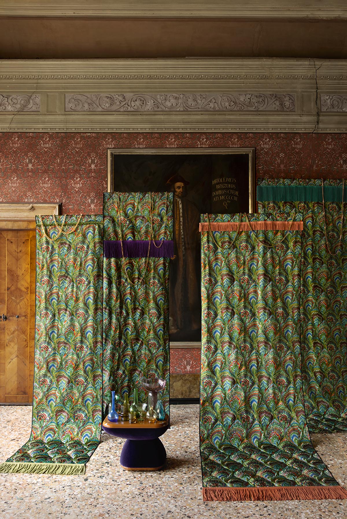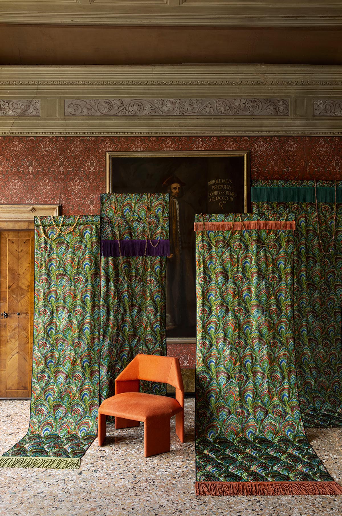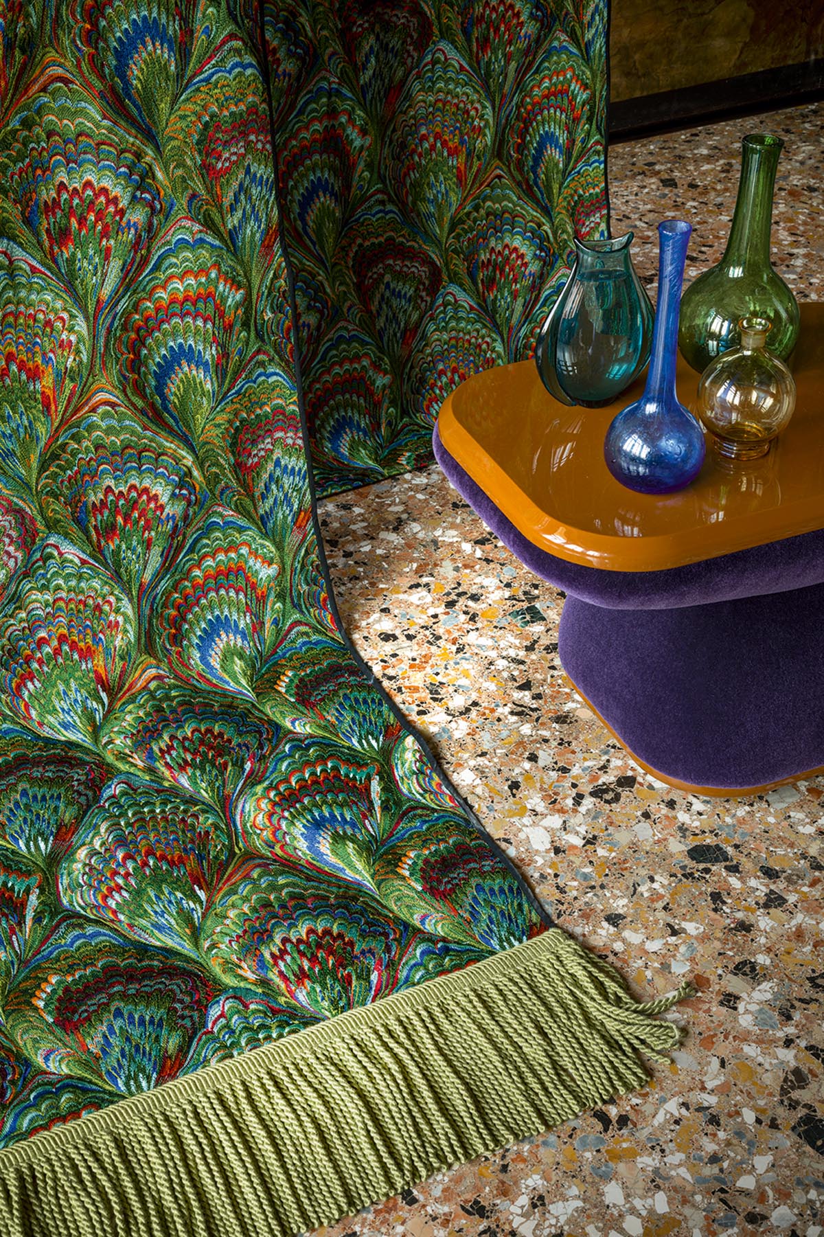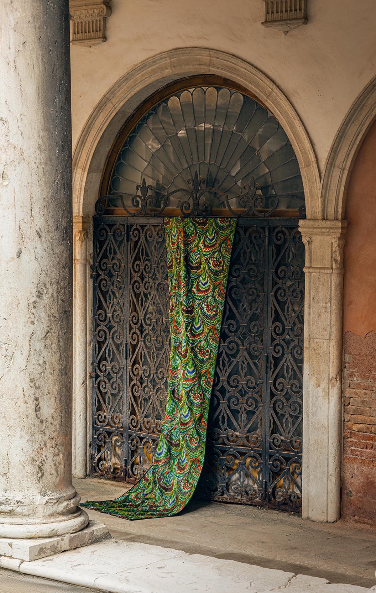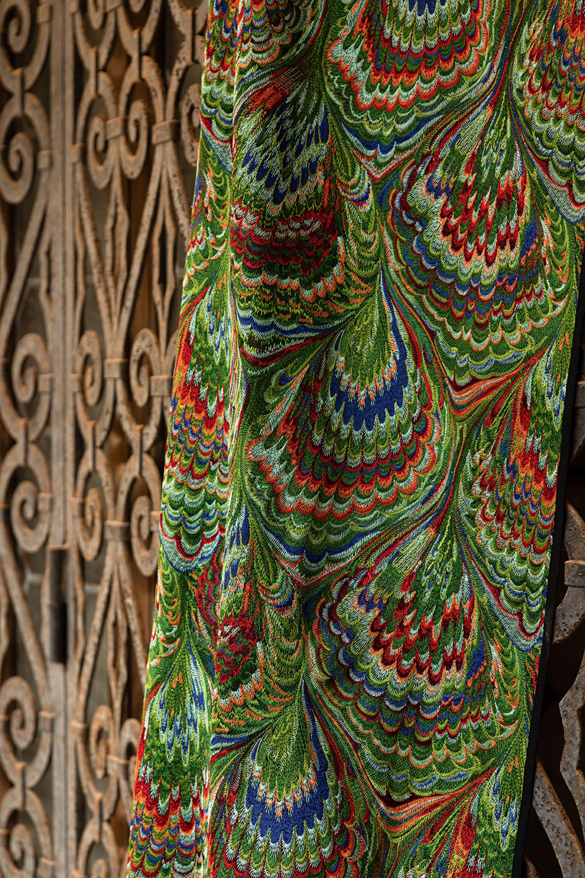 In an entirely embroidered interpretation, this pattern with complex shapes and bright colors is inspired by the Venetian marbled papers, appreciated by bookbinders for their ornamental beauty.