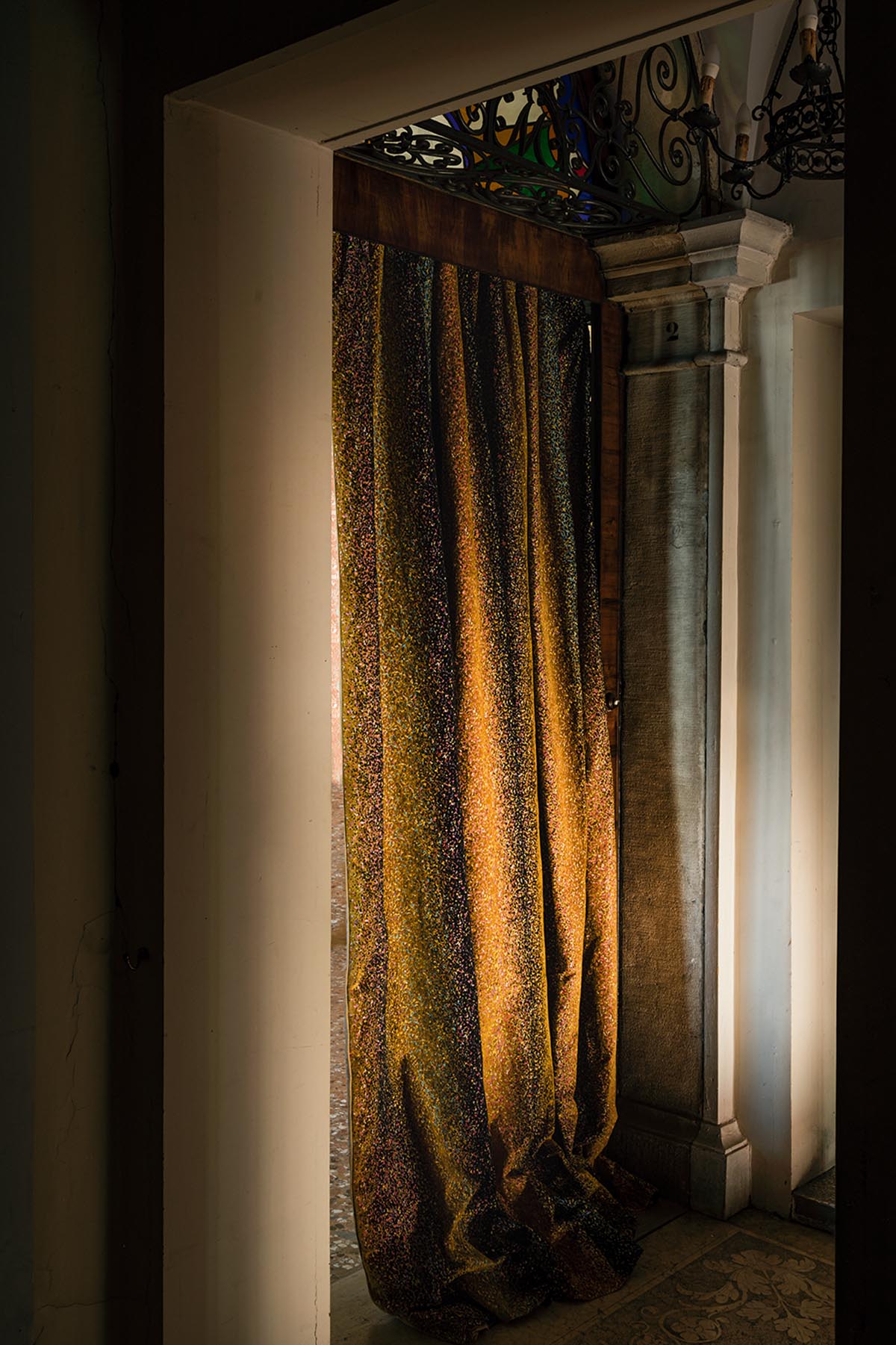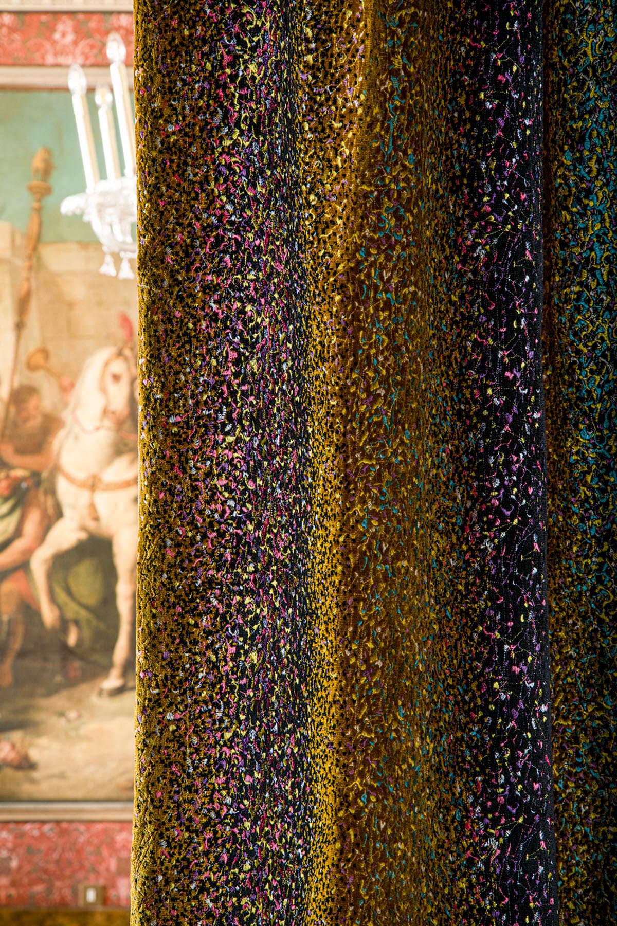 Exceptional velvet embroidered to resemble multicolored sequins that transports us into the festive and magical atmosphere of the Venice carnival.