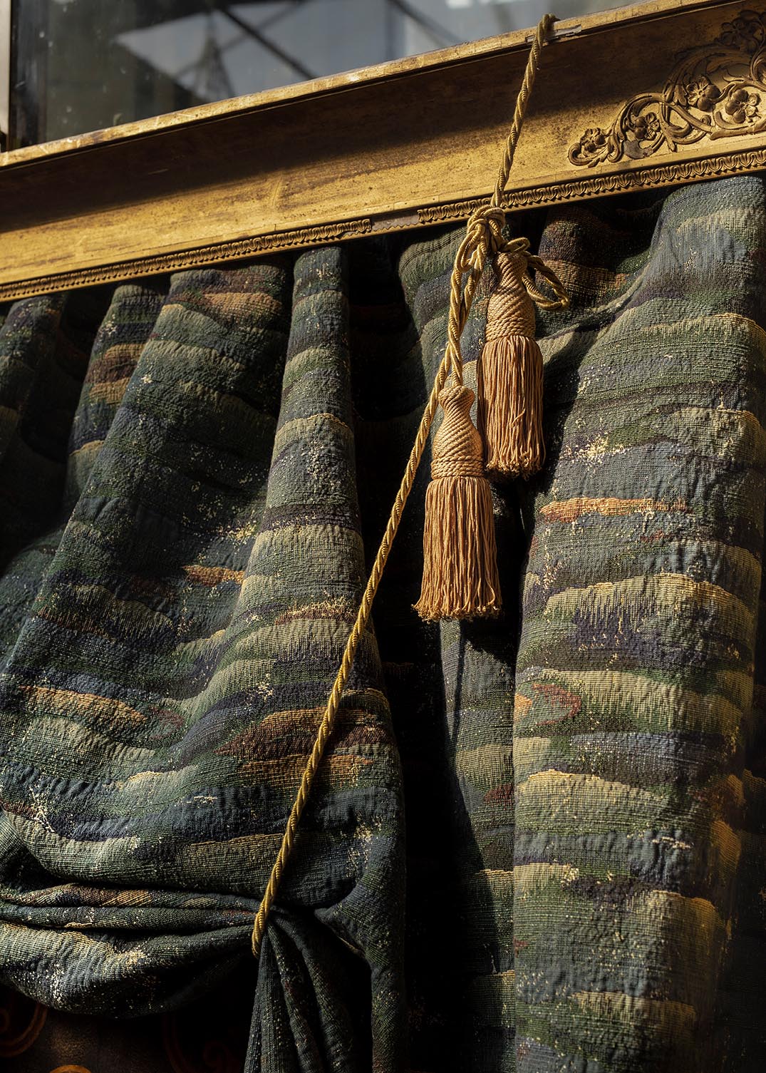 Thought in the manner of a large semi-plain, this jacquard tapestry is based on the repetition of a detail of an old 17th century tapestry from the Pierre Frey archives. It evokes an abstract landscape sublimated by time, thanks to its worn weaving effect.