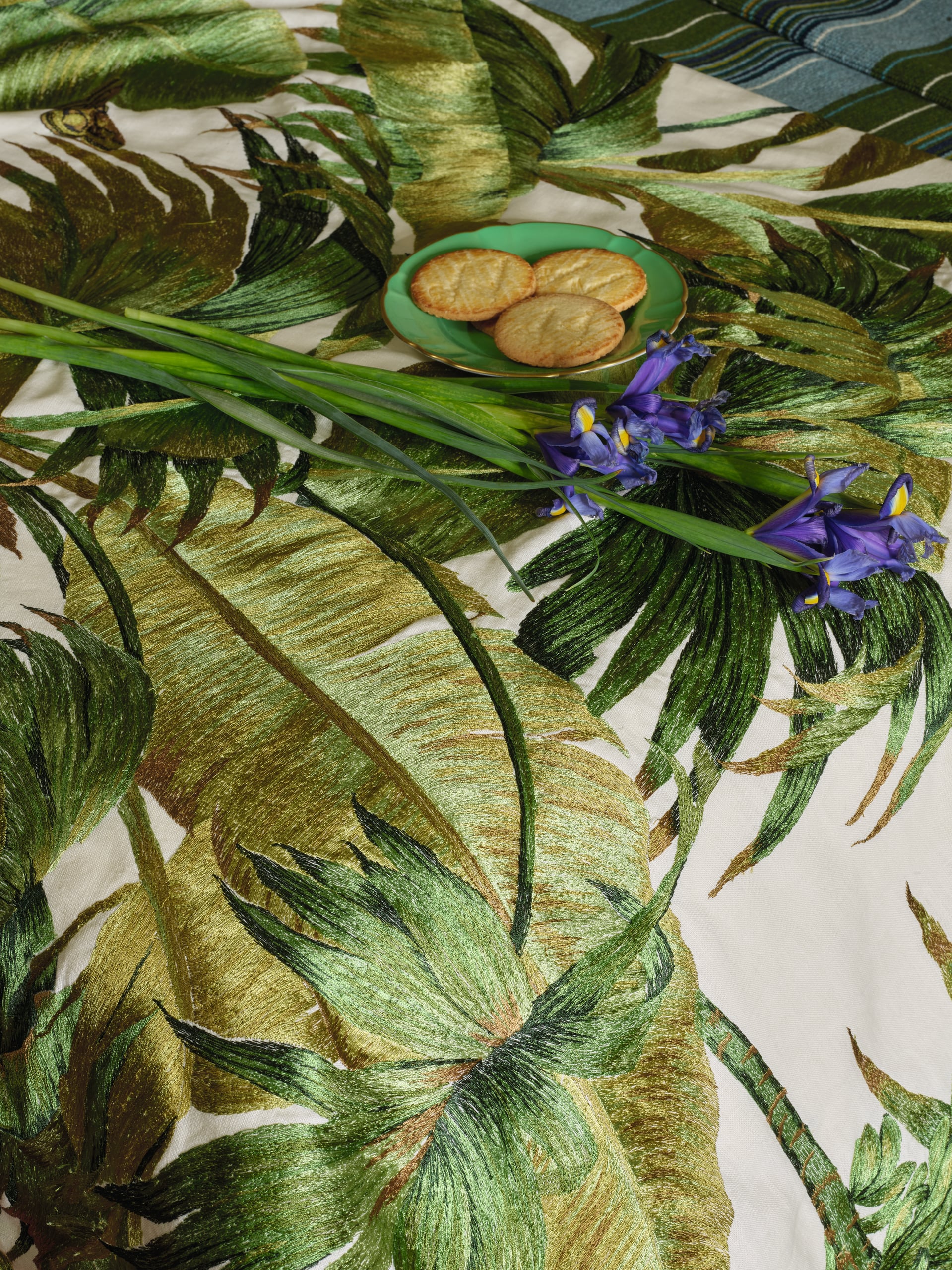 Embroidered on linen, this delightful full-width design revisits one of the most iconic patterns from the Boussac collection, featuring broad, graphic, and vibrant botanical forms. With its vintage spirit, the motif conjures the atmosphere of the Californian homes of the 1960s, as captured through the lens of Robert Doisneau.