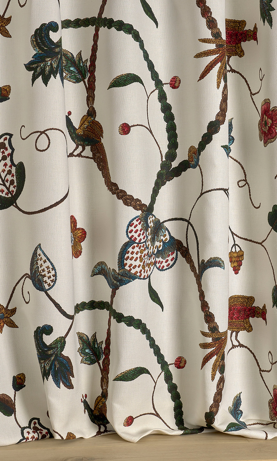 Charming trompe-l'oeil of a Crewel embroidery in the Elizabethan style, made in the pure English tradition.