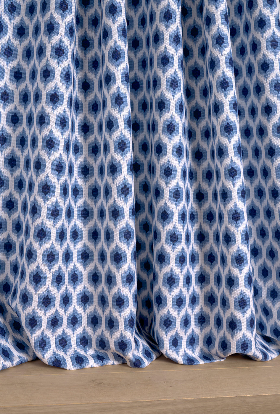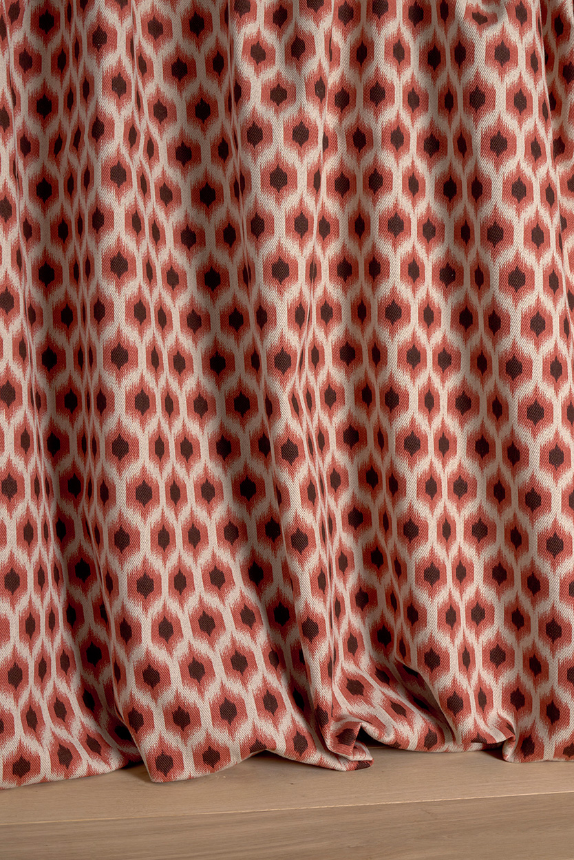 This pattern of small ikat rhombuses is a nod to decoration from the 70's, based on optical illusion.