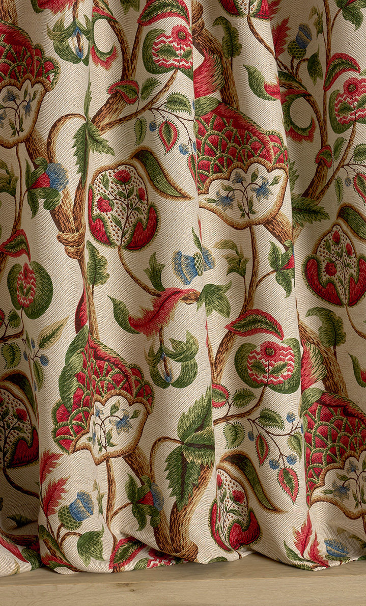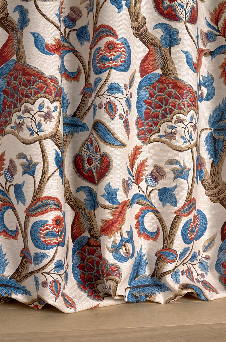 This magnificent motif of sinuous flowering branches is a trompe-l'œil reproduction of the spectacular Crewel embroideries from the 17th English century.