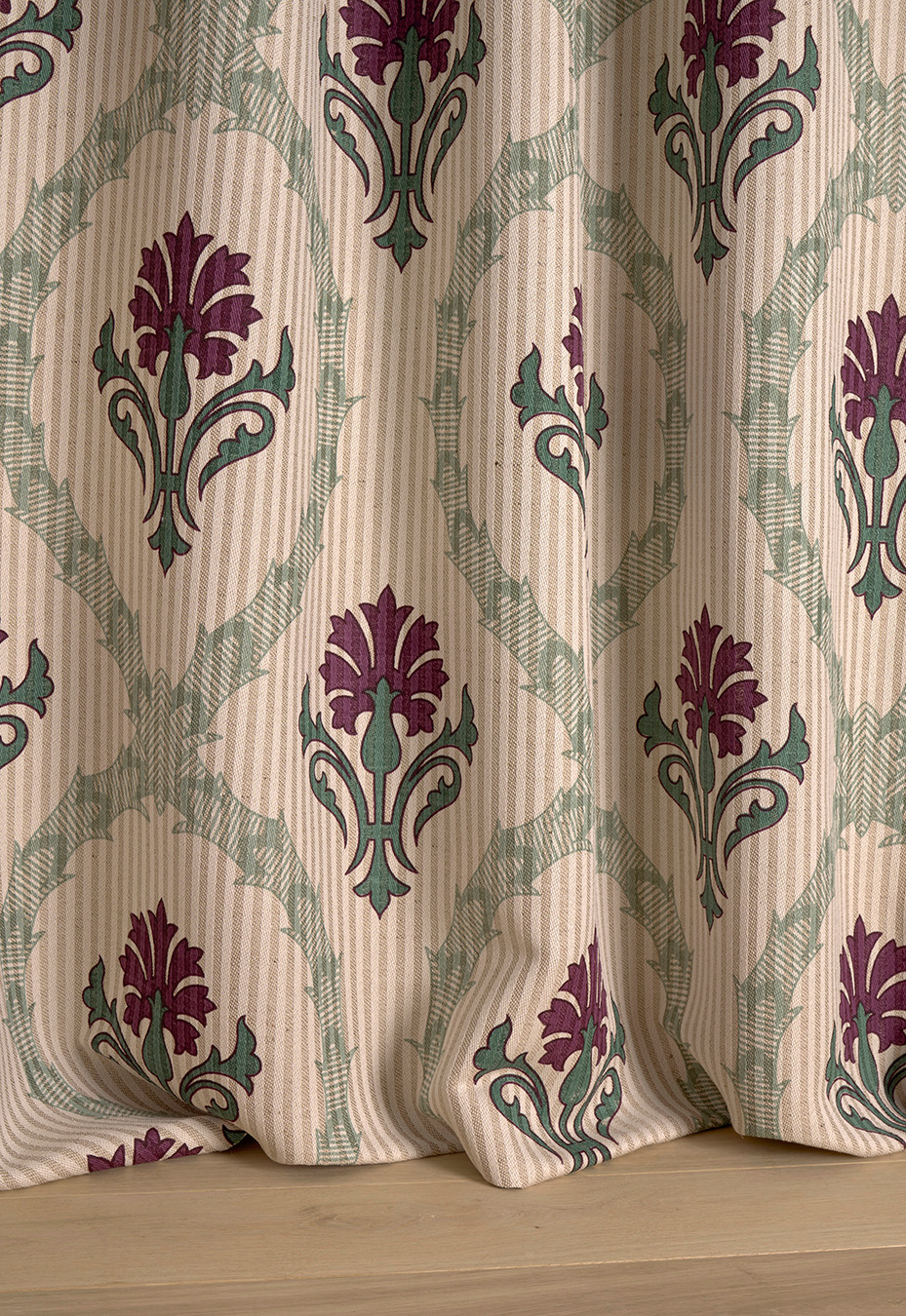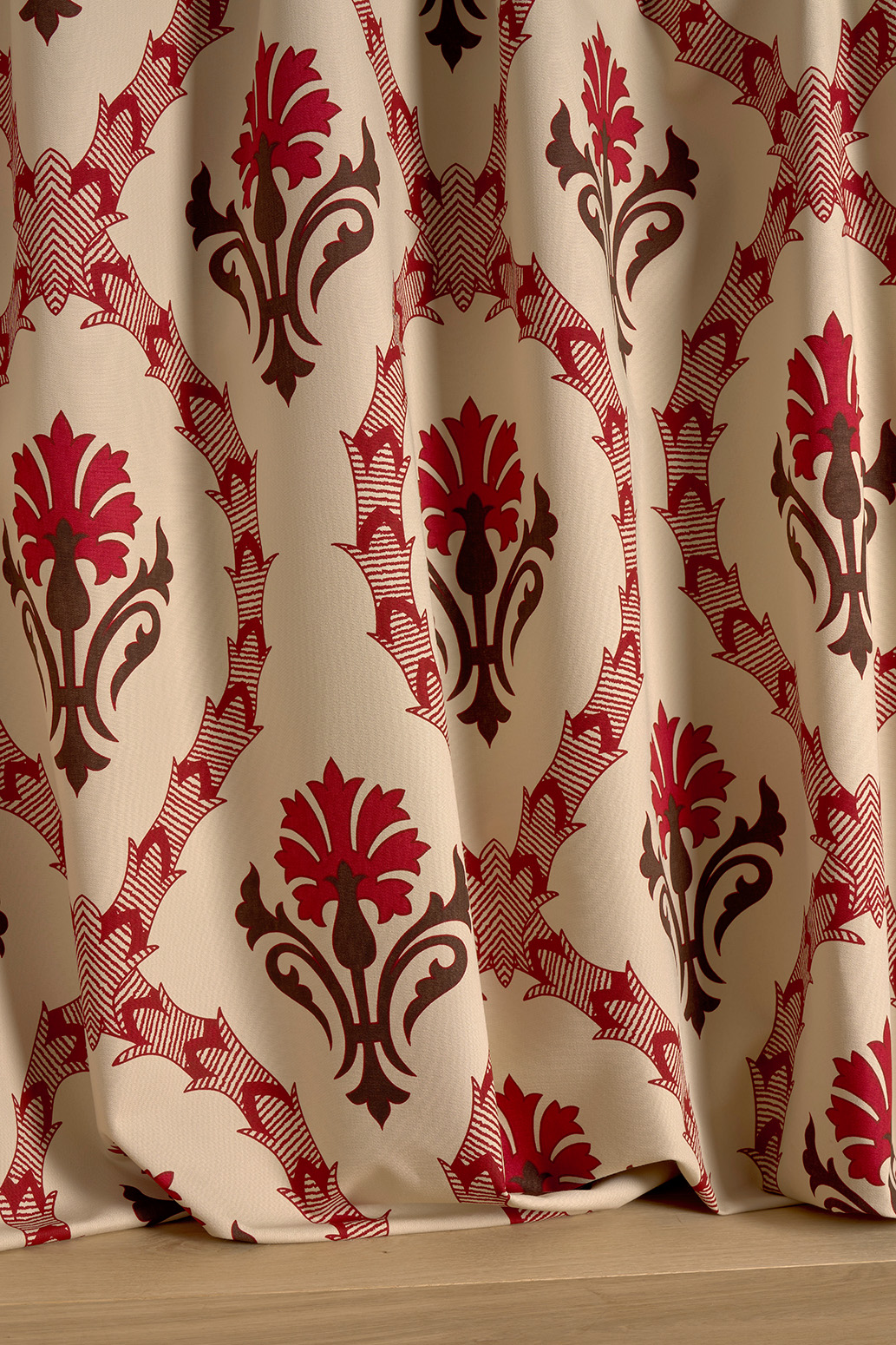 This pattern of stylized carnations set in staggered mandorls is a nod to the Arts and Crafts movement.