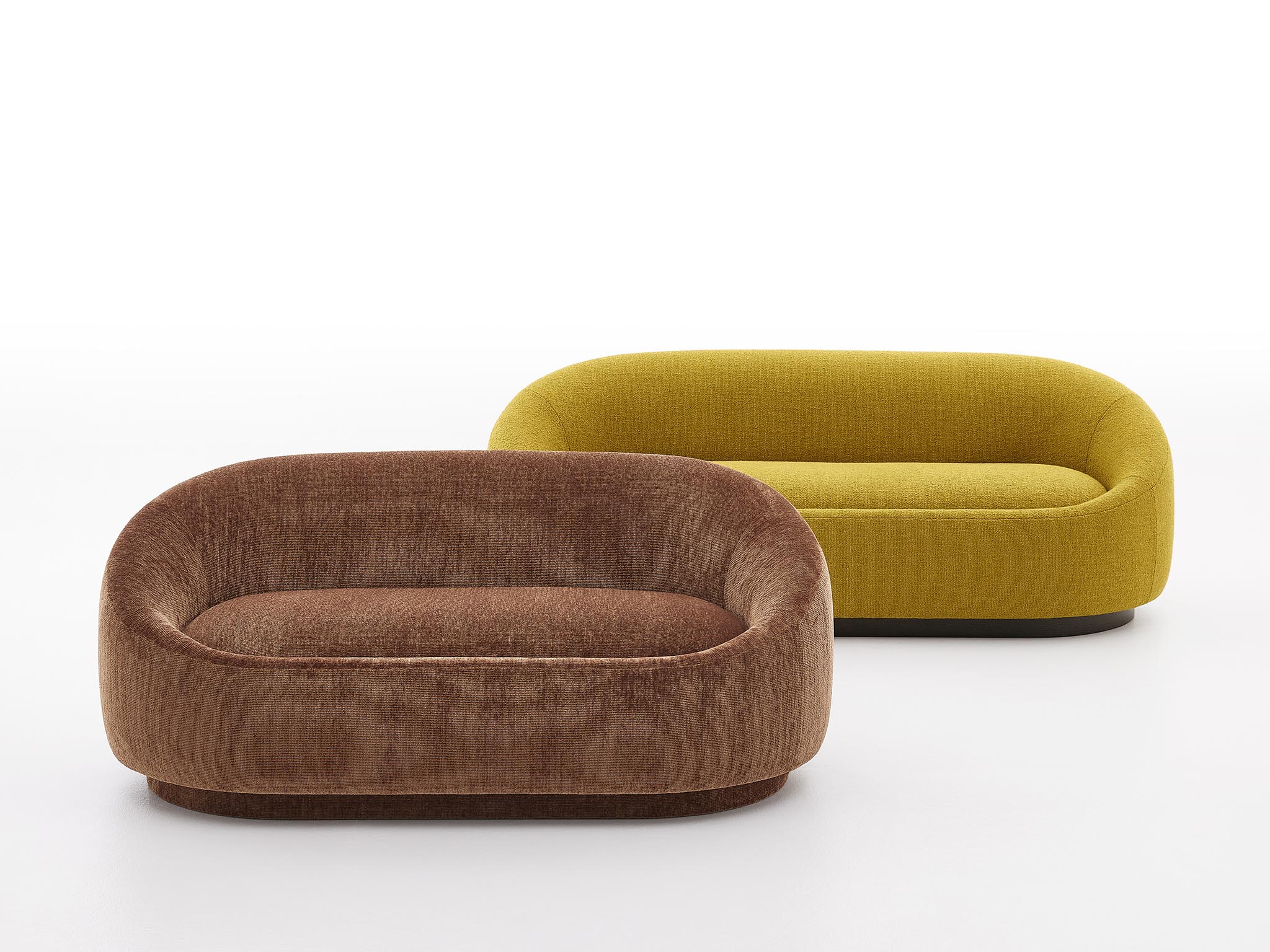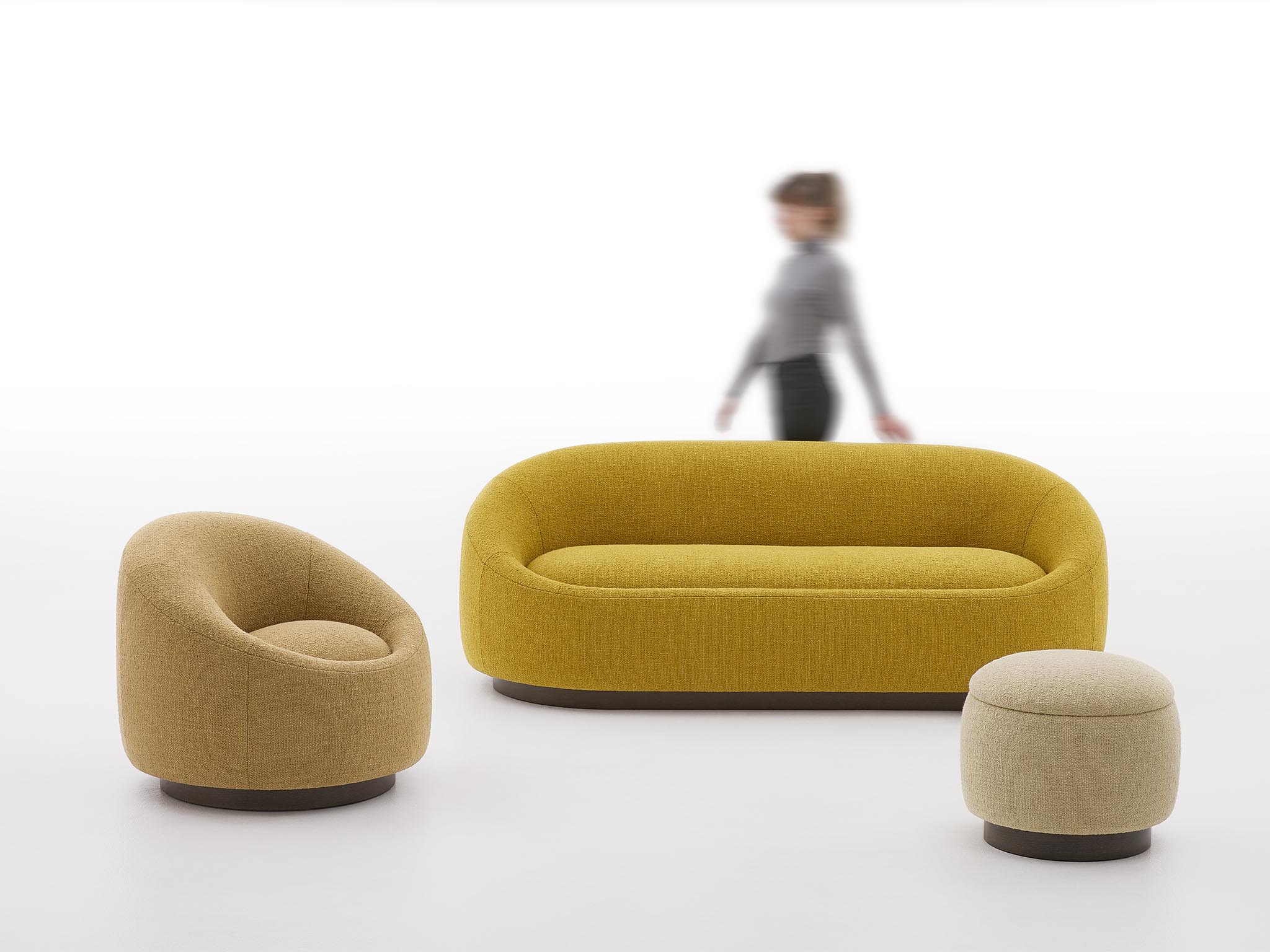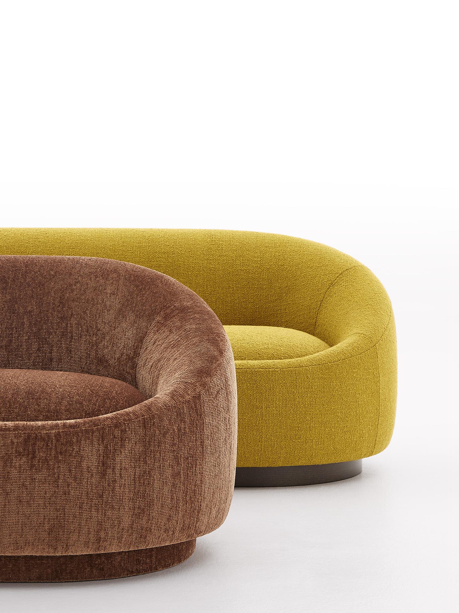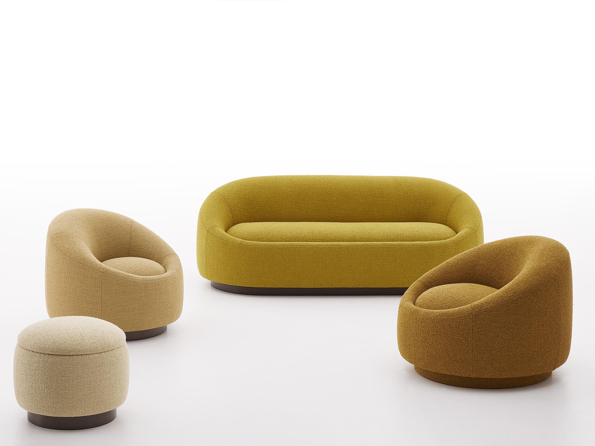 Designed by Christian Haas, Berlin is based on an organic, rounded aesthetic vocabulary. The pure line of the backrest surrounds the seat in a continuous movement. The upholstered base gives a slight lift to the structure and creates a lightness to the pieces. Entirely upholstered, sofa, pouf and armchair are a tribute to the know-how of Maison Pierre Frey.