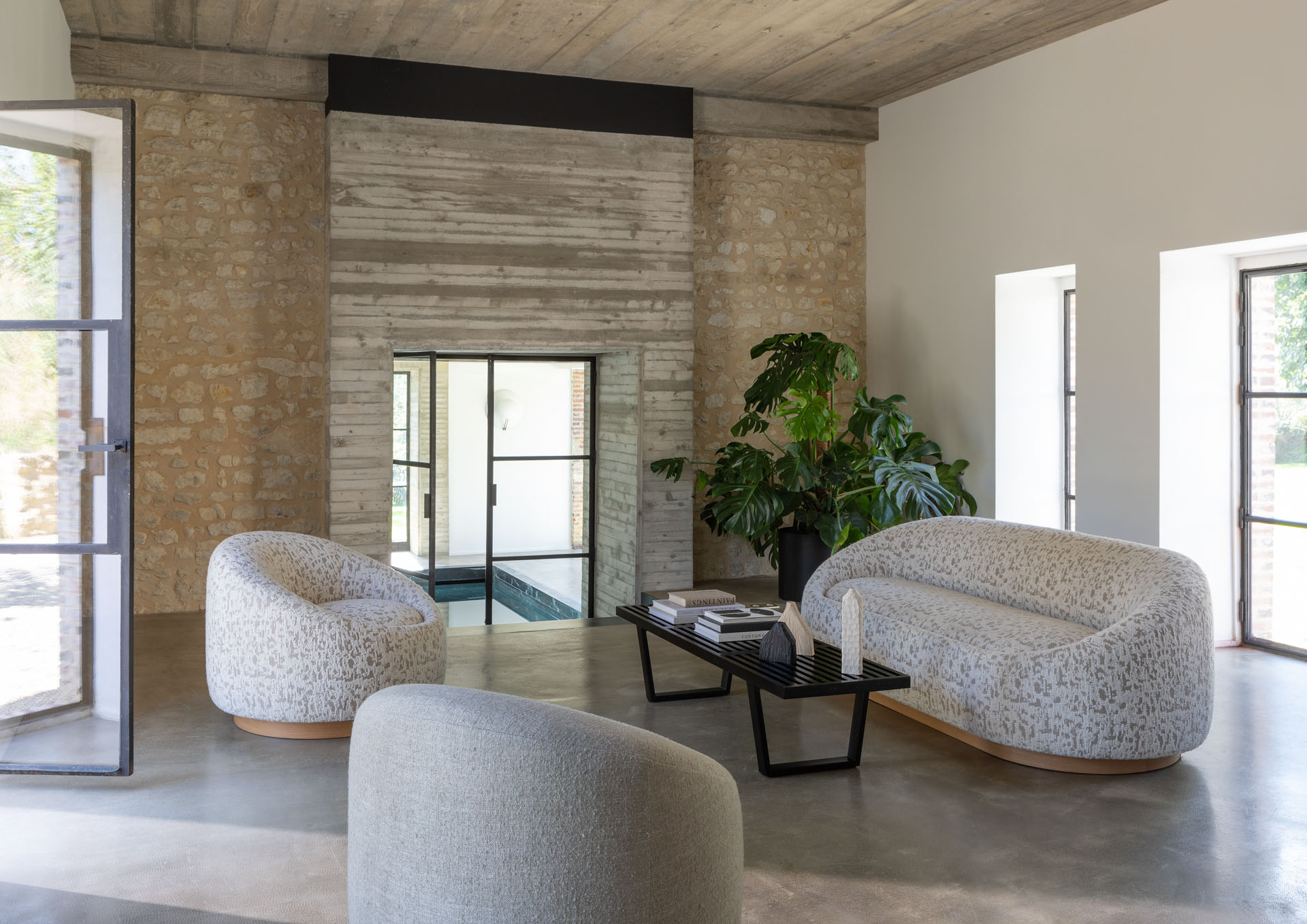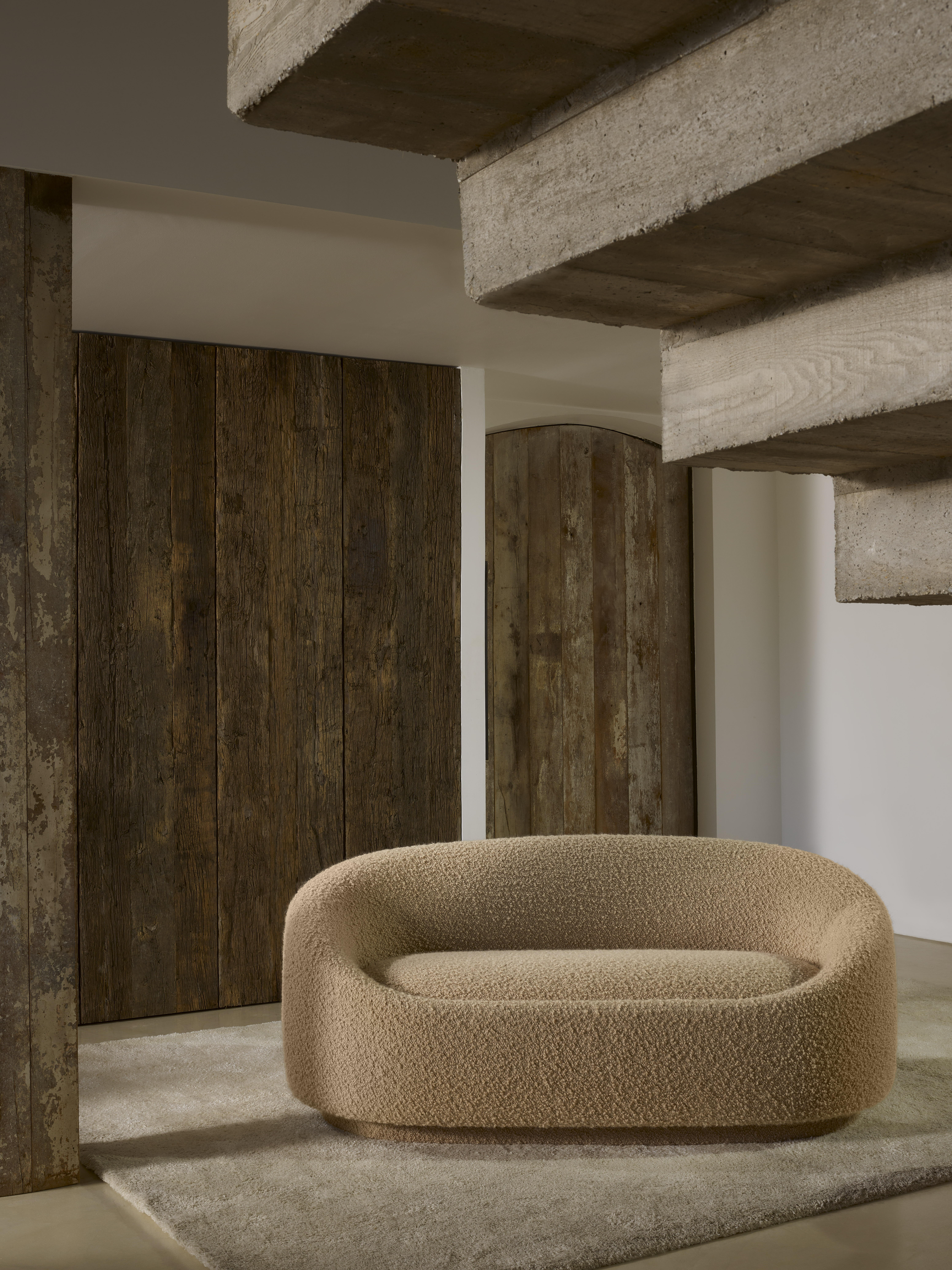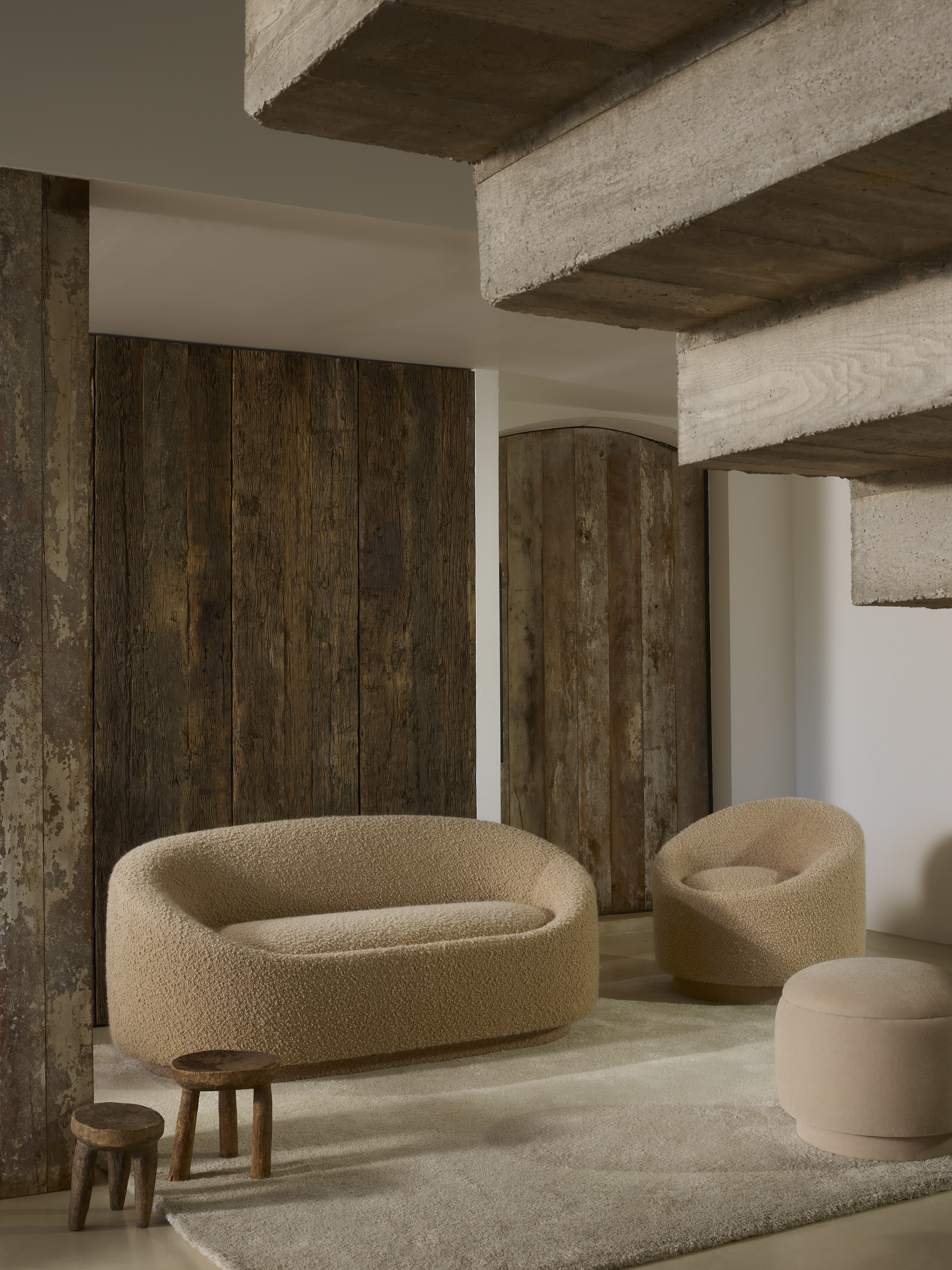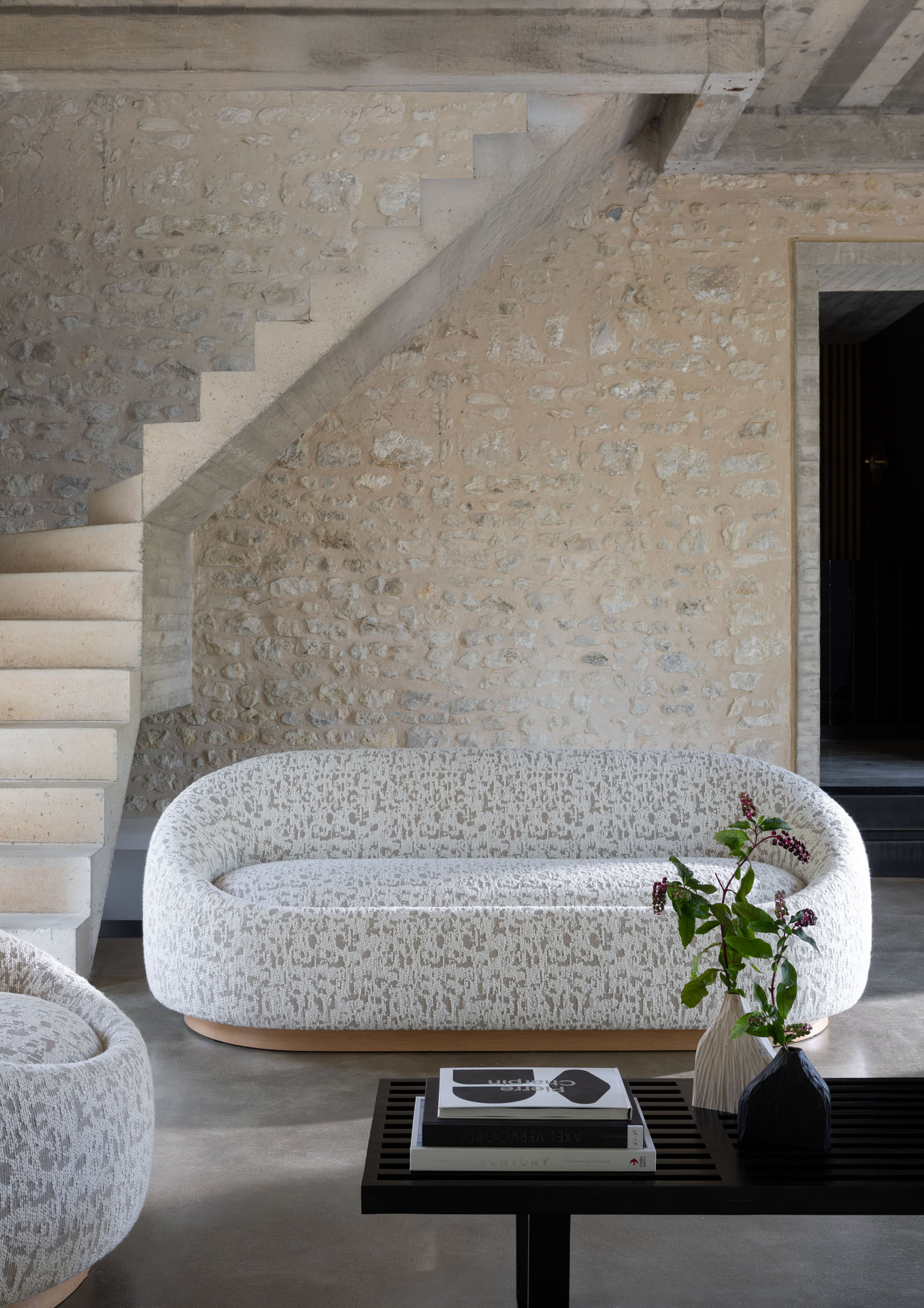 Designed by Christian Haas, Berlin is based on an organic, rounded aesthetic vocabulary. The pure line of the backrest surrounds the seat in a continuous movement. The upholstered base gives a slight lift to the structure and creates a lightness to the pieces. Entirely upholstered, sofa, pouf and armchair are a tribute to the know-how of Maison Pierre Frey.