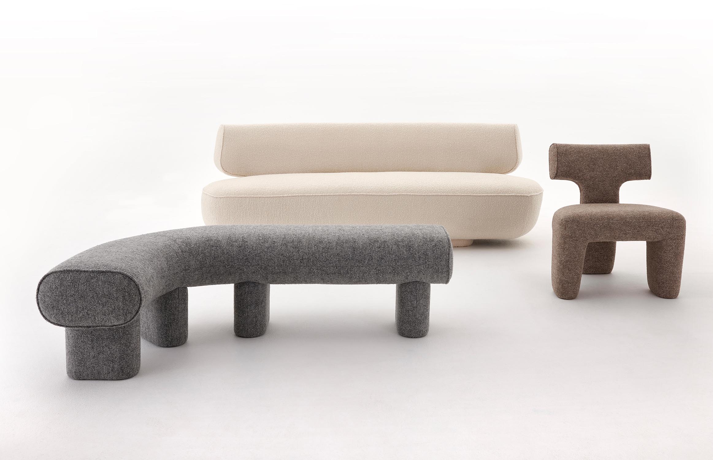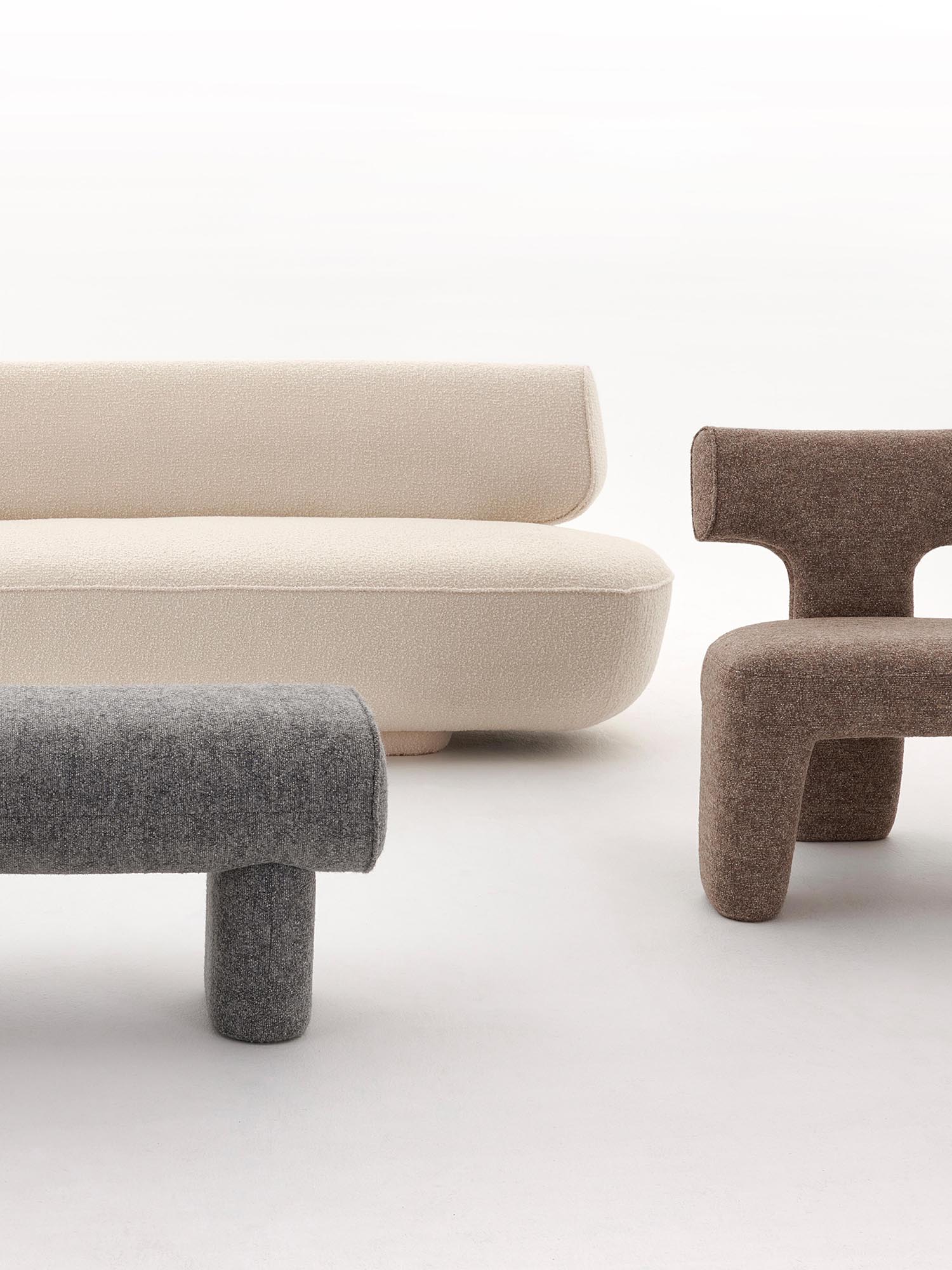 The LITHO line, designed by Guillaume Delvigne, means «stone» in ancient Greek. It resembles a primitive landscape where each piece would have its own personality and would resonate with each other. Each piece is the result of an assembly of volumes, either nested or simply placed one on top of the other, reinforcing this monolithic presence. Large, massive and sculpted forms emerge with a polished, almost mineral appearance. Entirely upholstered in fabric, they pay homage to the Maison’s historical know-how. Sofa, slipper chair and bench evoke a relaxed and friendly attitude.