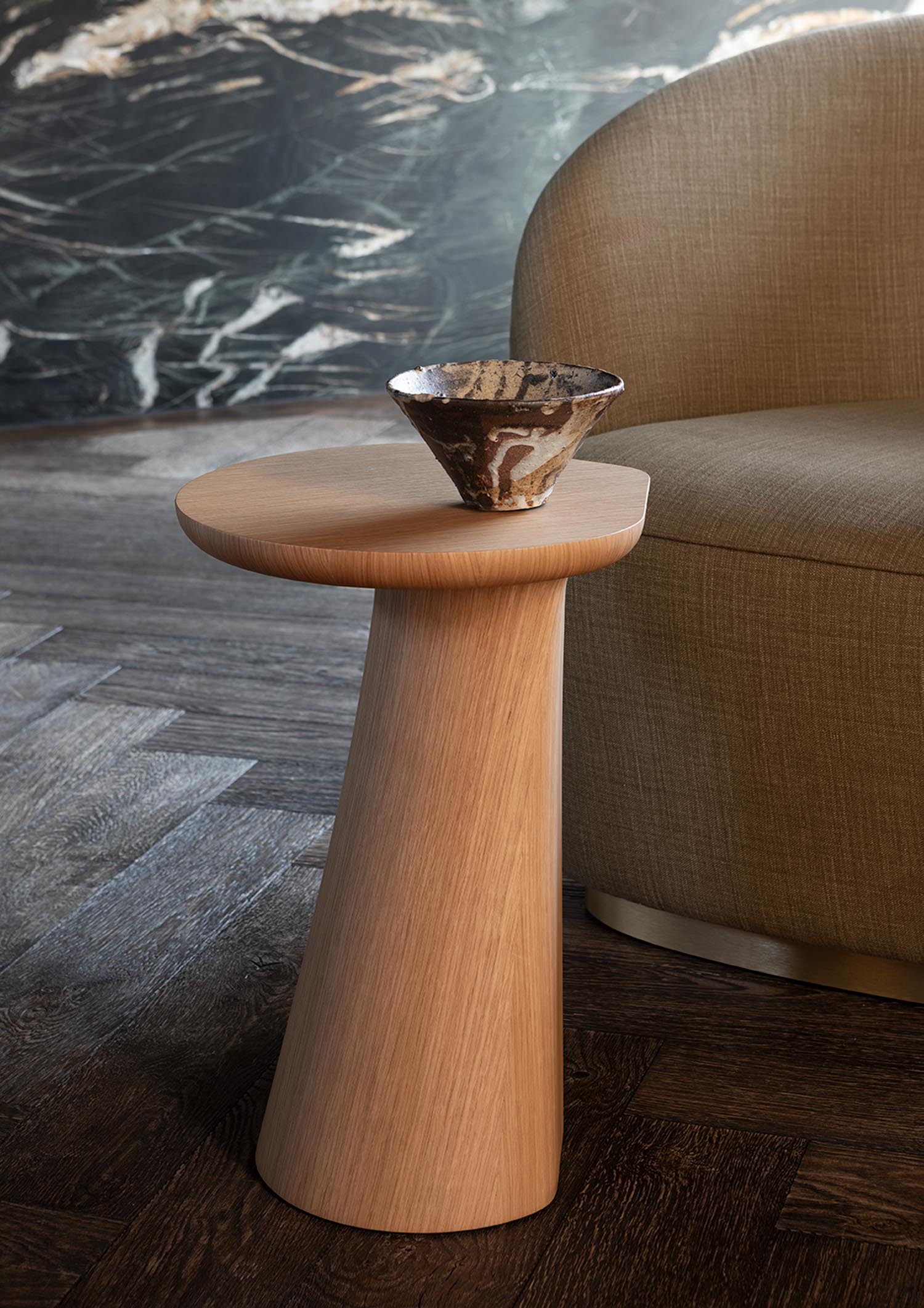 SHIFUMI, conceived by RDAI, explores a subtle balance between structure and movement. It is a collection of tables designed as a cohesive whole, where the precision of the lines engages in dialogue with a freer, almost organic form. Each tabletop suggests a petal. A simple, legible shape that repeats and echoes, gradually composing a landscape. Play is at the heart of SHIFUMI. Available in three heights, the tables come together instinctively. They draw close, overlap, or drift apart, forming ever-changing compositions. Whether grouped as a central cluster or placed as accents, they adapt effortlessly to both space and use. The design’s apparent lightness rests on a true feat of balance. The cantilever, precisely mastered, gives the tops a sense of suspension while maintaining perfect stability. The structure recedes, allowing the form to take center stage. The finishes extend this language. Oak veneers in deep tones or colored lacquers, whether matte, satin, or gloss, accentuate the contours and define the character of each composition.