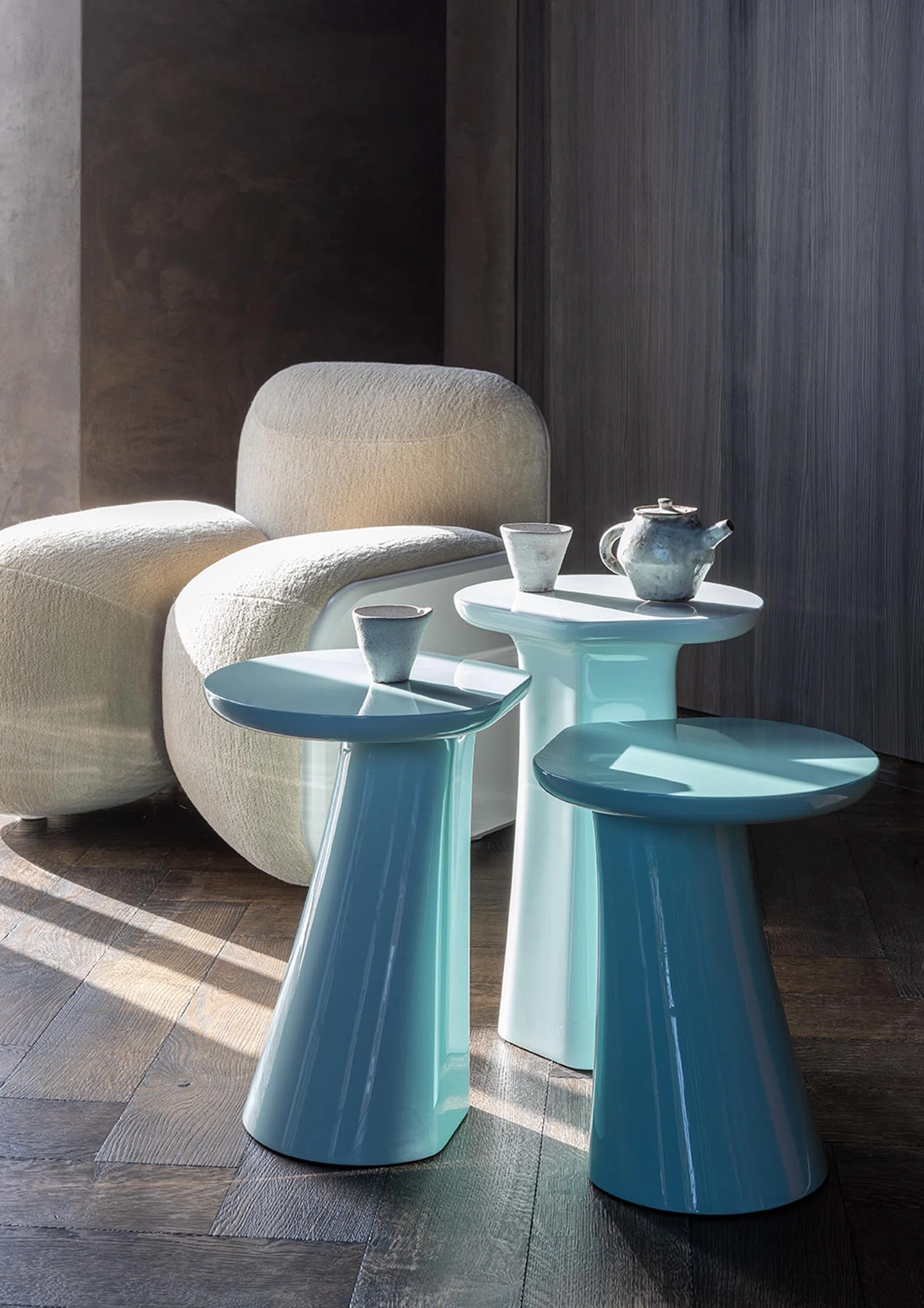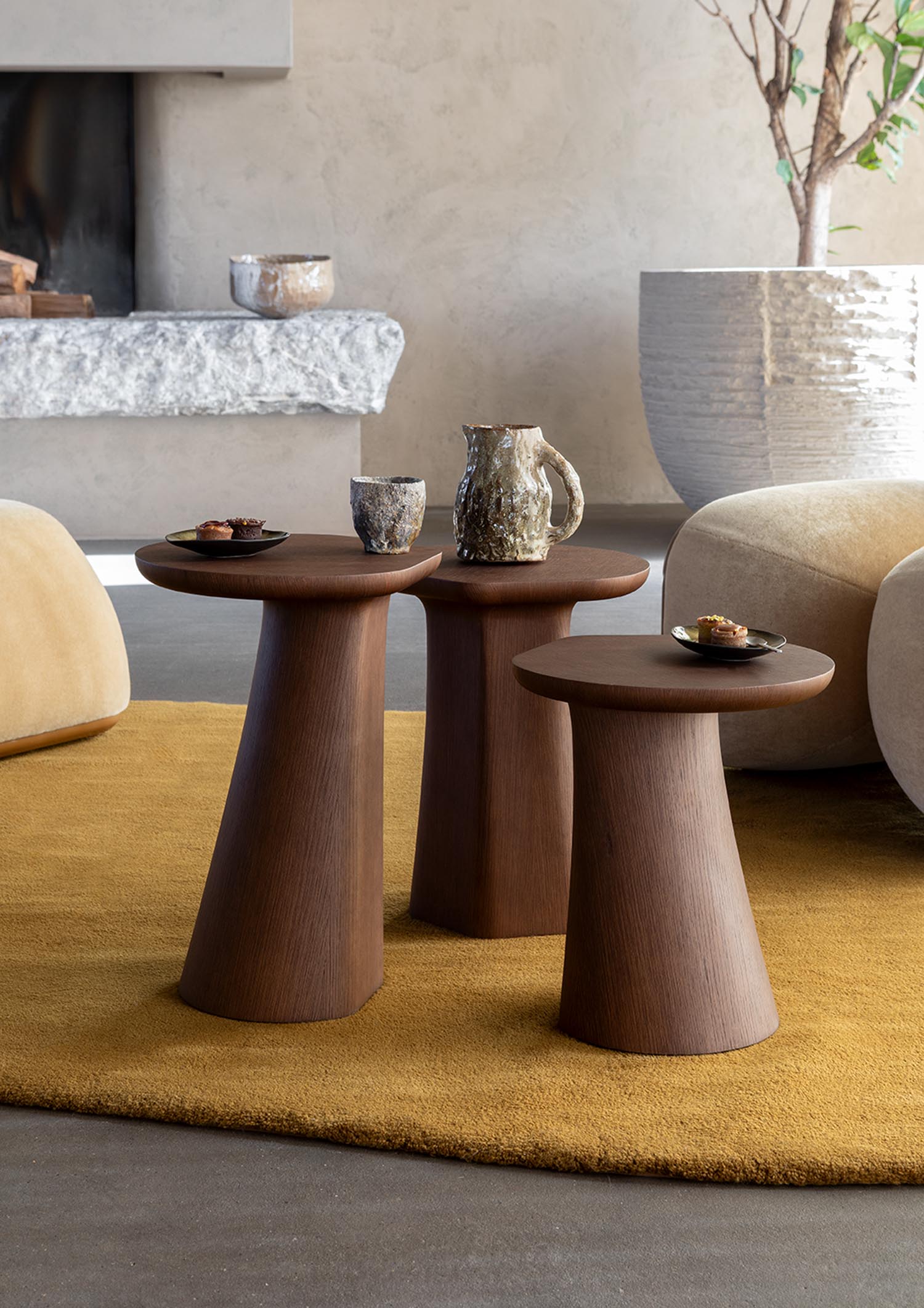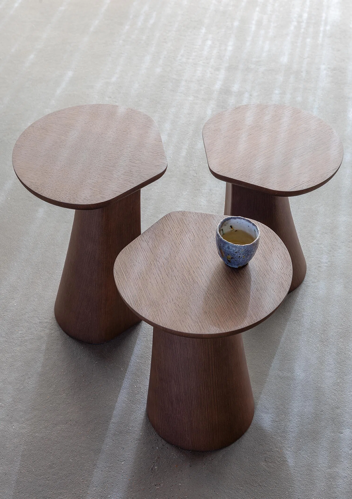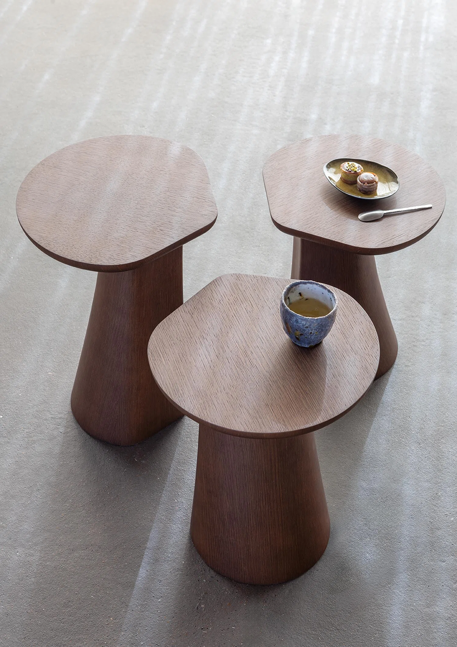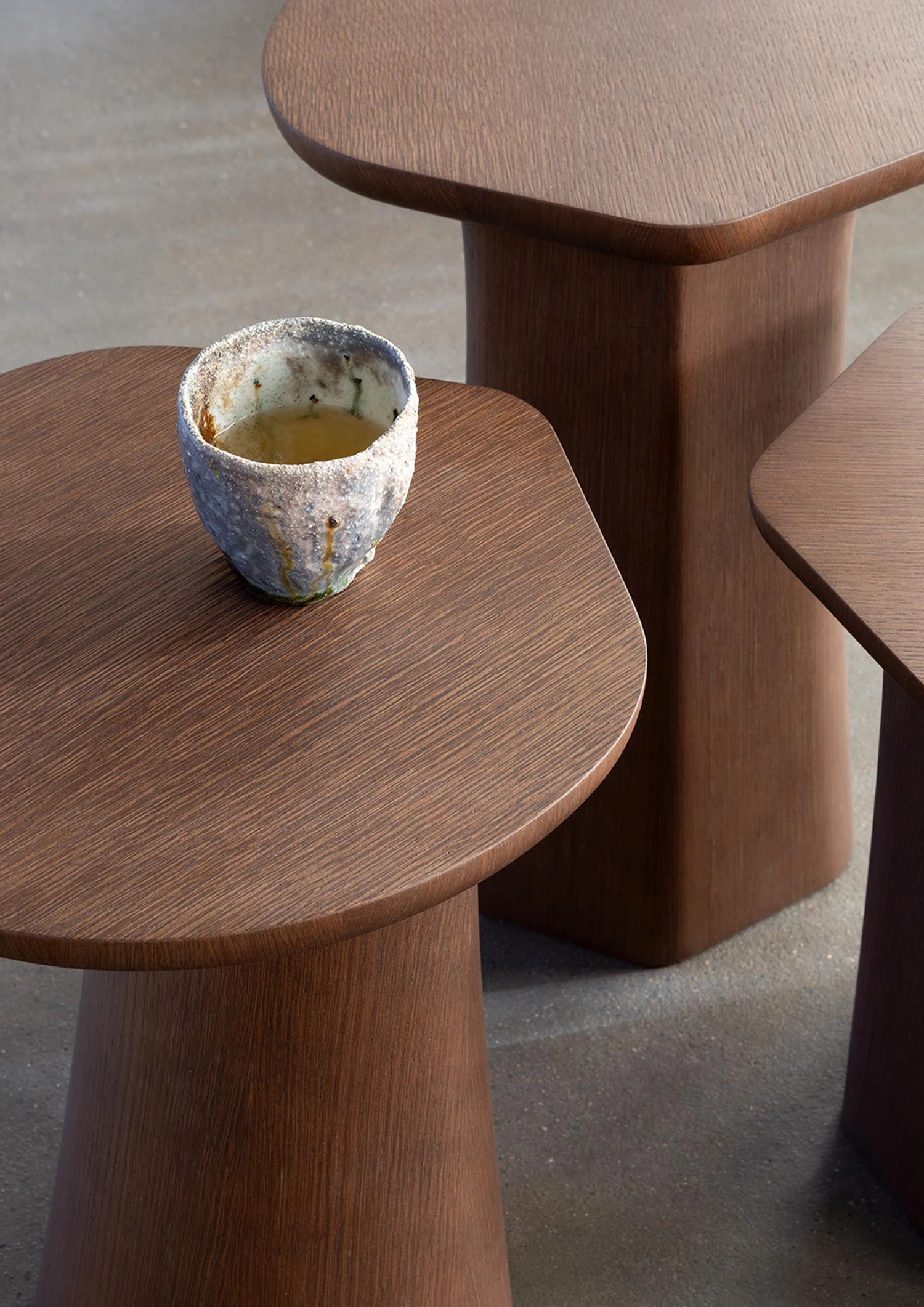 SHIFUMI, conceived by RDAI, explores a subtle balance between structure and movement. It is a collection of tables designed as a cohesive whole, where the precision of the lines engages in dialogue with a freer, almost organic form. Each tabletop suggests a petal. A simple, legible shape that repeats and echoes, gradually composing a landscape. Play is at the heart of SHIFUMI. Available in three heights, the tables come together instinctively. They draw close, overlap, or drift apart, forming ever-changing compositions. Whether grouped as a central cluster or placed as accents, they adapt effortlessly to both space and use. The design’s apparent lightness rests on a true feat of balance. The cantilever, precisely mastered, gives the tops a sense of suspension while maintaining perfect stability. The structure recedes, allowing the form to take center stage. The finishes extend this language. Oak veneers in deep tones or colored lacquers, whether matte, satin, or gloss, accentuate the contours and define the character of each composition.