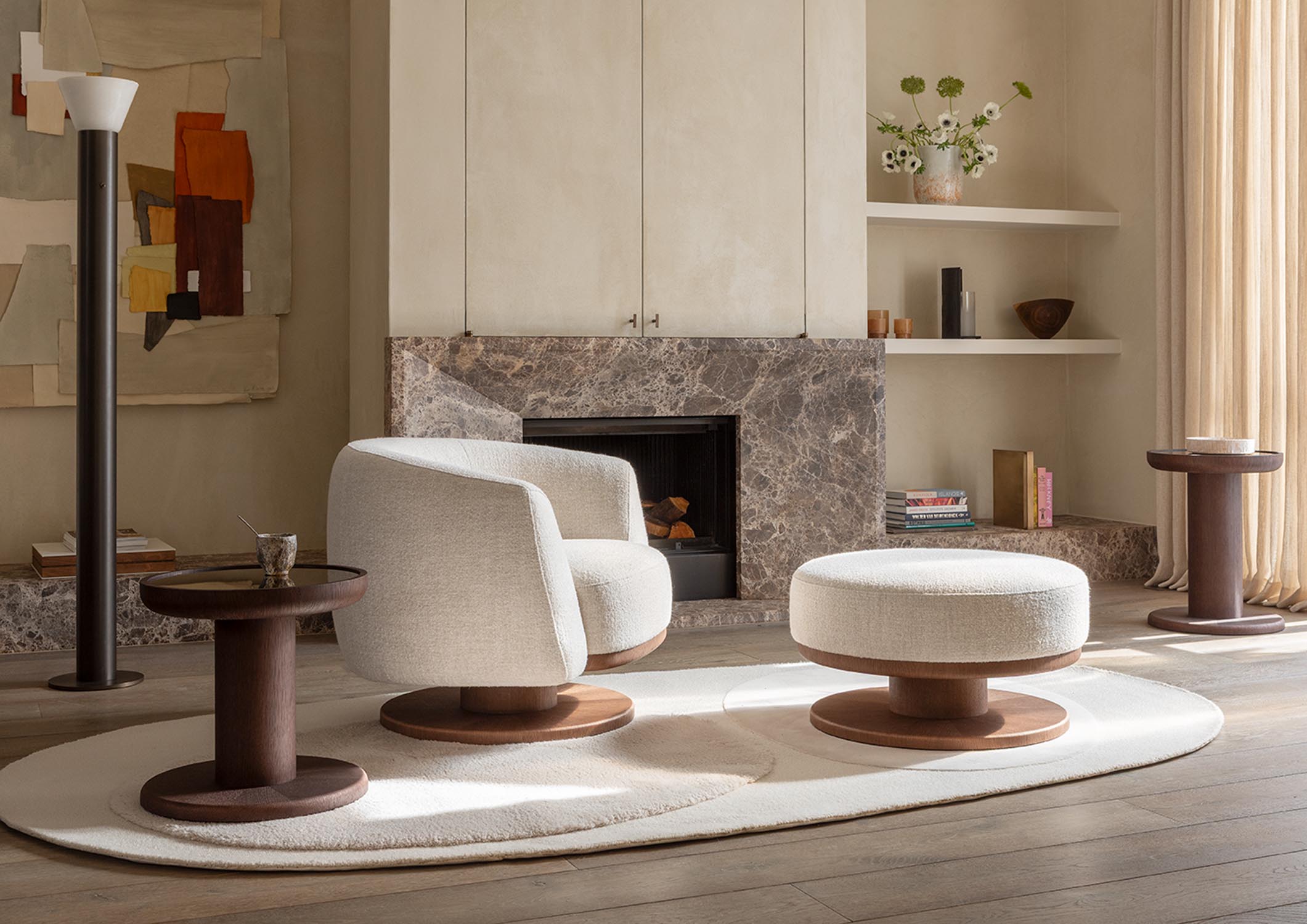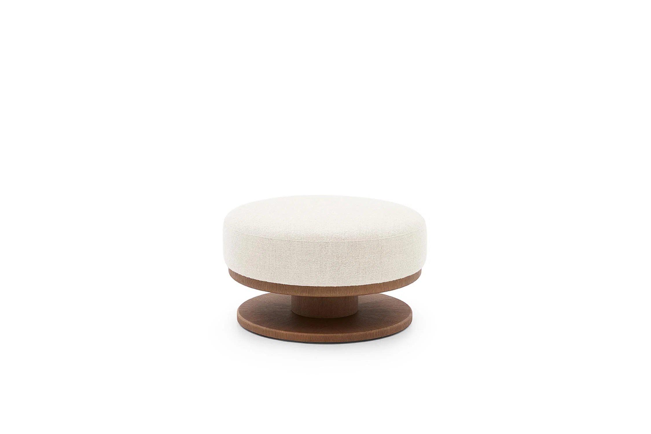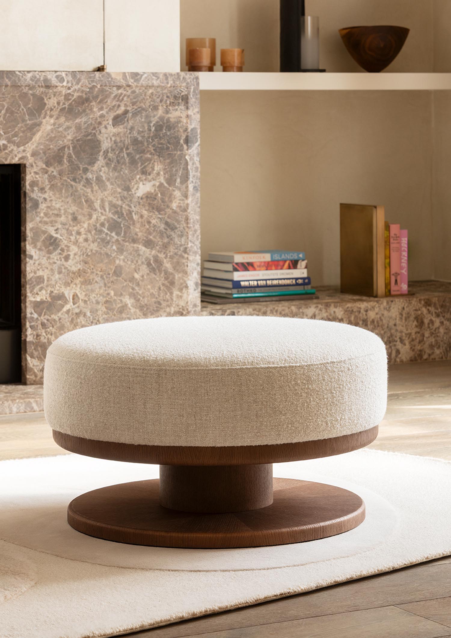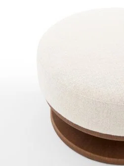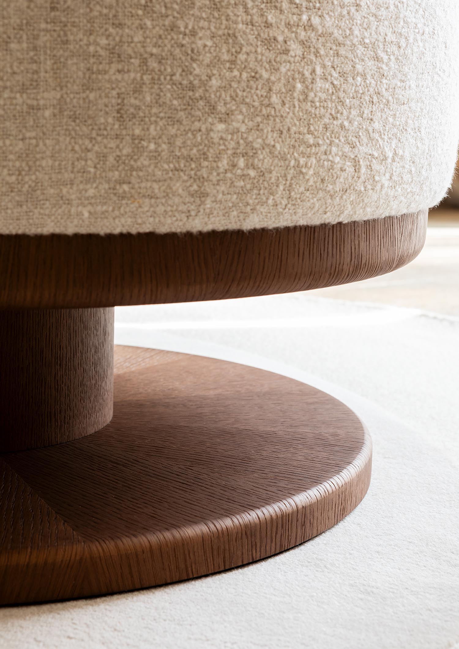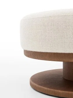 VESTA, designed by Garnier & Linker, is conceived as a cohesive ensemble, where each piece responds to the next in a balanced dialogue of forms and proportions. Bridge, armchair, pouf and pedestal tables share a common language: full, rounded volumes supported by a central wooden base, a structural and expressive signature. Its name refers to Vesta, the Roman goddess of the hearth; a quiet presence associated with intimacy, warmth and a sense of grounding. Everything begins with this central base. A singular element, crafted in wood as a living material, capable of carrying the entire design. From this initial intuition, the armchair emerged, followed naturally by the expansion of the line: seating elements find their balance, while occasional tables extend the gesture, in a subtle interplay of correspondences and controlled tensions. Wood plays a defining role in VESTA’s richness. Curved veneers, requiring extreme precision, reflect a savoir-faire where technical complexity serves the softness of the lines and the durability of the forms. In contrast, the upholstered surfaces wrap the volumes, enhancing their generosity and extending this dialogue between structure and sensation. The occasional tables introduce a freer dimension. Their artistic lacquer inserts bring a pictorial quality and offer a wide scope for personalization, allowing each piece to integrate seamlessly into distinct interiors.