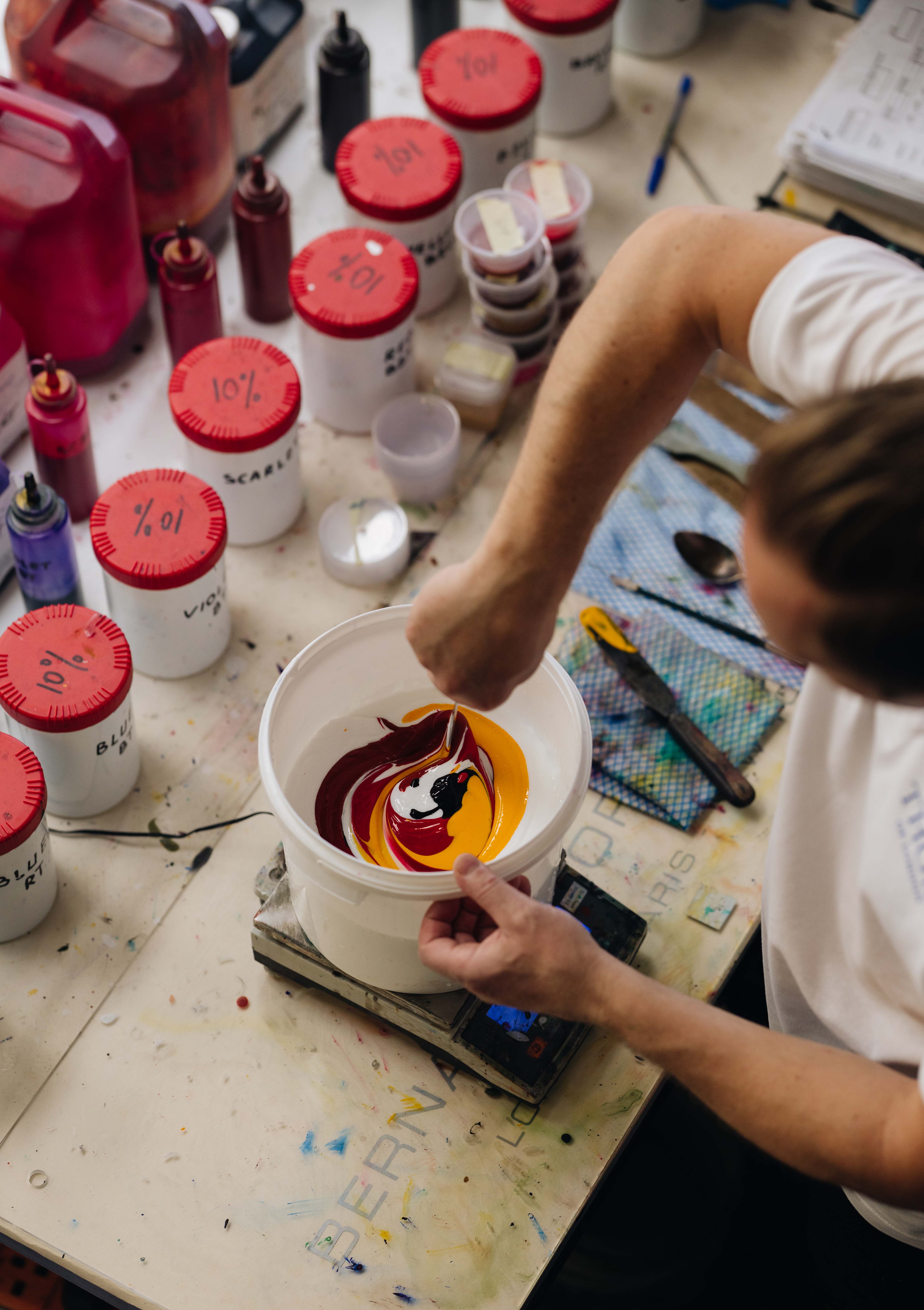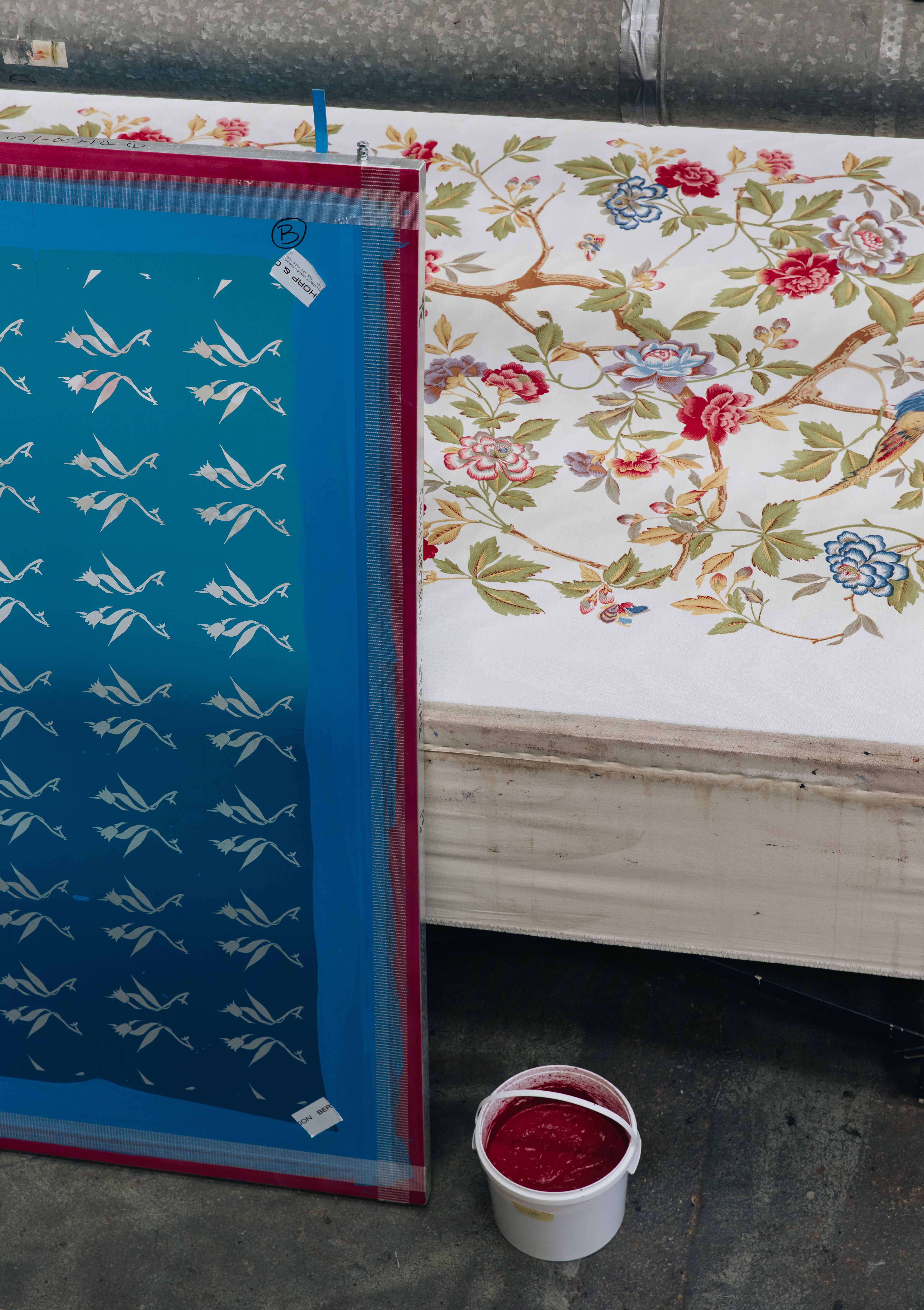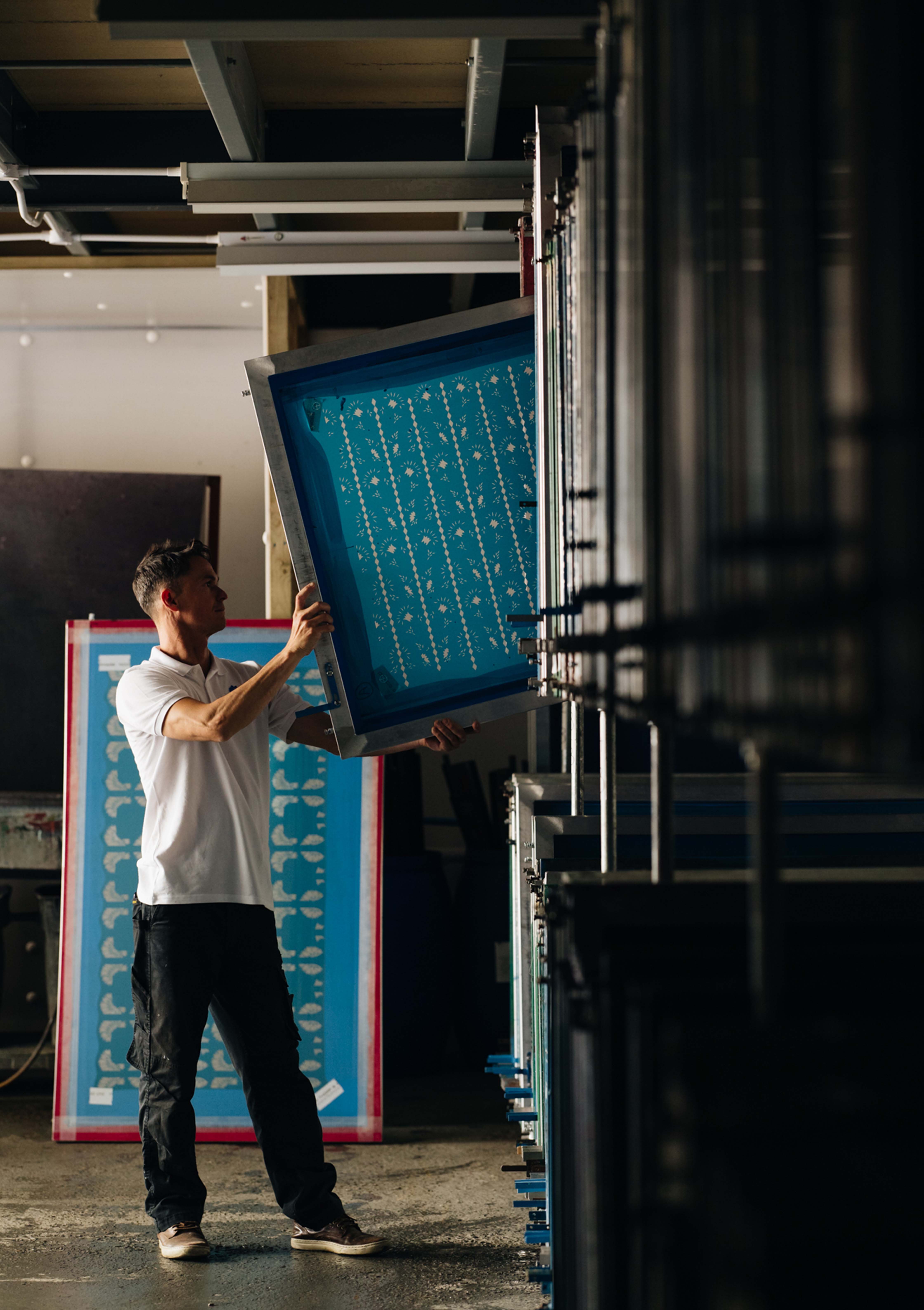 For Marcello, Nicole and Jordan, each color application and precise action is a form of dialogue with the material. Every ground has its own character and sensitivity. Every color is assigned a screen, used like a stencil that constructs the design. Each pattern is assigned a squeegee, a tool that is soft or hard which allows the paint to be drawn across the frame. The angle and pressure used in pulling the squeegee plays a crucial role in capturing the detail and quality of the print.