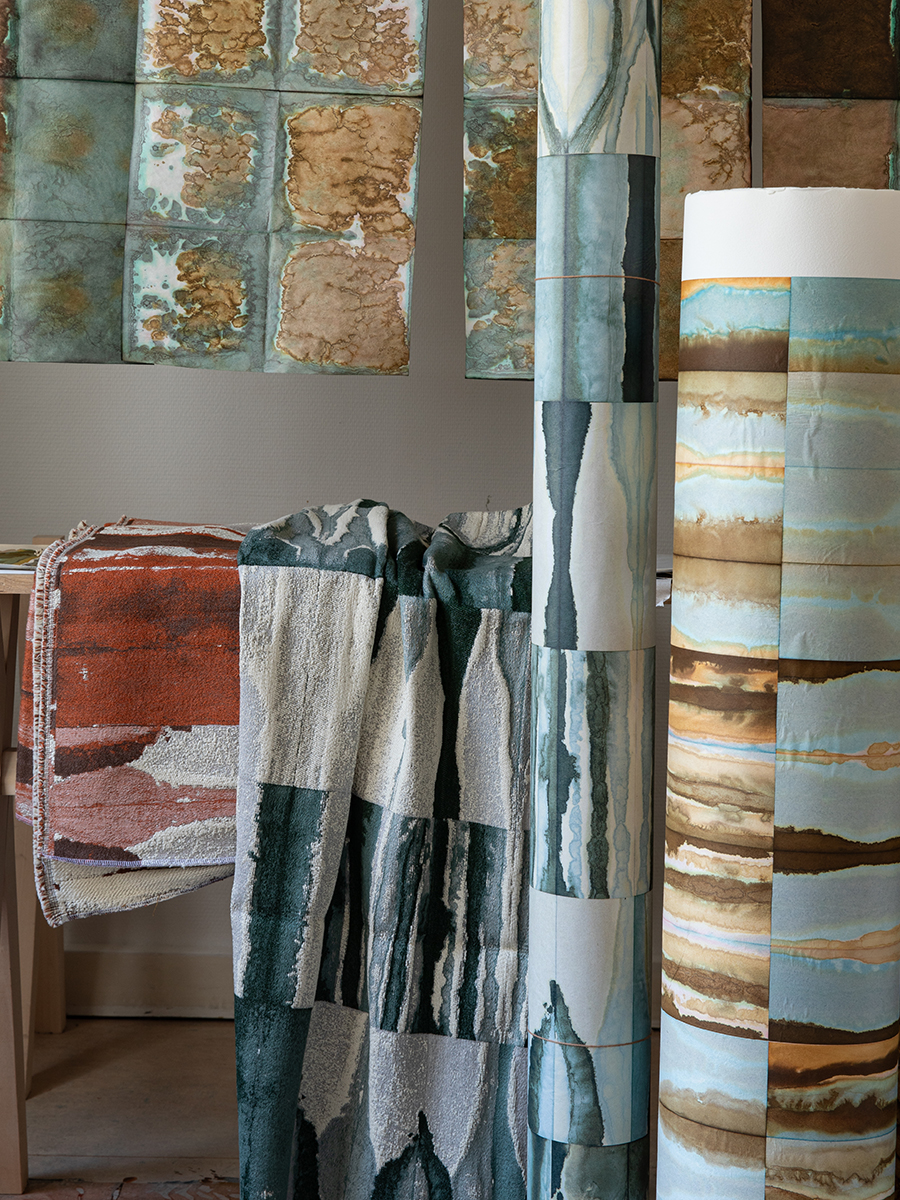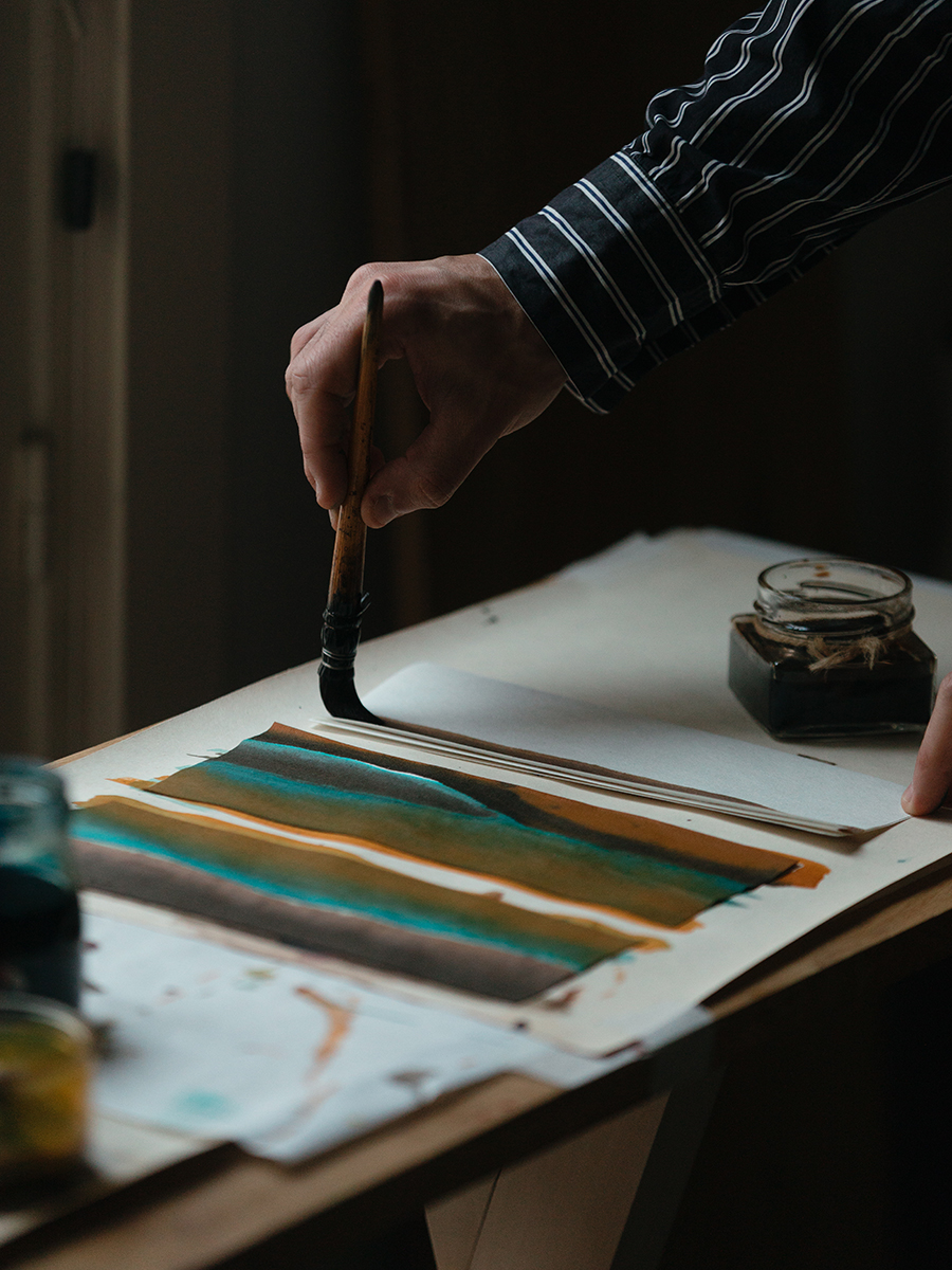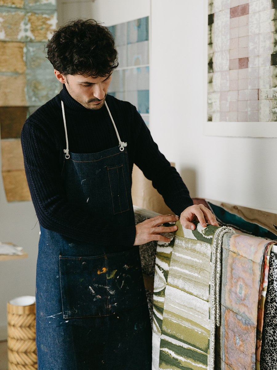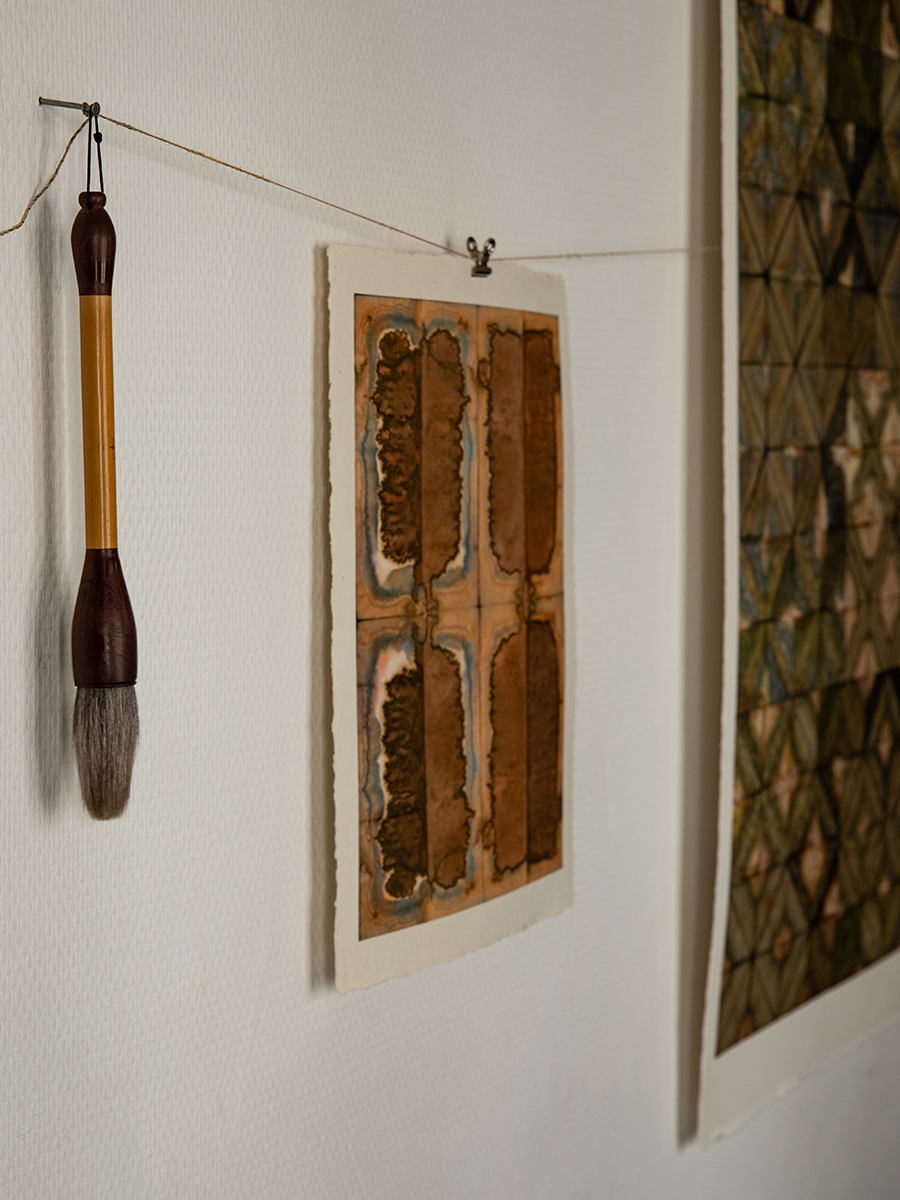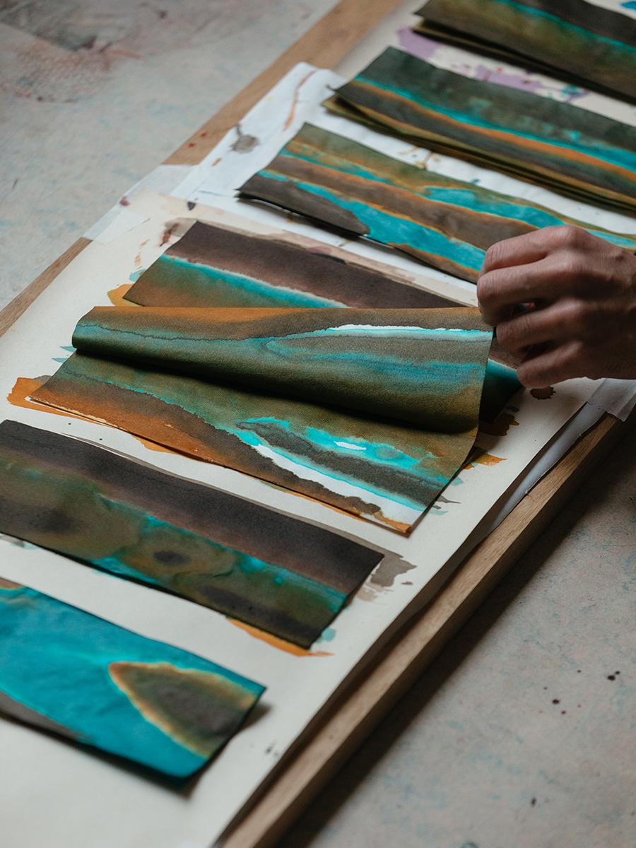 His creative process revolves around travel diaries, popular archives and traditional Japanese techniques, in particular shibori, a resist-dyeing method that Adrien Testard reinterprets on paper.