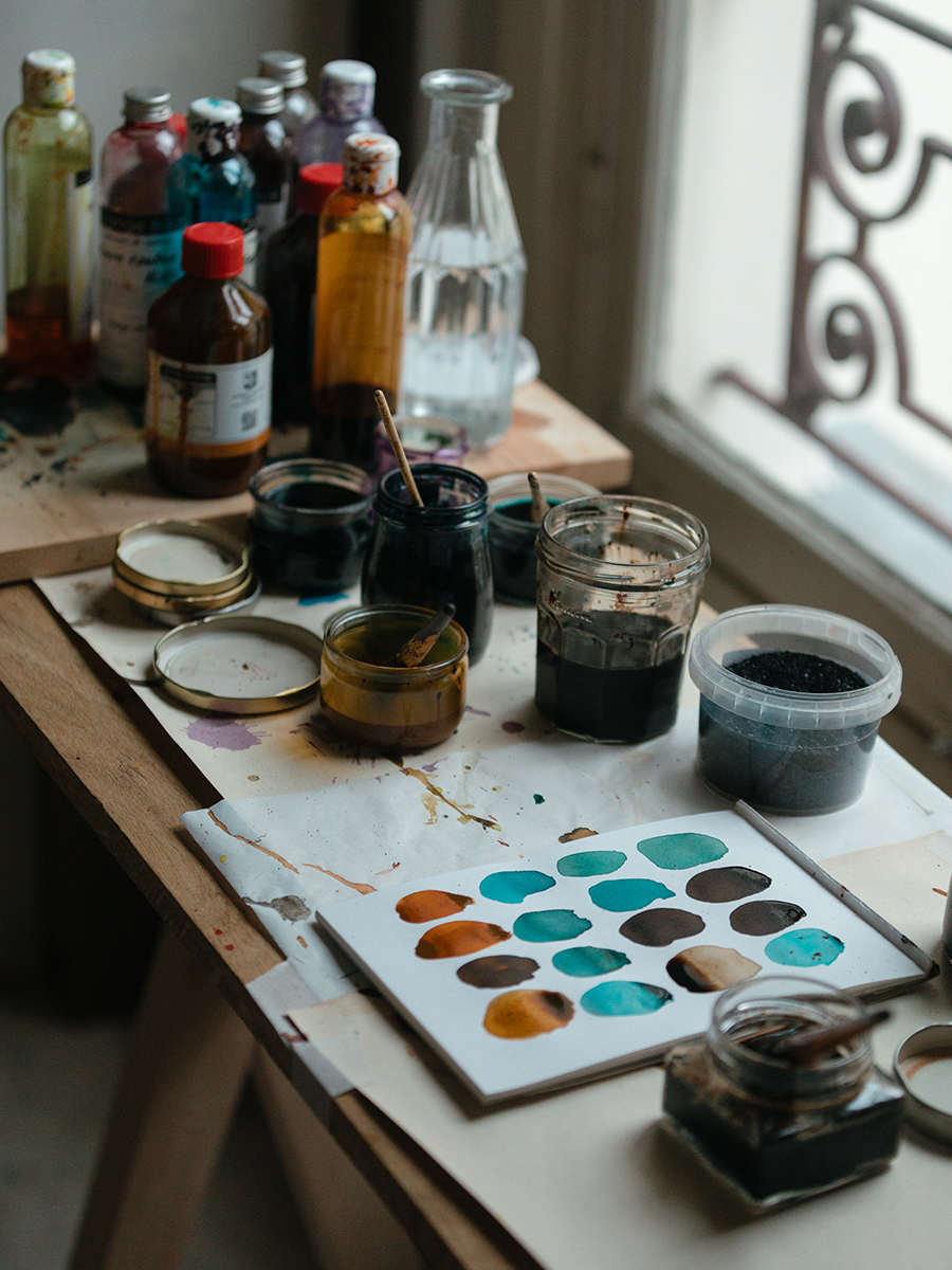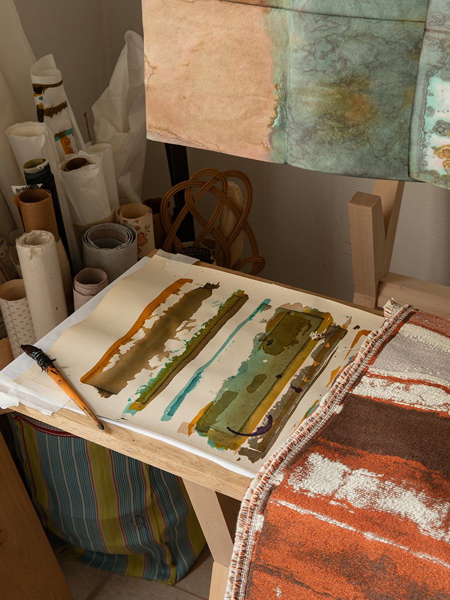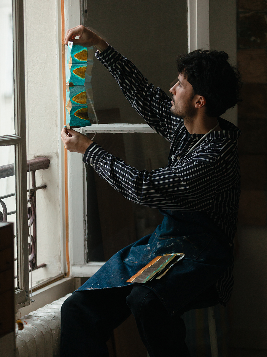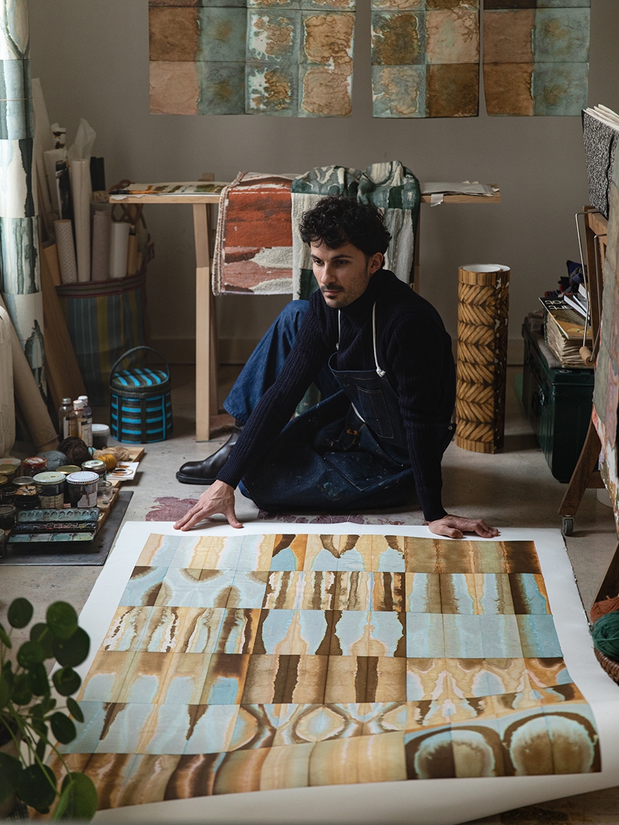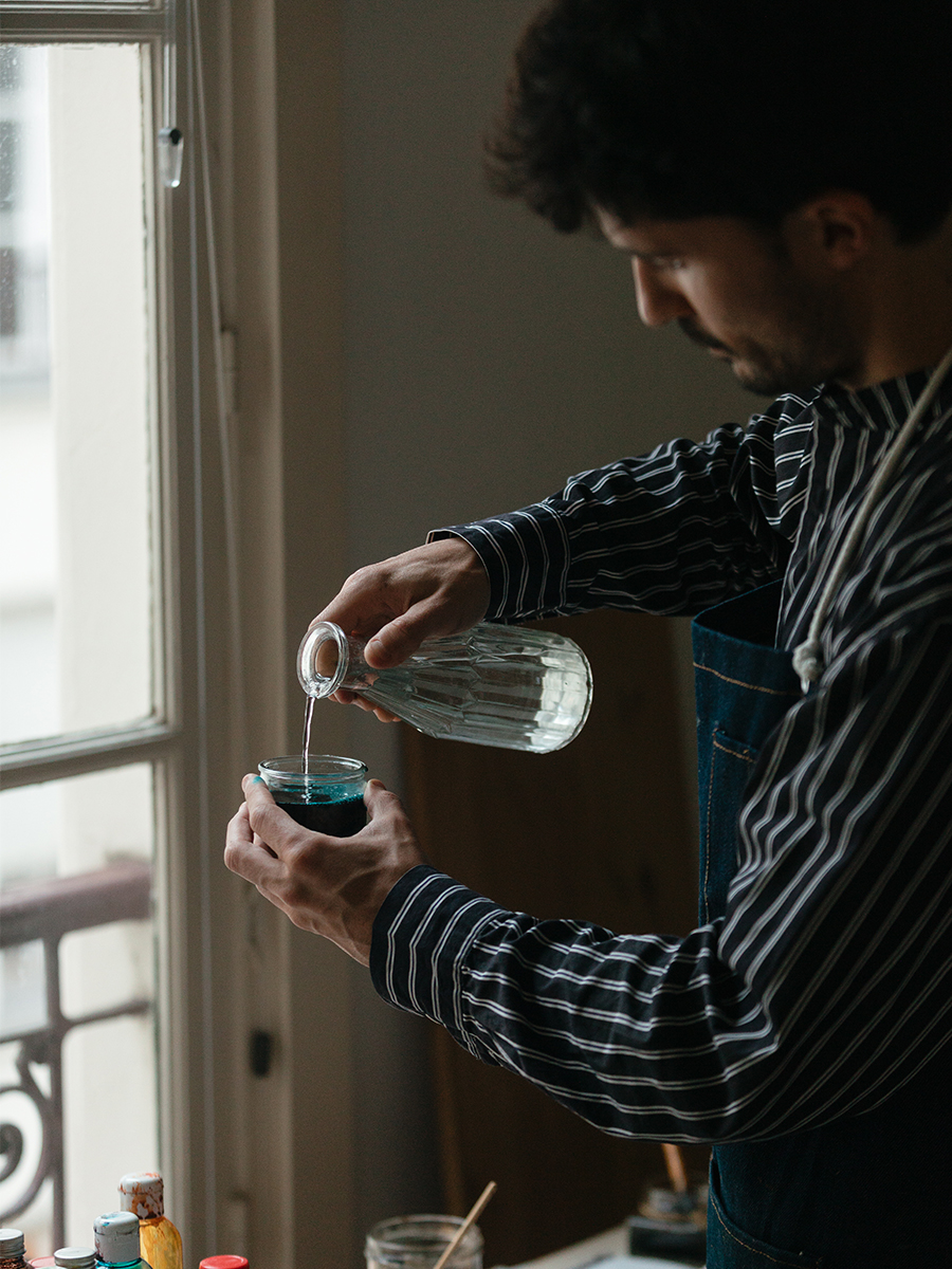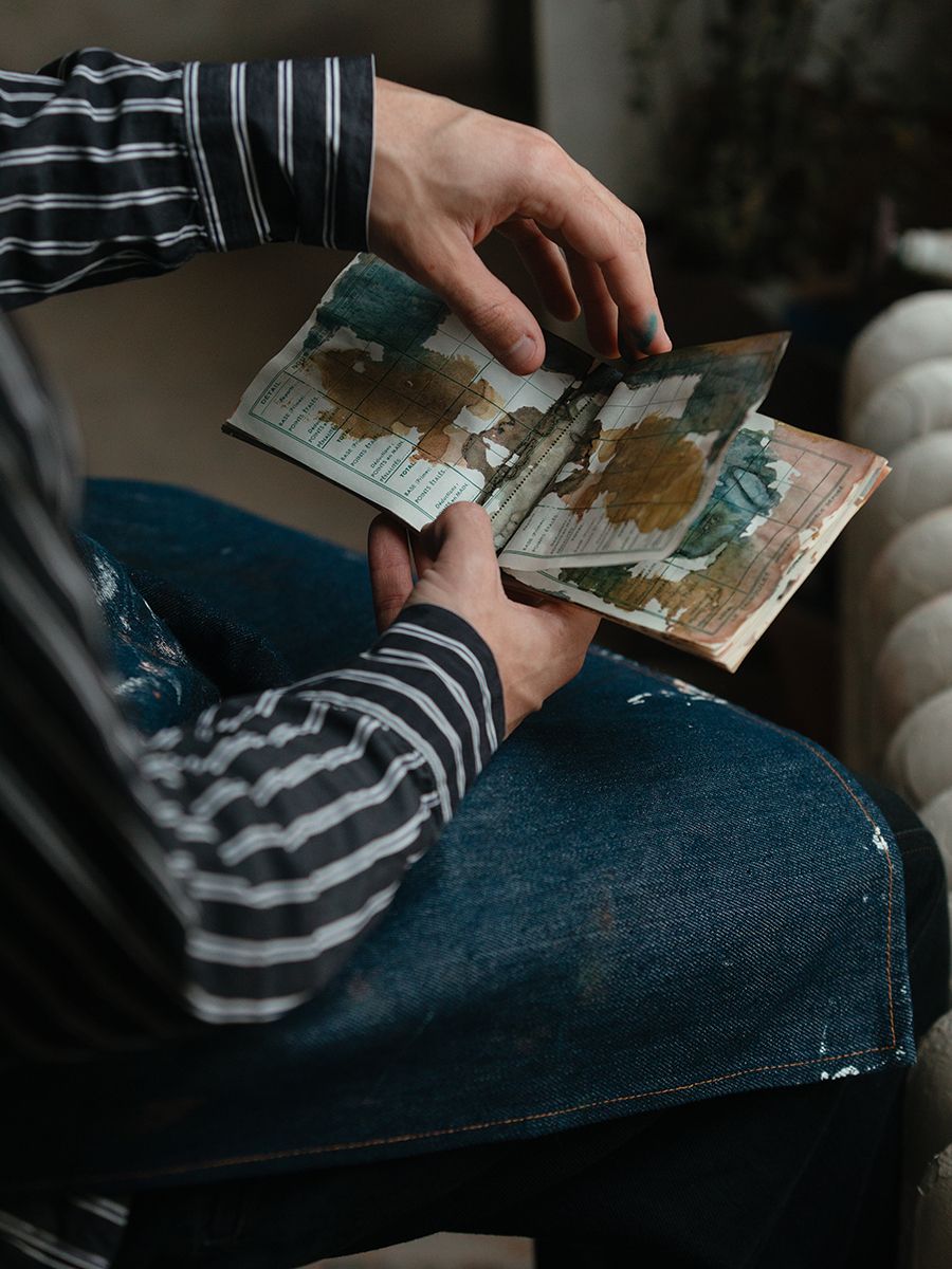His creative process revolves around travel diaries, popular archives and traditional Japanese techniques, in particular shibori, a resist-dyeing method that Adrien Testard reinterprets on paper.