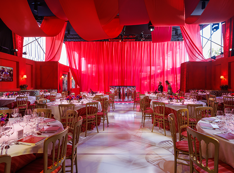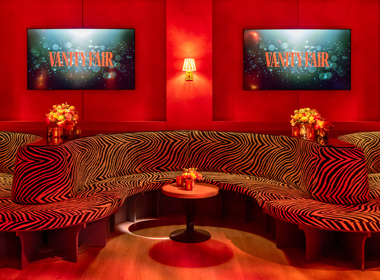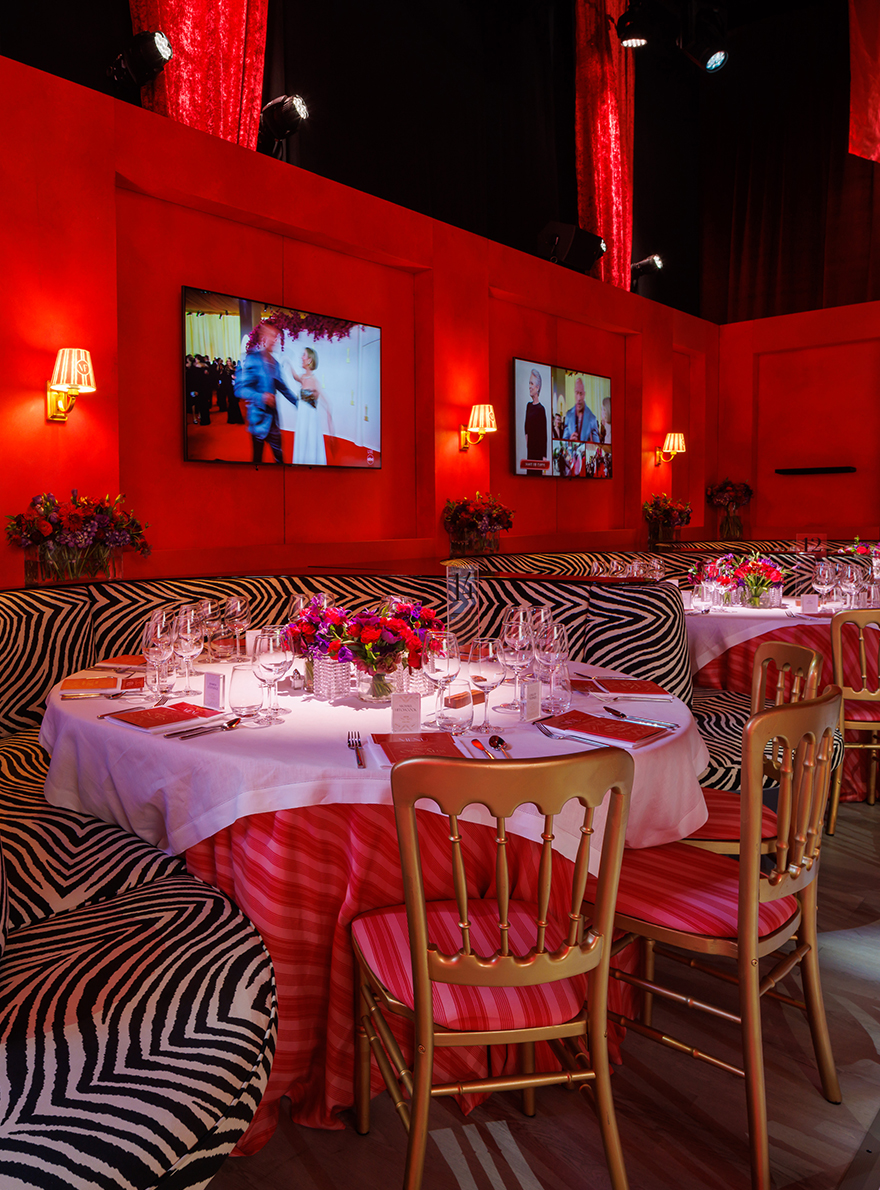 For the 30th edition of the Oscars after party organised by Vanity Fair magazine, the design duo Basil Walter and Will Cooper opted for a bold decor inspired by Hollywood institutions such as the Formosa Cafe and the Cocoanut Grove, as well as the El Morocco club in Manhattan, a favourite haunt of celebrities in the 1930s, whose emblematic blue zebra pattern was reimagined in a bespoke version by Maison Pierre Frey to adorn the curves of the banquettes in the reception room.