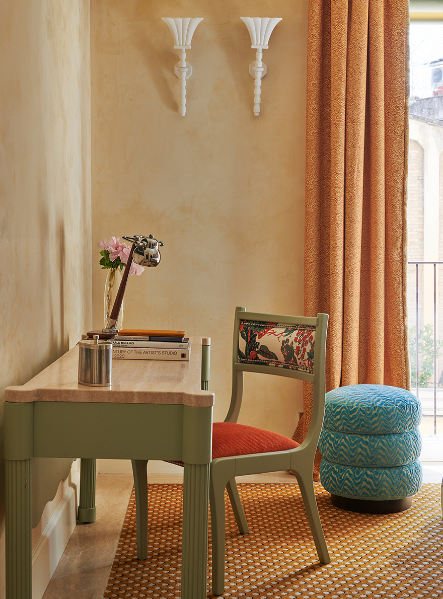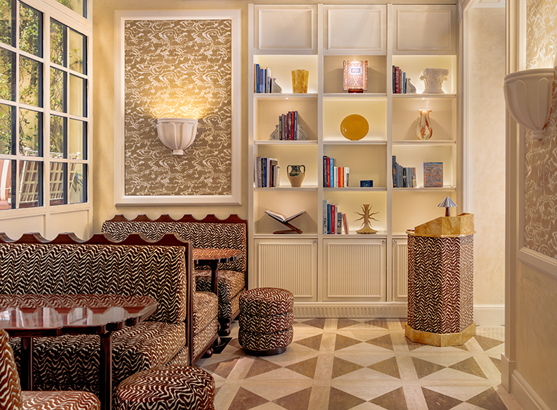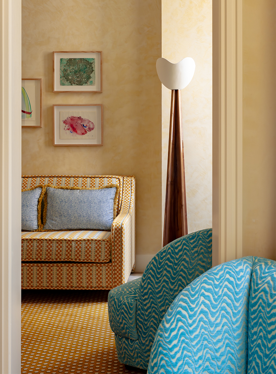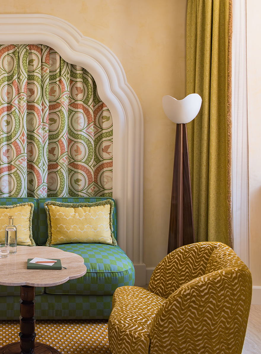 On the ground floor, the hotel's restaurant captivates with its harmonious blend of motifs: the seats in the reception room are adorned with the MALMAISON stripe and the POMMES DE PIN print, the emblematic signature of Maison Le Manach. The tour continues in the corridors leading to the bedrooms, covered in Fadini Borghi's SCIPIONE carpet, whose lush garden motif has been specially revisited in cheerful, acidic shades. In the bedrooms, the expertise of Maison Le Manach is once again expressed through the use of the PLUMETTES print combined with the Toiles de Tours ALESIA, KENYA and POINT DE TOURS, which combine to create a refined atmosphere. On the floor, the CABOCHONS carpet by Pierre Frey evokes the golden glow of the Italian sun and adds a geometric touch that structures each space.