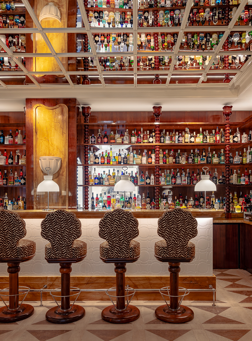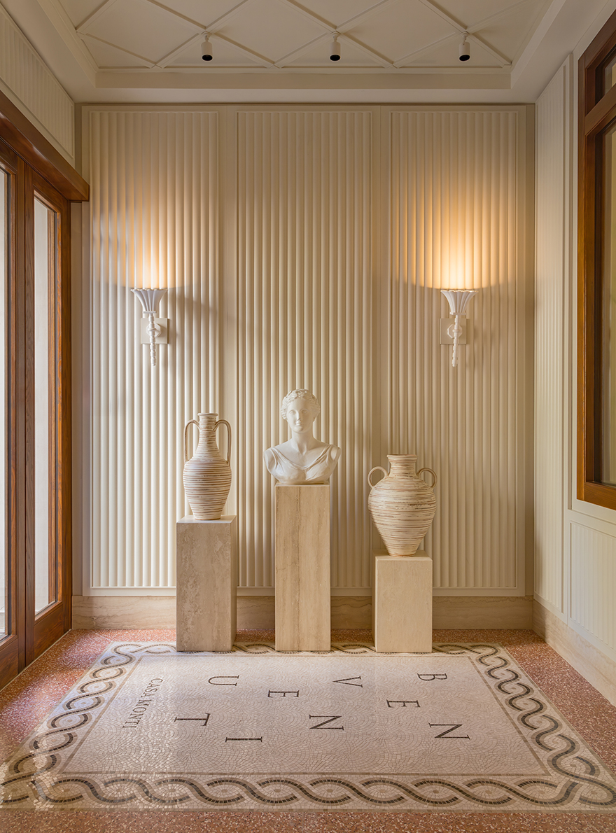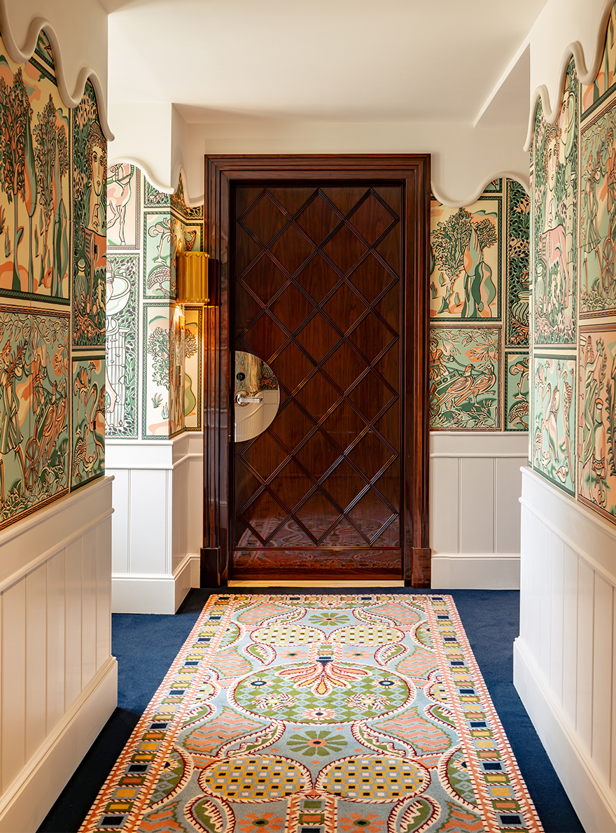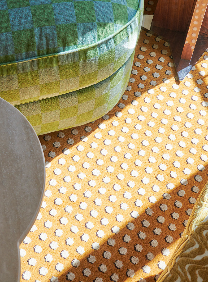 On the ground floor, the hotel's restaurant captivates with its harmonious blend of motifs: the seats in the reception room are adorned with the MALMAISON stripe and the POMMES DE PIN print, the emblematic signature of Maison Le Manach. The tour continues in the corridors leading to the bedrooms, covered in Fadini Borghi's SCIPIONE carpet, whose lush garden motif has been specially revisited in cheerful, acidic shades. In the bedrooms, the expertise of Maison Le Manach is once again expressed through the use of the PLUMETTES print combined with the Toiles de Tours ALESIA, KENYA and POINT DE TOURS, which combine to create a refined atmosphere. On the floor, the CABOCHONS carpet by Pierre Frey evokes the golden glow of the Italian sun and adds a geometric touch that structures each space.