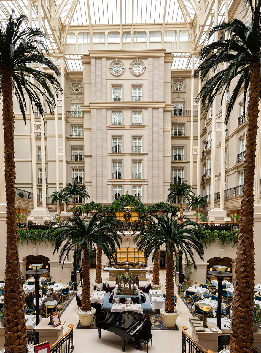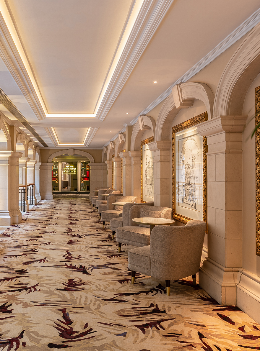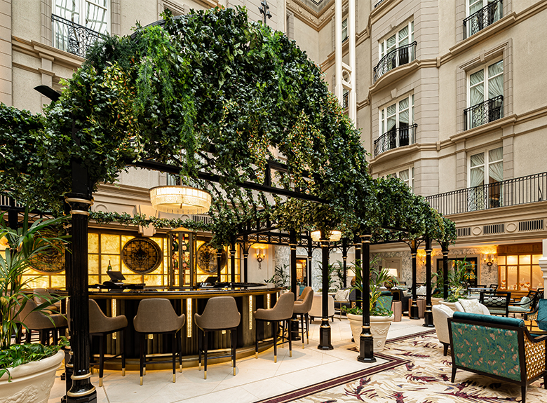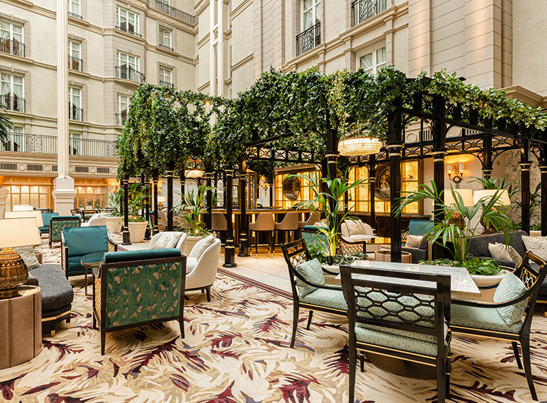 Inspired by majestic glasshouses such as the palm grove at Kew Gardens and the orangery at Syon Park, the winter garden offers one of the largest atriums in Europe. The sophisticated, relaxing ambience of the space is enhanced by the choice of a range of colors combining blue, green and gold, directly inspired by the remarkable plumage of peacocks. The use of Braquenié's ZAO and Fadini Borghi's LOGGIA velvets on the hotel's various seating areas adds a contemporary touch to the decor and completes the harmony of this timeless setting.