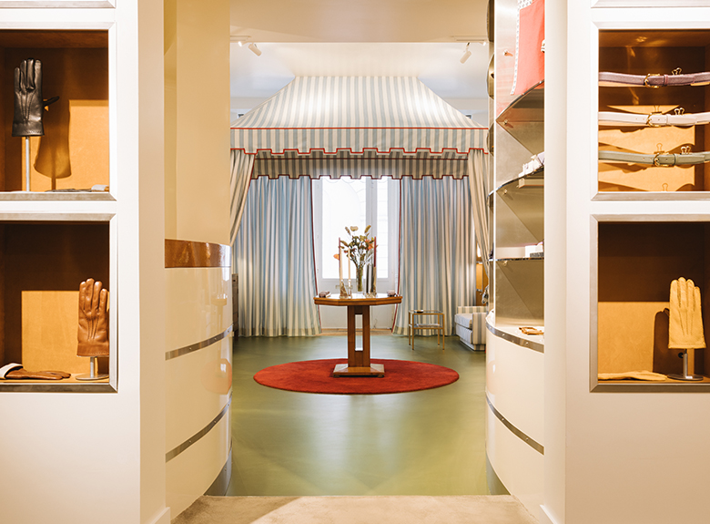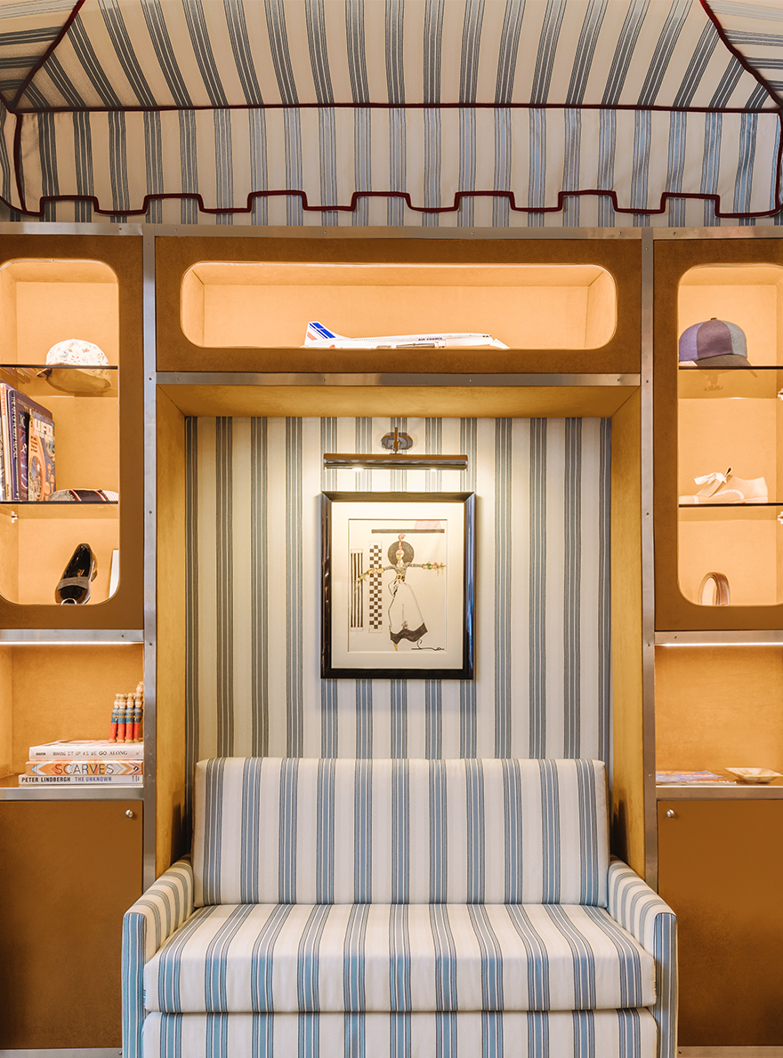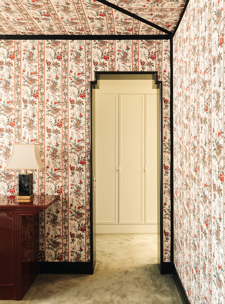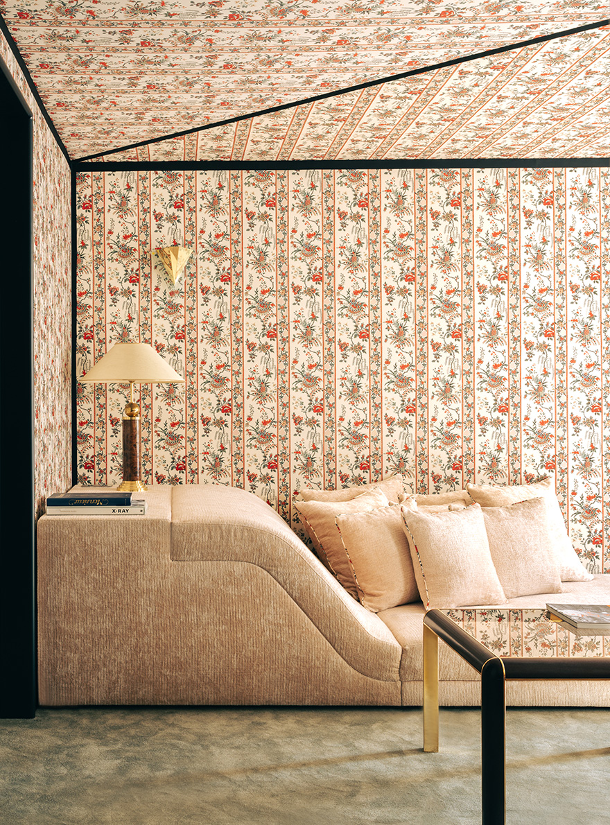 This four-floor hybrid space comprises a boutique, a design studio and two private suites. Designed by Necchi Architecture, the space has the feel of a quirky, bourgeois family home. Exclusively for the Cinabre Suites, Maison Pierre Frey has opened its archives and re-edited two 18th and 19th century prints: the first reproduces a polychrome toile de Jouy printed by Oberkampf around 1785, renamed REVERIES INDIENNES. The second, RAYURE MALMAISON, reproduces a model used in the entrance to the Château de Malmaison to evoke Napoleon Bonaparte's camp tent at the turn of the 19th century.