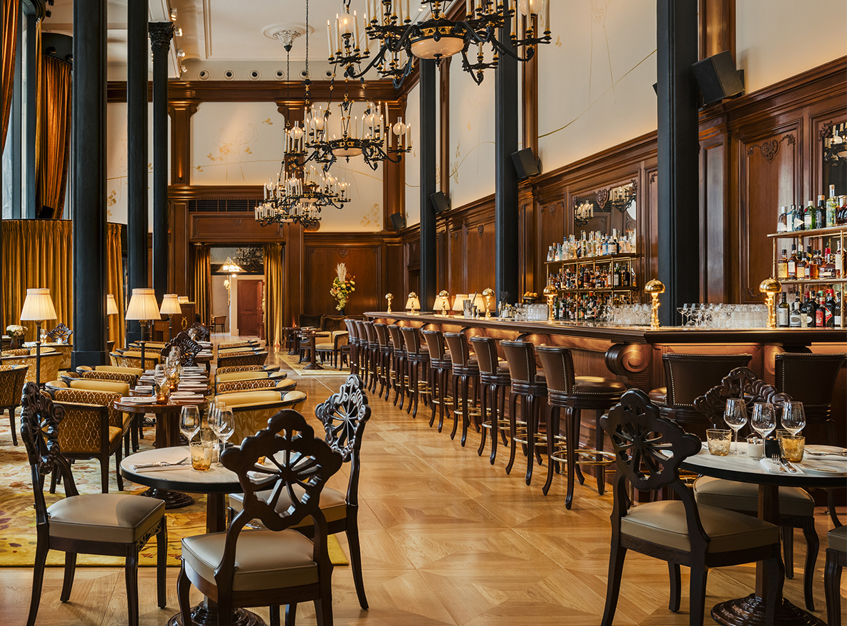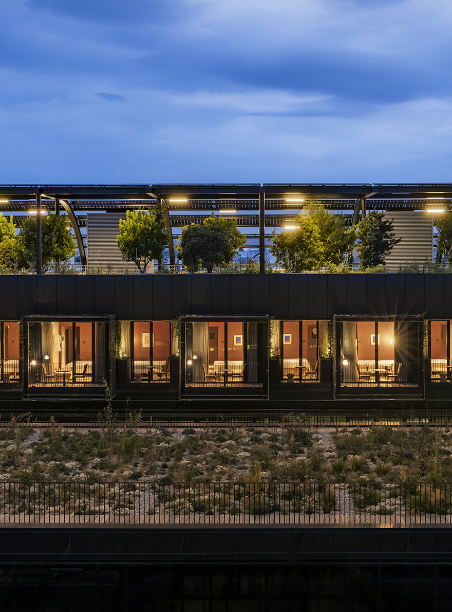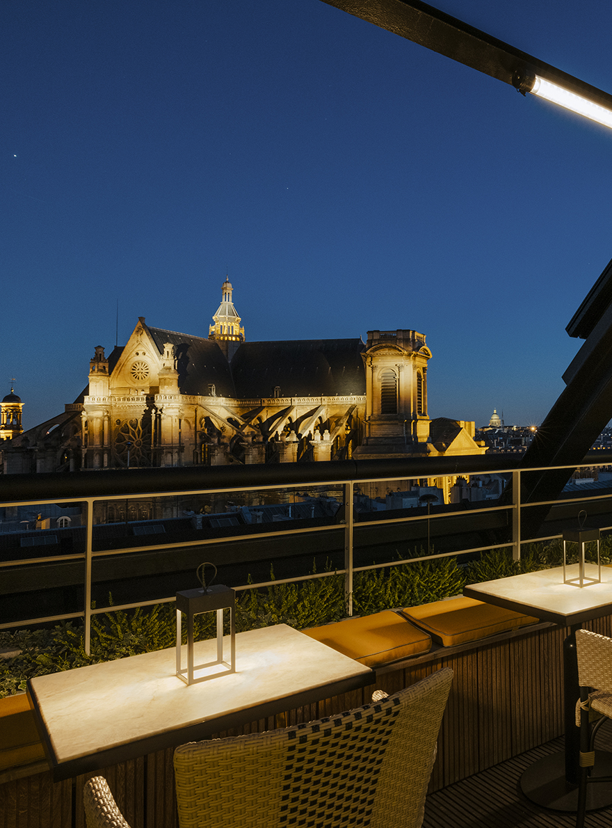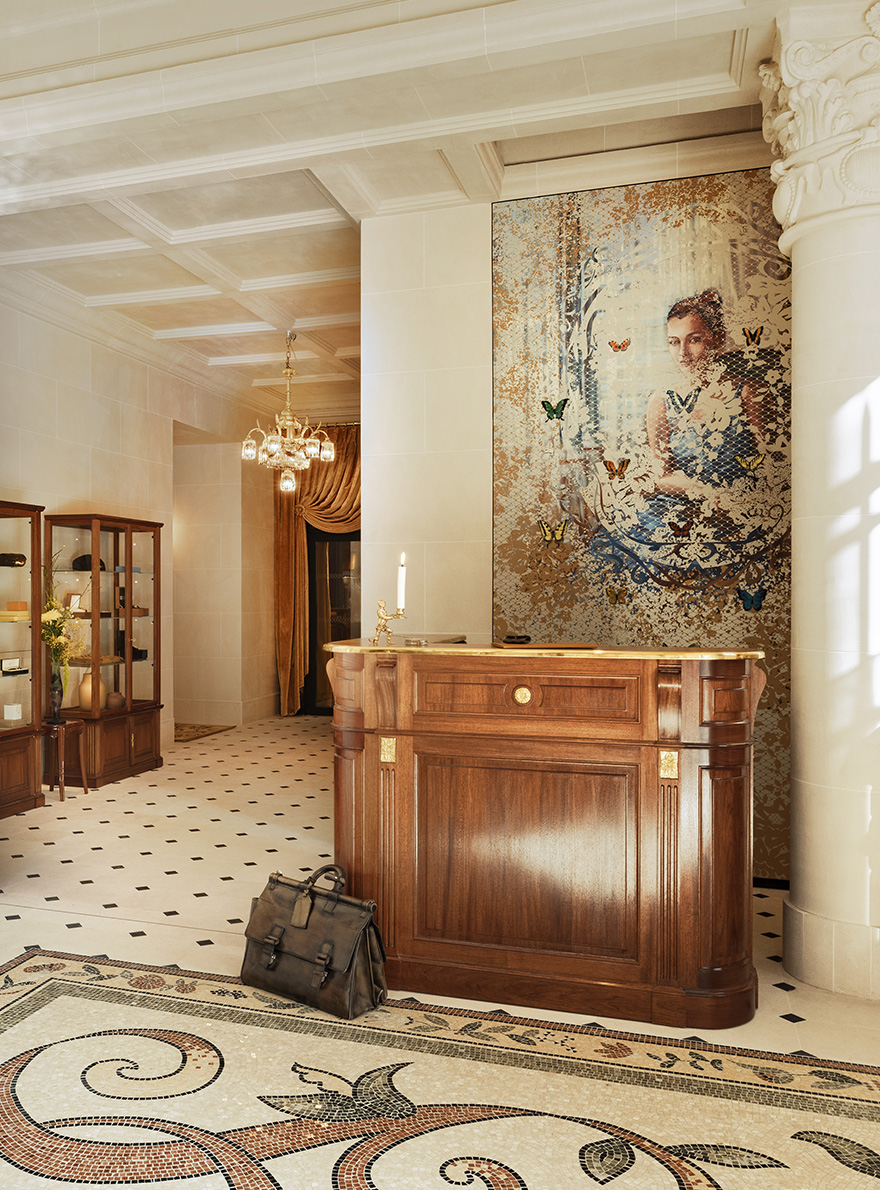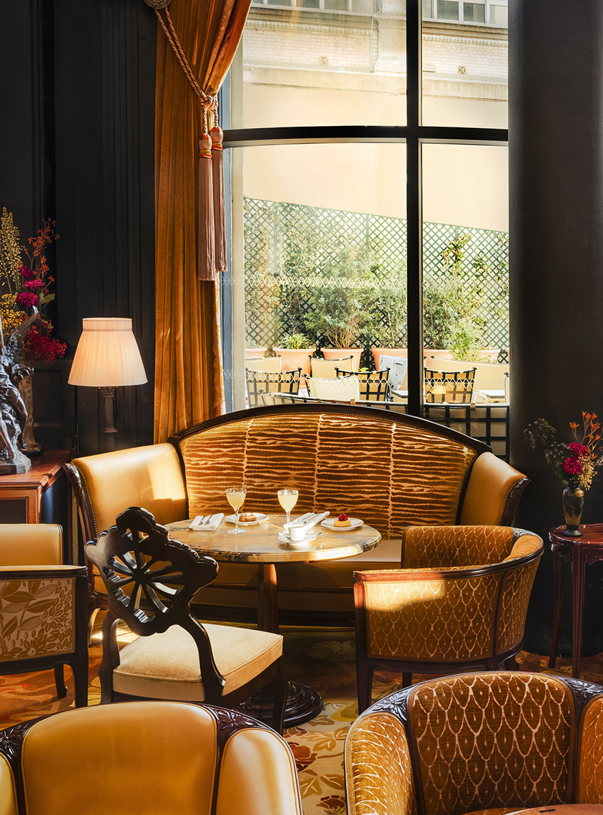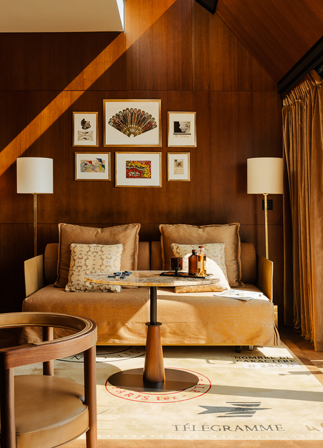 The decoration of the hotel designed by Laurent Taïeb, results from a clever mix of precious wood and honeyed marble with insets of the Toiles de Tours LABYRINTHE, OSAKA and HECTOR in mordorés shades. Also selected for its expertise in custom creations, the production of the furniture was entrusted to the Pierre Frey workshops. Like an open-air museum, Madame Rêve is a green setting that opens its doors to the city of light.