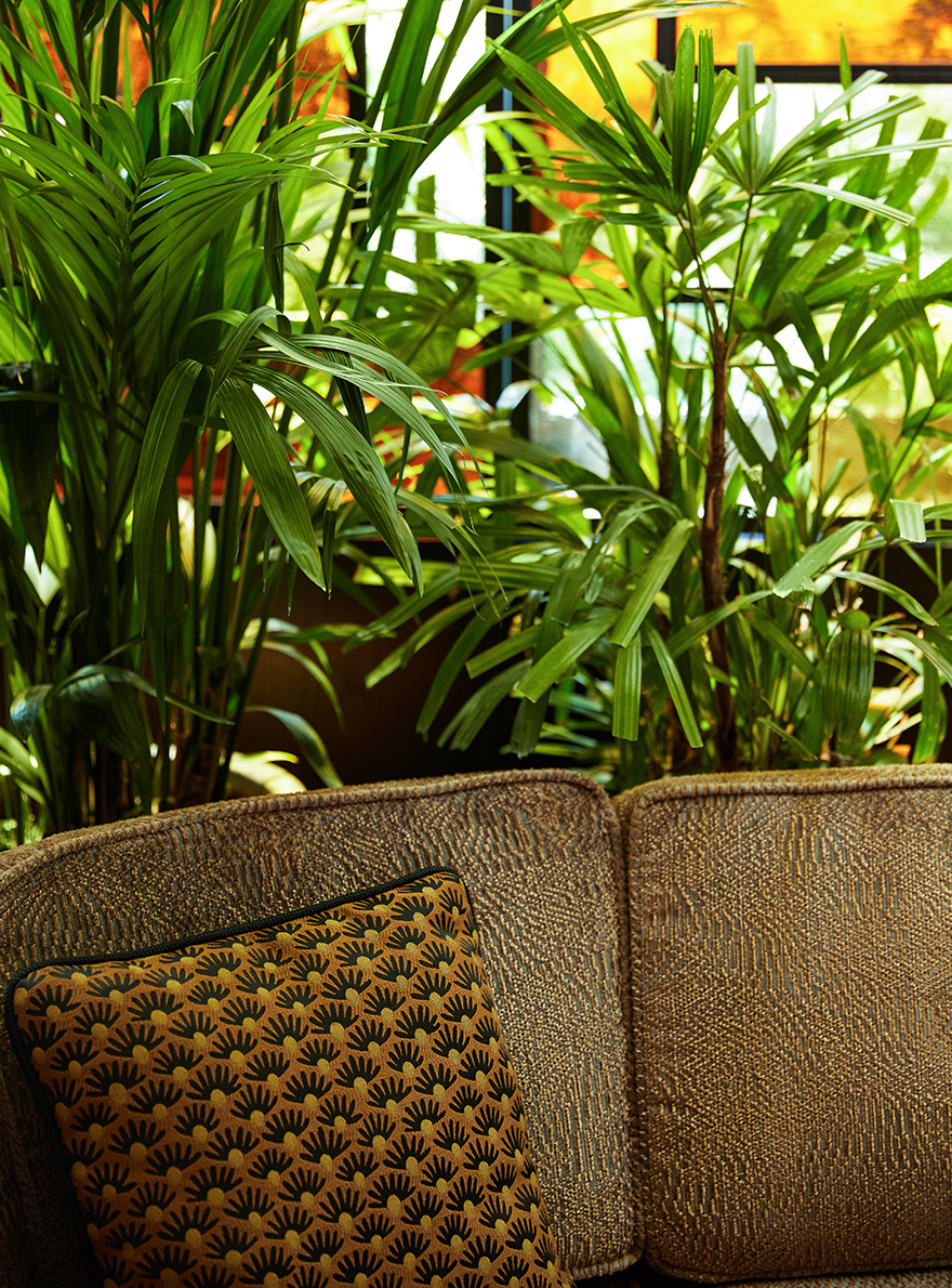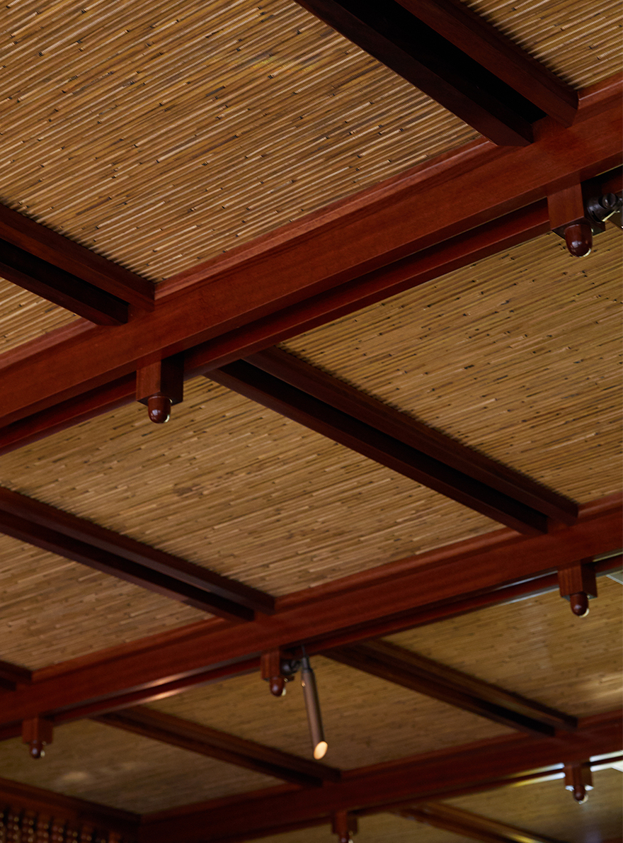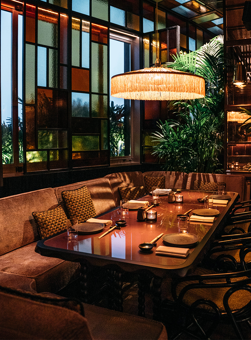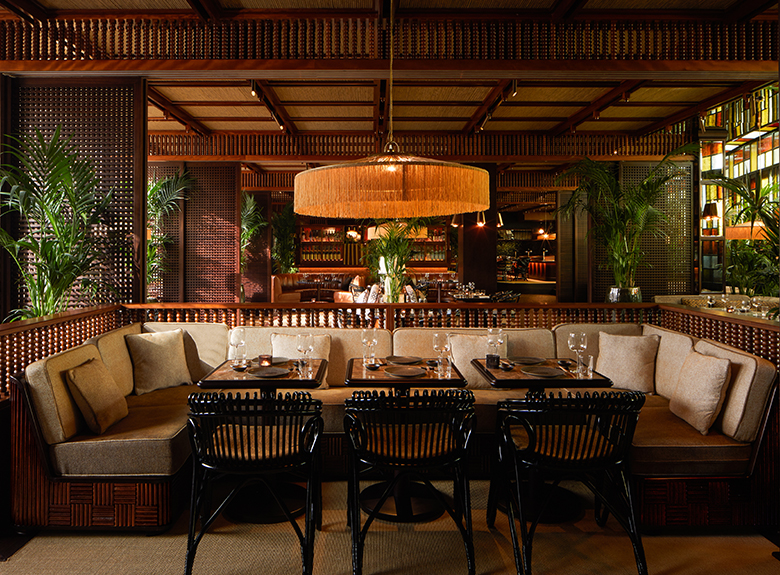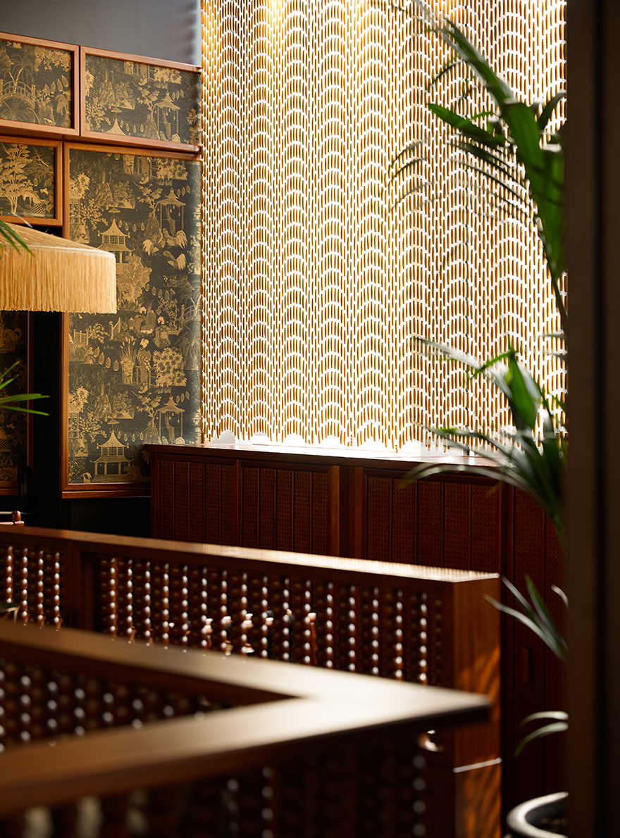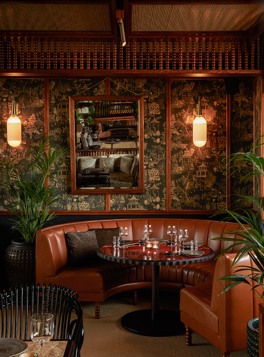 Named after the hair trend worn by young Japanese "Moga" women in the 1920s, Mimi Kakushi restaurant, designed by London studio Pirajean Lees, offers a sophisticated setting blending traditional architectural elements with exotic touches, using Pierre Frey ERIDAN and OGAKI wallpapers to punctuate the restaurant's walls and ceiling.