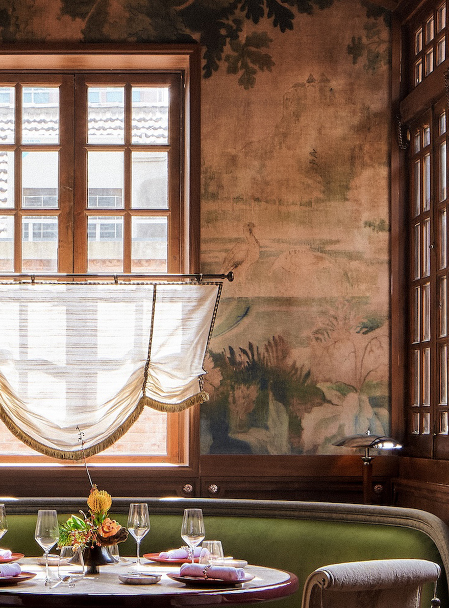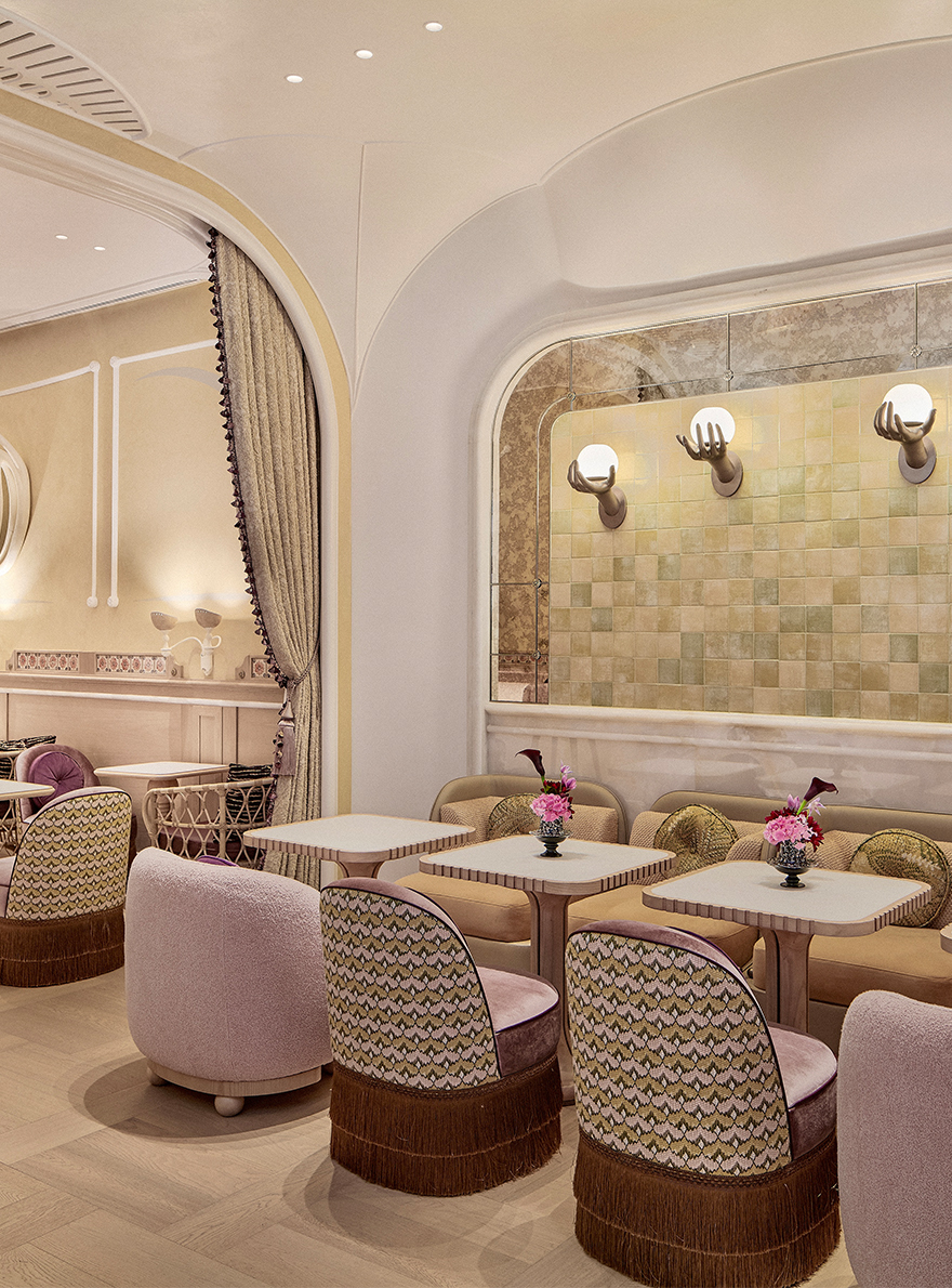 Directly inspired by the eponymous plant, the immersive atmosphere of the place deploys a wealth of textures and colours that celebrate lush nature. On the first floor, the patio alcoves are adorned with Maison Pierre Frey AU BORD DU LAC wallpaper, whose verdant motif is printed on a subtly metallic straw with woody tones, creating a perfect harmony between modernity and tradition. The ground floor lounge, a jewel box of refinement, offers a mix of retro details where the TALMONT jacquard and its herringbone pattern decorate the seating area. An exceptional address, Ortensia is a masterful fusion of classic and contemporary design, providing an unforgettable backdrop to a culinary experience that is both daring and delicate.