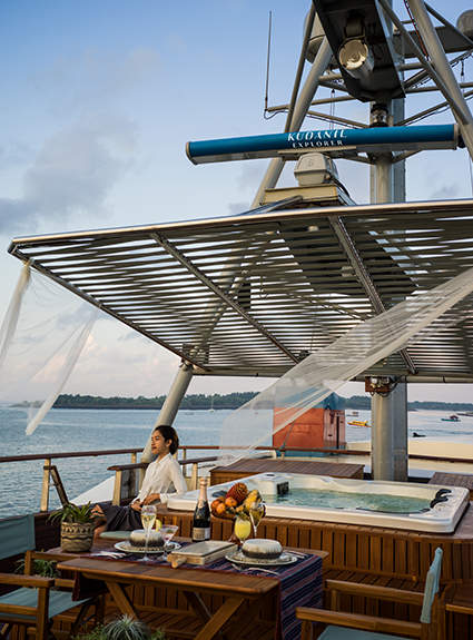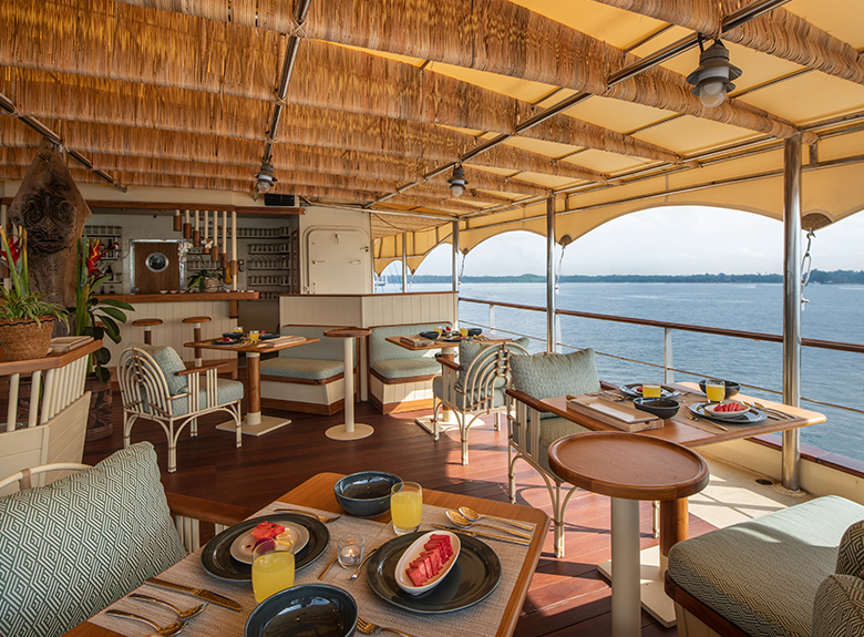 In a perfect balance between modern comfort and traditional Asian objects, Kudanil uses the outdoor fabrics of the Maison Pierre Frey, highly resistant weaves woven in the innovative Acrylic Dralon fibre, whose simple geometric patterns harmoniously match the atmosphere of the journey and the boat, both elegant and exotic.