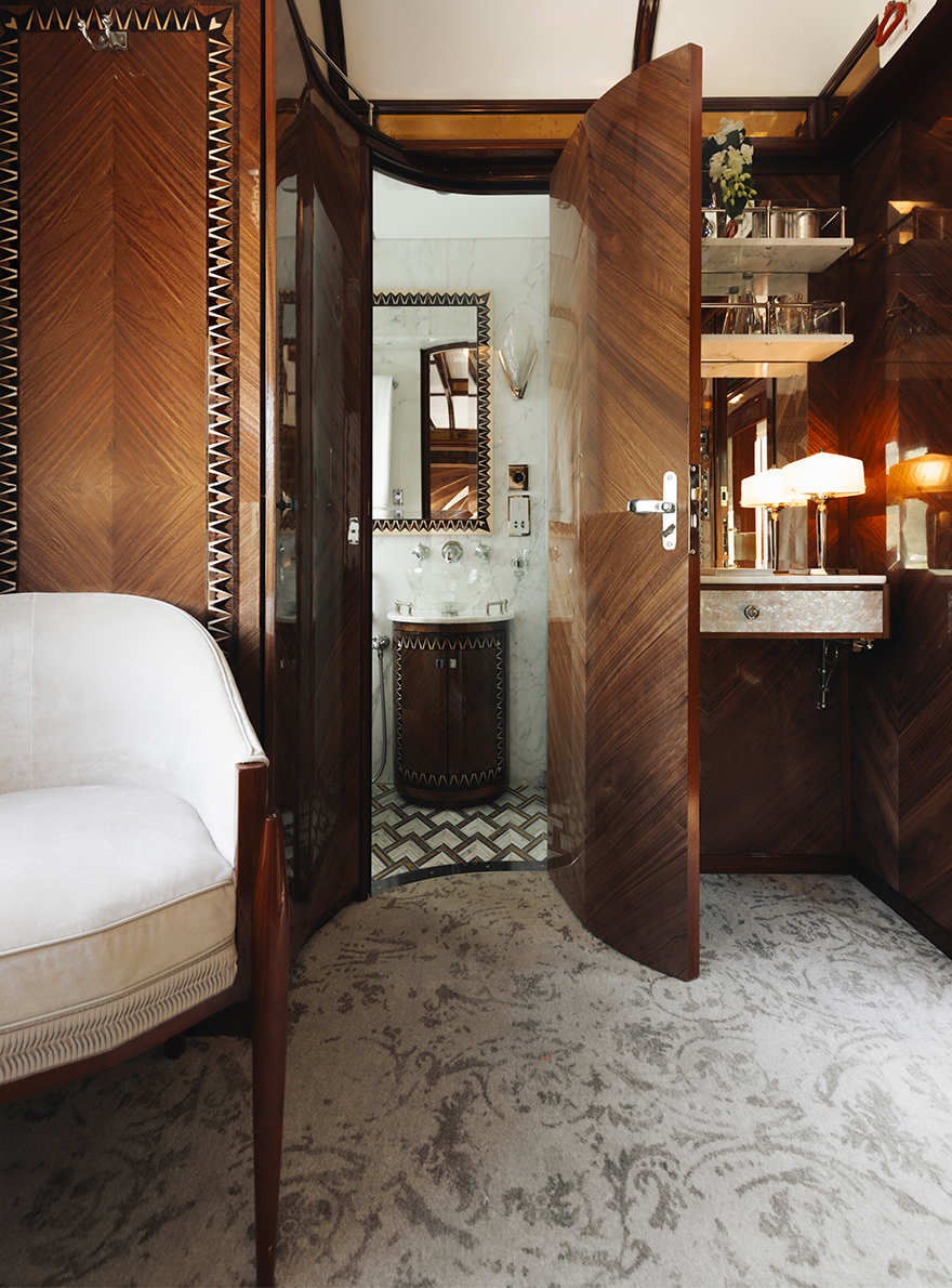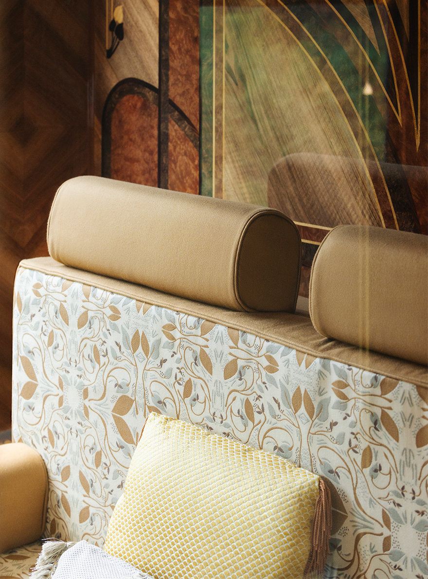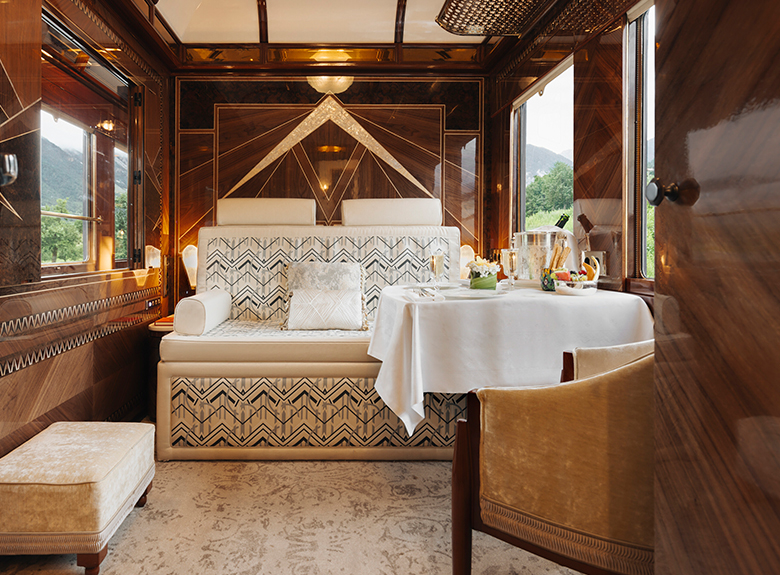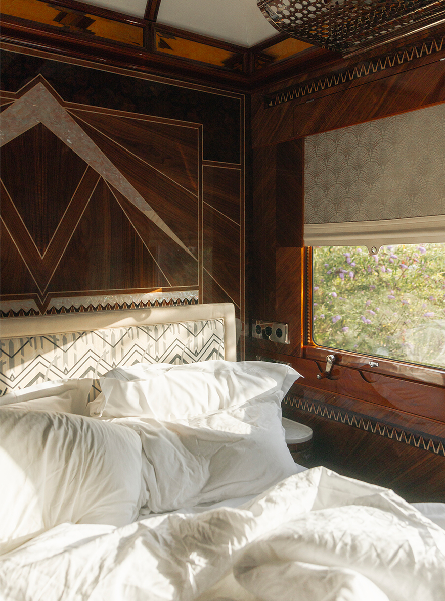 Pierre Frey, chosen for its custom-made expertise, has contributed to this exceptional project by providing a selection of velvets such as CAPRI II, LUIGI, ENZO and BALTAZAR, which are used to delicately cover the various seats and windows of the "bar car 3674", where epicureans enjoy cocktails and piano music. BIARRITZ, VIRGILE and OKINAWA plains and faux-plains adorn the four prestigious suites, inspired by the fusion of the landscapes crossed by the Venice Simplon-Orient-Express and the Art Deco style.