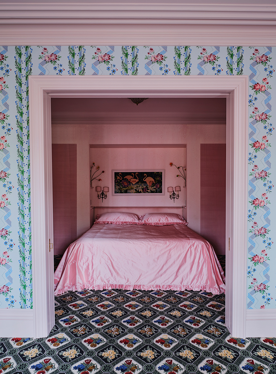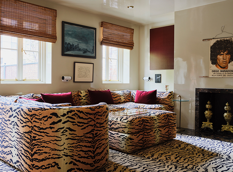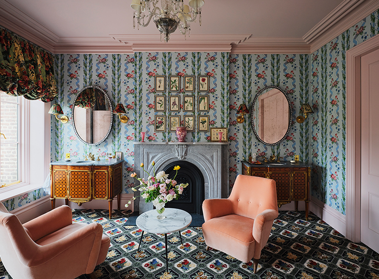 A real masterstroke, the decoration of the place is based around three different atmospheres: traditional English style, modern Brooklyn townhouse and Italian heritage. Le Manach's TIGRE CAMBRIDGE and MORTEFONTAINE fabrics and Maison Braquenié's CAISSON BOUQUET carpeting in the different rooms of the house underline the atypical layout and the uniqueness of the decor, making it a space that is both exceptional and incomparable.