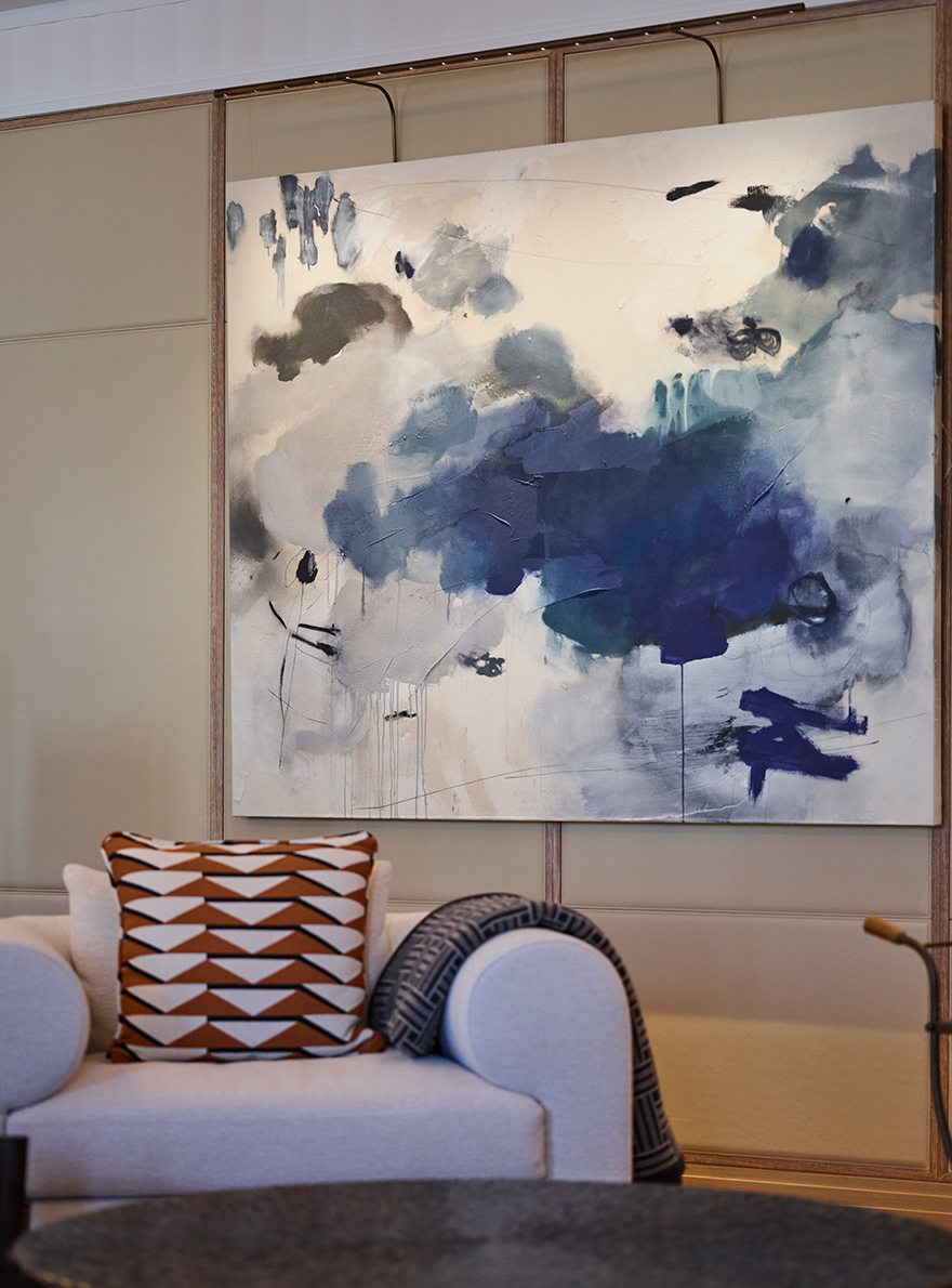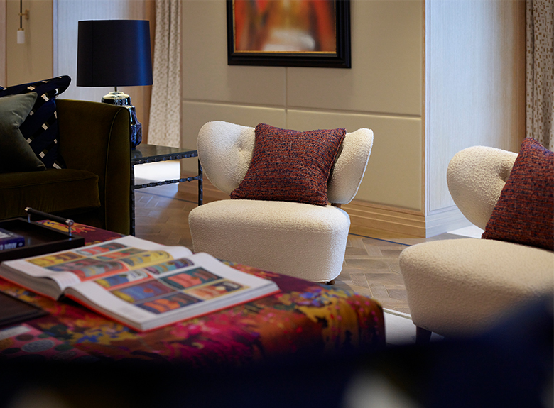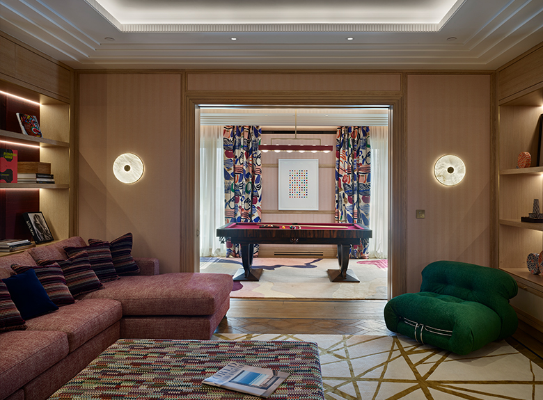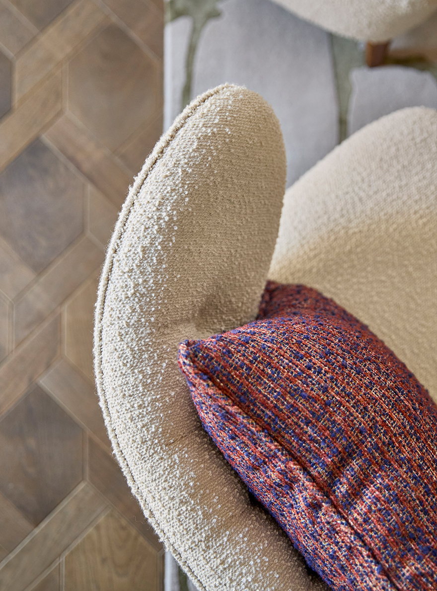 The five-bedroom penthouse, with its panoramic terraces and top-of-the-range fittings, is the result of the Winch design studio's collaboration with highly renowned suppliers such as Maison Pierre Frey, which has made available its wide range of printed and pinned velvets, as well as several references in jacquard fabrics, looped tweed and fluffy linen, all of which, with their relief and texture, contribute to the atmosphere in this truly one-of-a-kind residence.