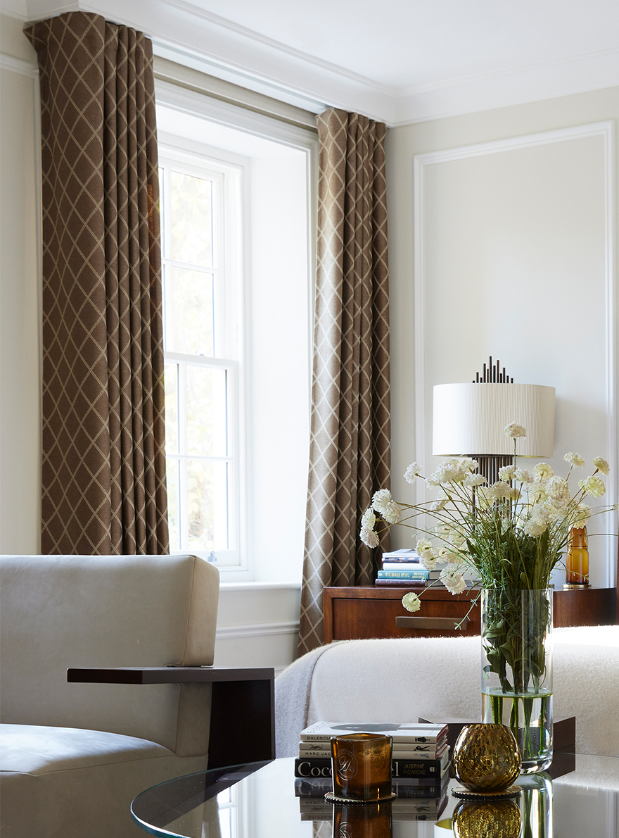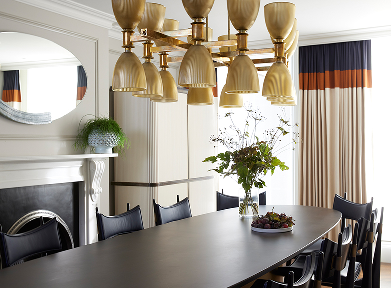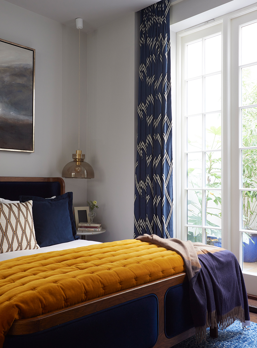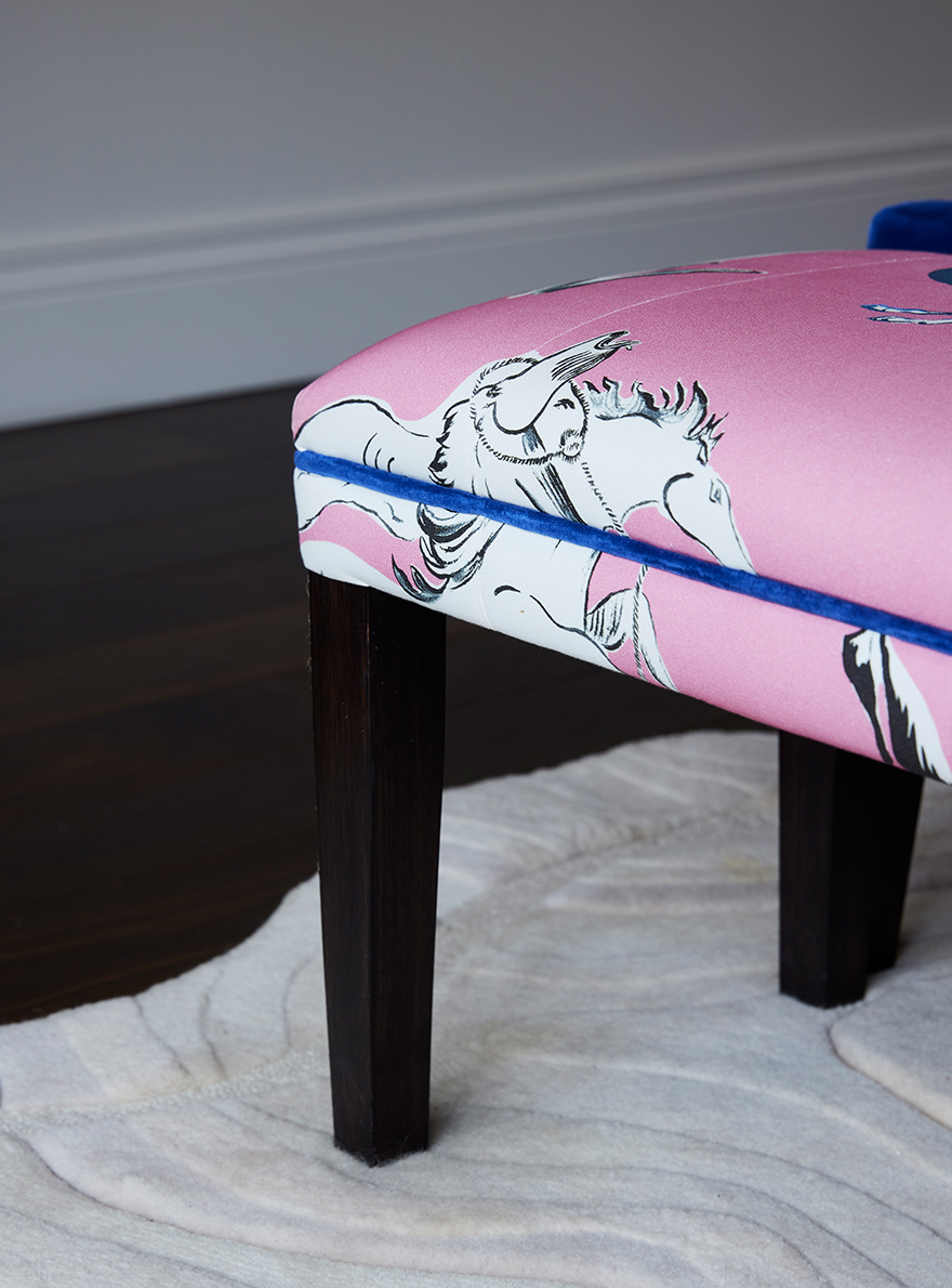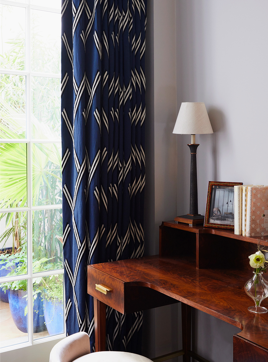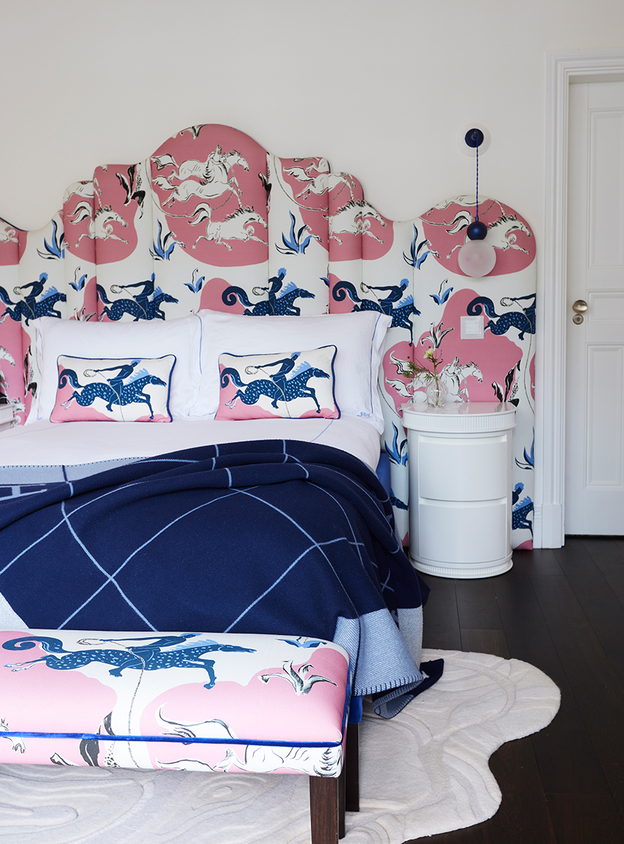In the children's bedroom, the use of the LASSO print from the Pierre Frey collections on the headboard, with its galloping horses, creates a feeling of movement. The ELVIS embroidery by Boussac adds a graphic touch to the parents' bedroom. The use of NACRE DE TOURS by Le Manach on the dining room curtains in shades of blue, orange and cream plays with the reflection of light to blend perfectly with this refined decor and creates a continuity with the living room, where the ZAO velvet on the armchairs, with its delicate scale pattern enhanced by a subtle metallic thread, adds a touch of sophistication and roundness to this unique setting.