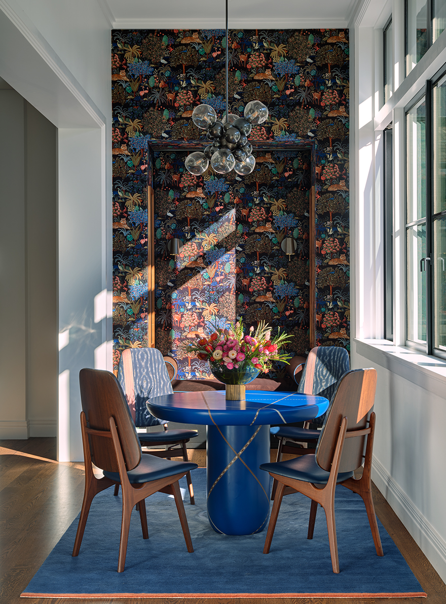 Blue dominates the walls and ceiling of the dining room. Touches of pink appear on the seating, where MALOU bouclette tweed is used, but also in the curtains made from NAMATA jacquard, whose large ikate chevron adds a sophisticated, contemporary touch to the room. LE JARDIN DU PALAIS wallpaper lines one wall of the game room, recalling the natural surroundings. Both a private family oasis and a reception venue for philanthropic events, this haven of peace seduces with its elegant singularity.