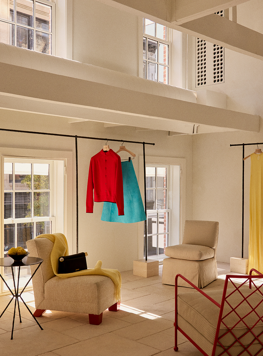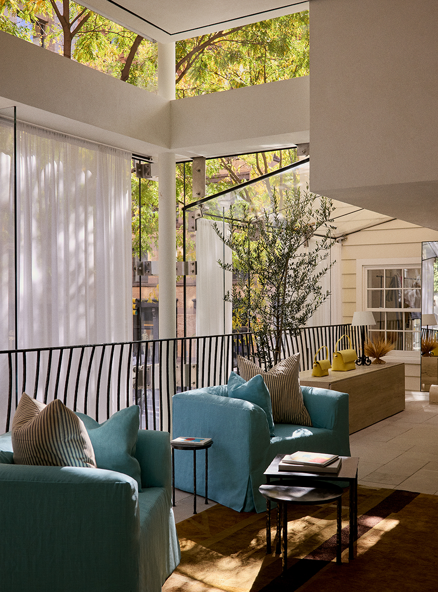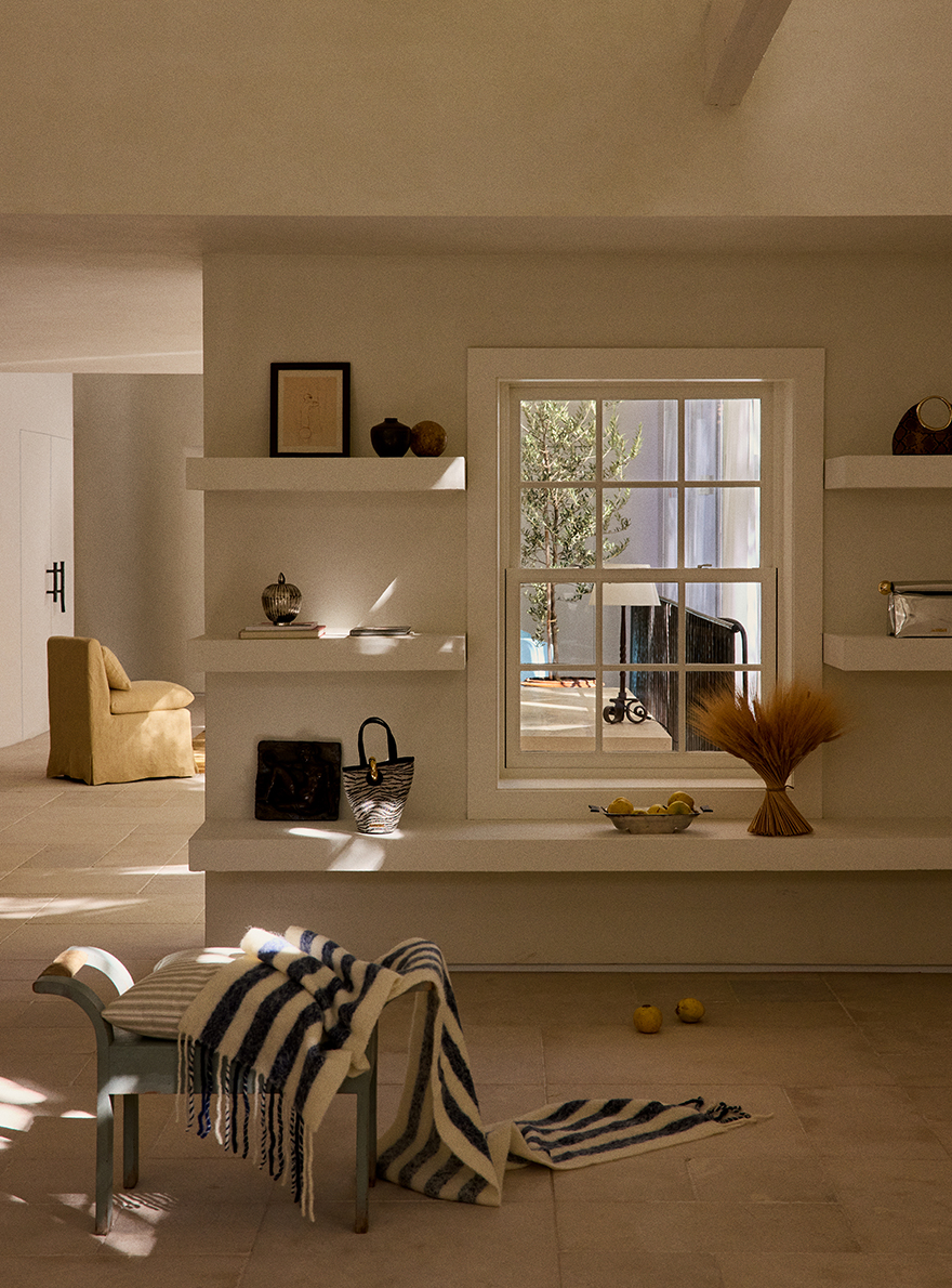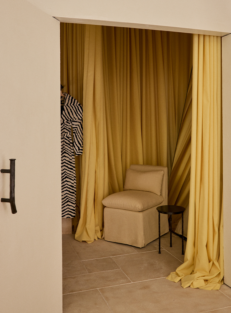 Nestled in the heart of a nineteenth-century house, modernised by an extension added in the 2000s, the interior reveals meticulous craftsmanship and a focus on bespoke pieces and collectables. The whitewashed walls and Burgundy stone floor blend with the SHABBY and MICHA linen fabrics from Maison Pierre Frey, which cover the seats in luminous, natural tones. The high-performance In-Outdoor BELLAGIO fabric, with its small herringbone pattern forming a two-tone graphic stripe, reinforces the ‘Provençal pop’ spirit of the space. Pierre Frey is honoured to have contributed to the creation of this unique and elegant space, known as ‘THE NEW YORK BOUTIQUE’ by Jacquemus.
