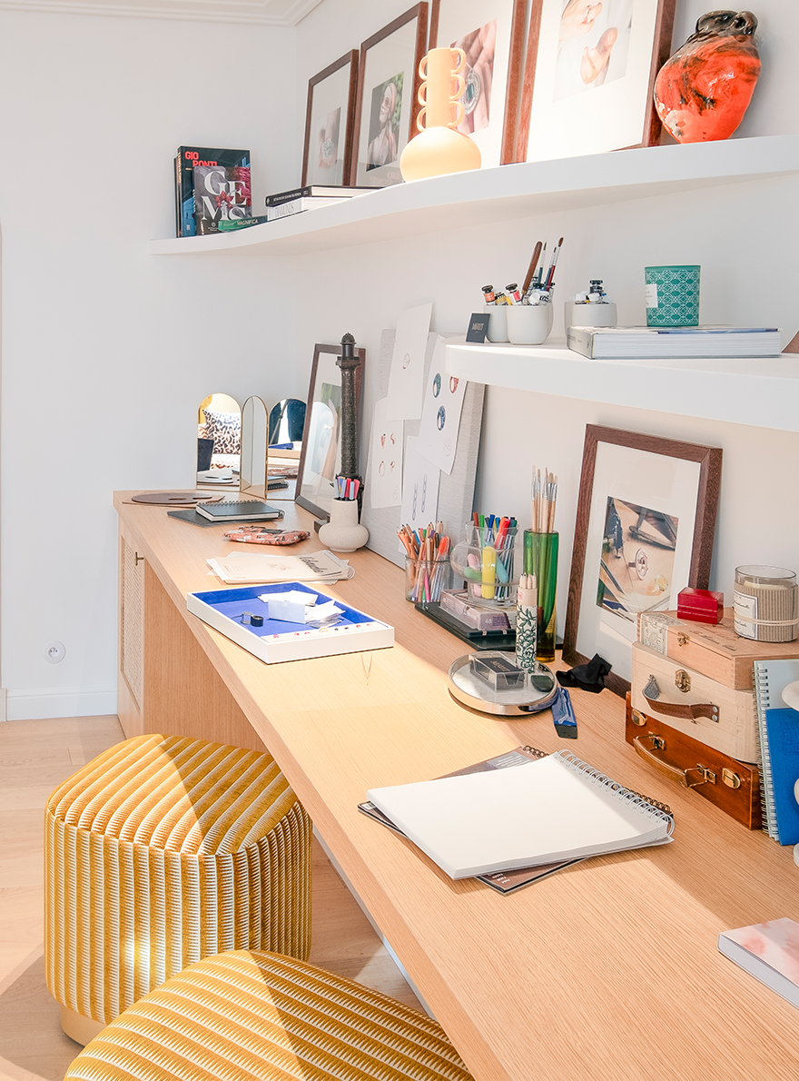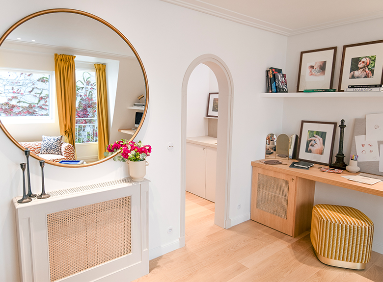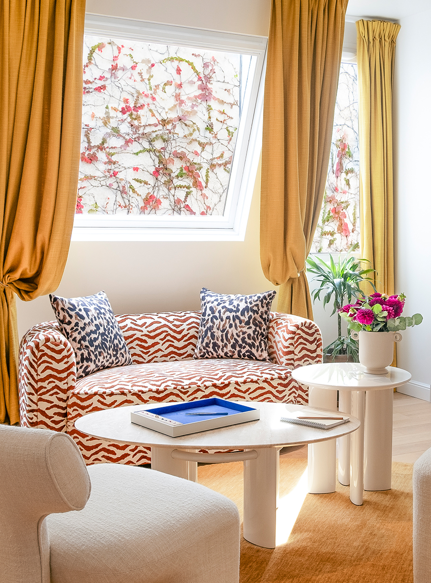 In their design studio in the heart of Paris, Pierre Frey showcases its custom-made expertise, adorning the premises with its collections of fabrics and furniture. In the lounge, the BUENOS AIRES sofa is adorned with the BENGALE toile de Tours. A pair of LITHO armchairs upholstered in ARSENE linen with a fluffy effect accompanies this ensemble of refined curves. The showroom windows are draped in SAMOA silk matting in a luminous turmeric hue that reinforces the warm atmosphere of the space. The CARL footstools, upholstered in the ikate-striped toile de Tours GAO, complete the workspace and underline its refined design.