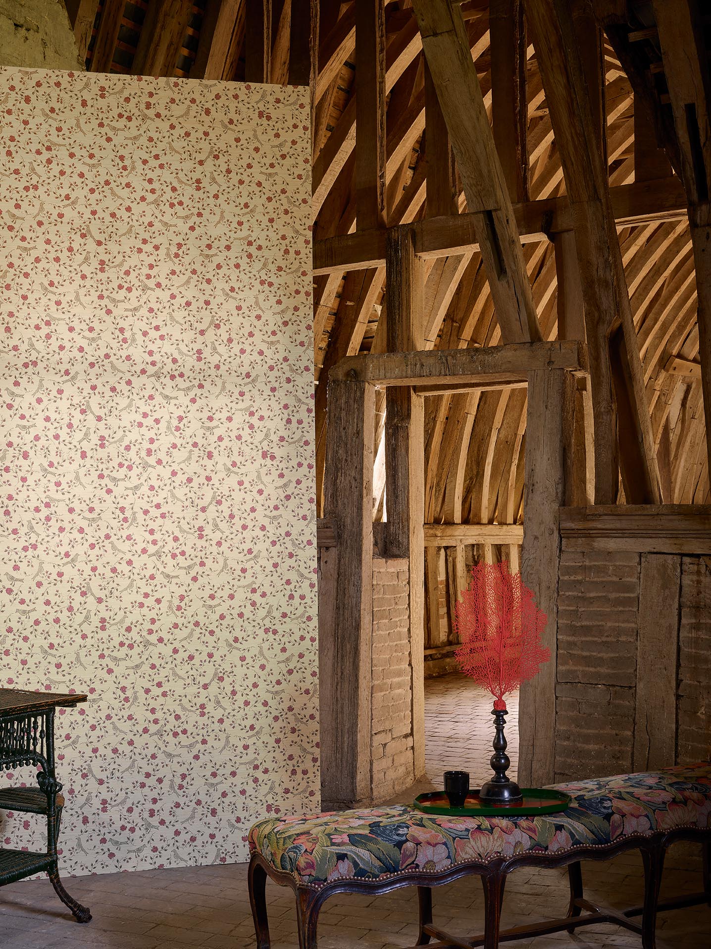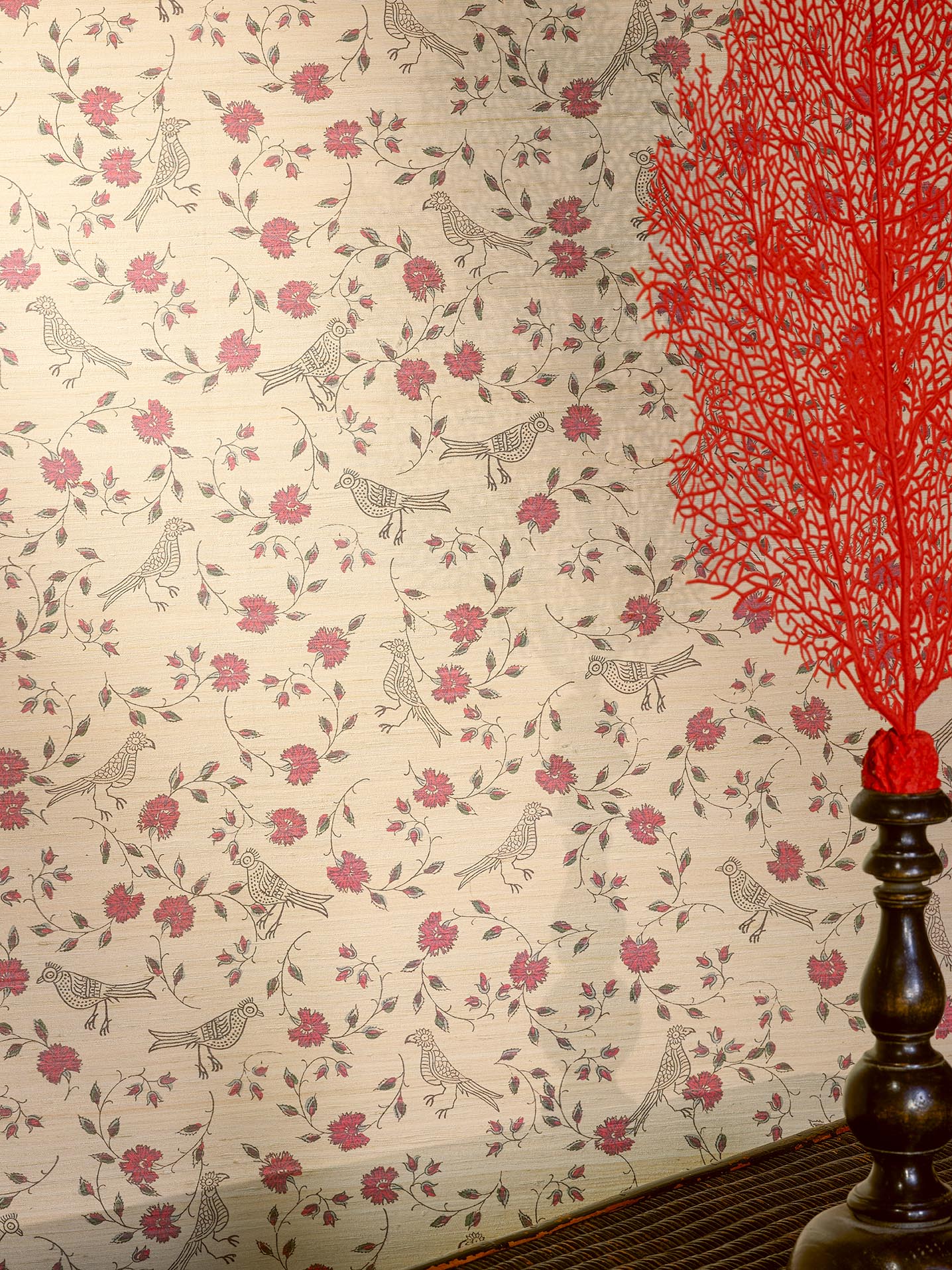 Based on one of the Maison's emblematic designs, this wide width wallpaper printed on raw silk features an Indian motif of birds and sinuous flowering stems. Coordinated with the panoramic wallpaper LES ARCADES ALBERTINE BP348 and the ALBERTINE F3278 and FP640 plains.