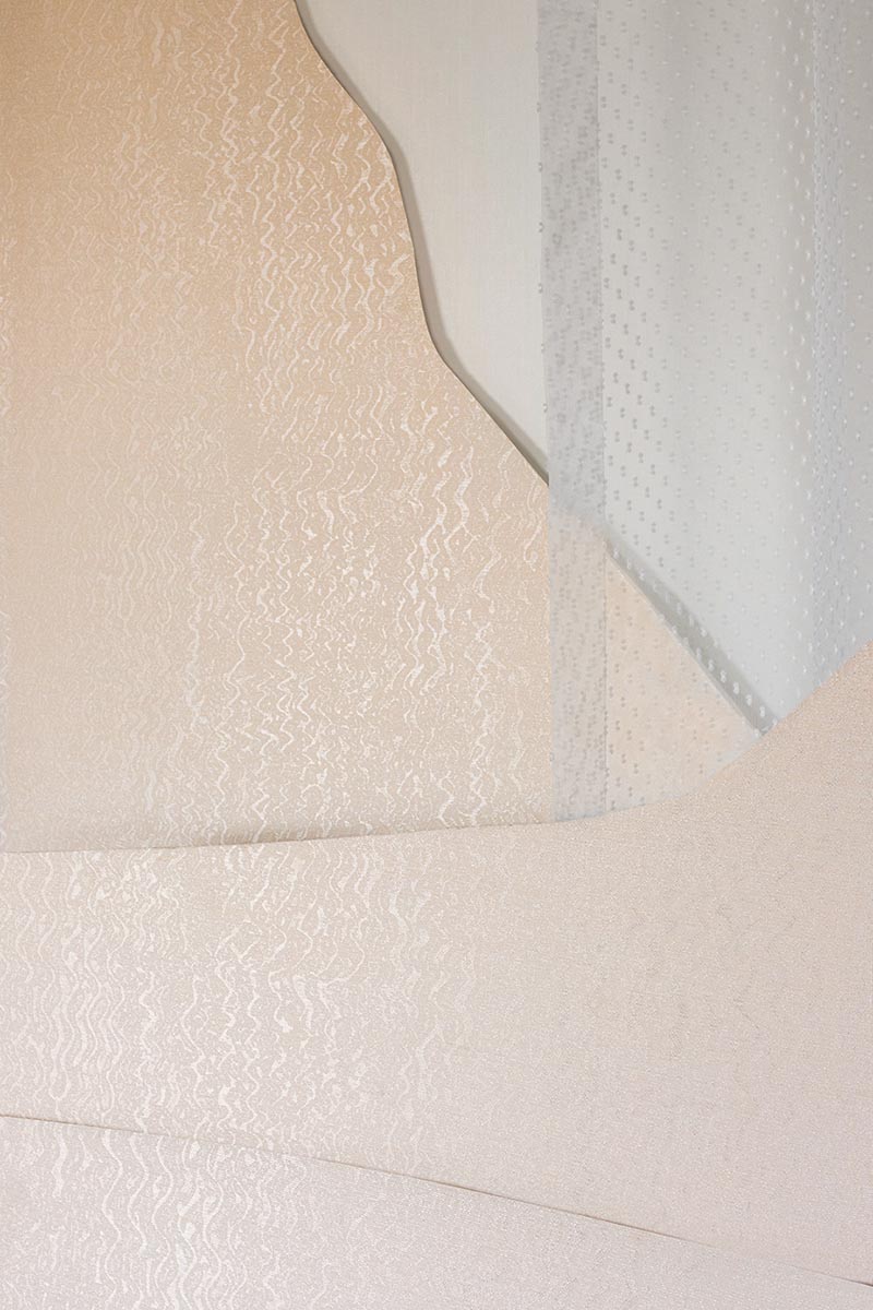 The pearly, powdery reflections of this wallpaper, a textile laminated on a non-woven backing, evoke shells and water with elegance and delicacy.