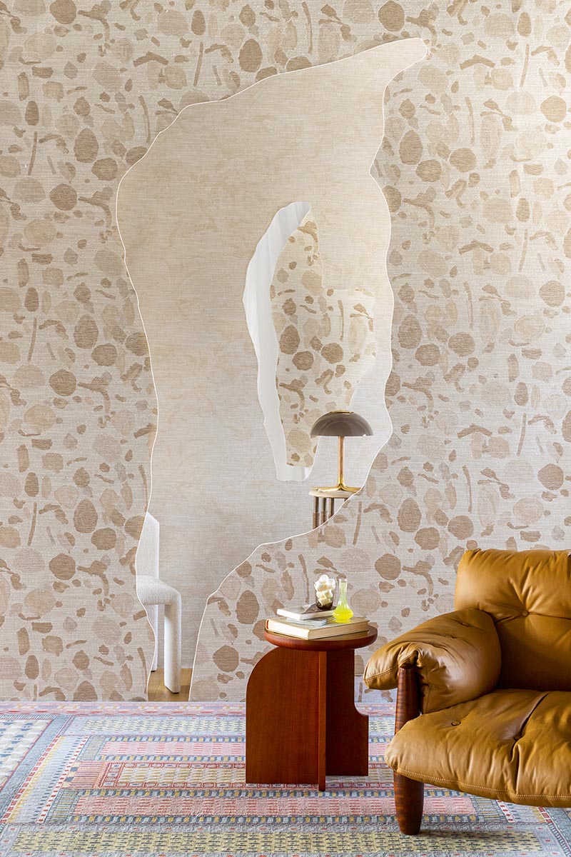 A stylised design of rocks and stones echoing terrazzo in mineral and woody colours. The contrasting threads of this wallpaper, laminated on non-woven backing, give rhythm to this composition.