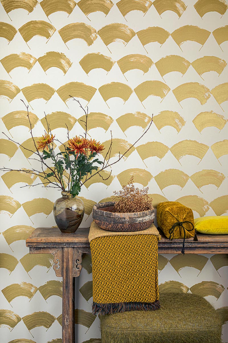 These fans are delicately suggested by bold brushstrokes and a play of textures. The choice of using hand screen printing gives a very clean, modern look, reminiscent of calligraphy.