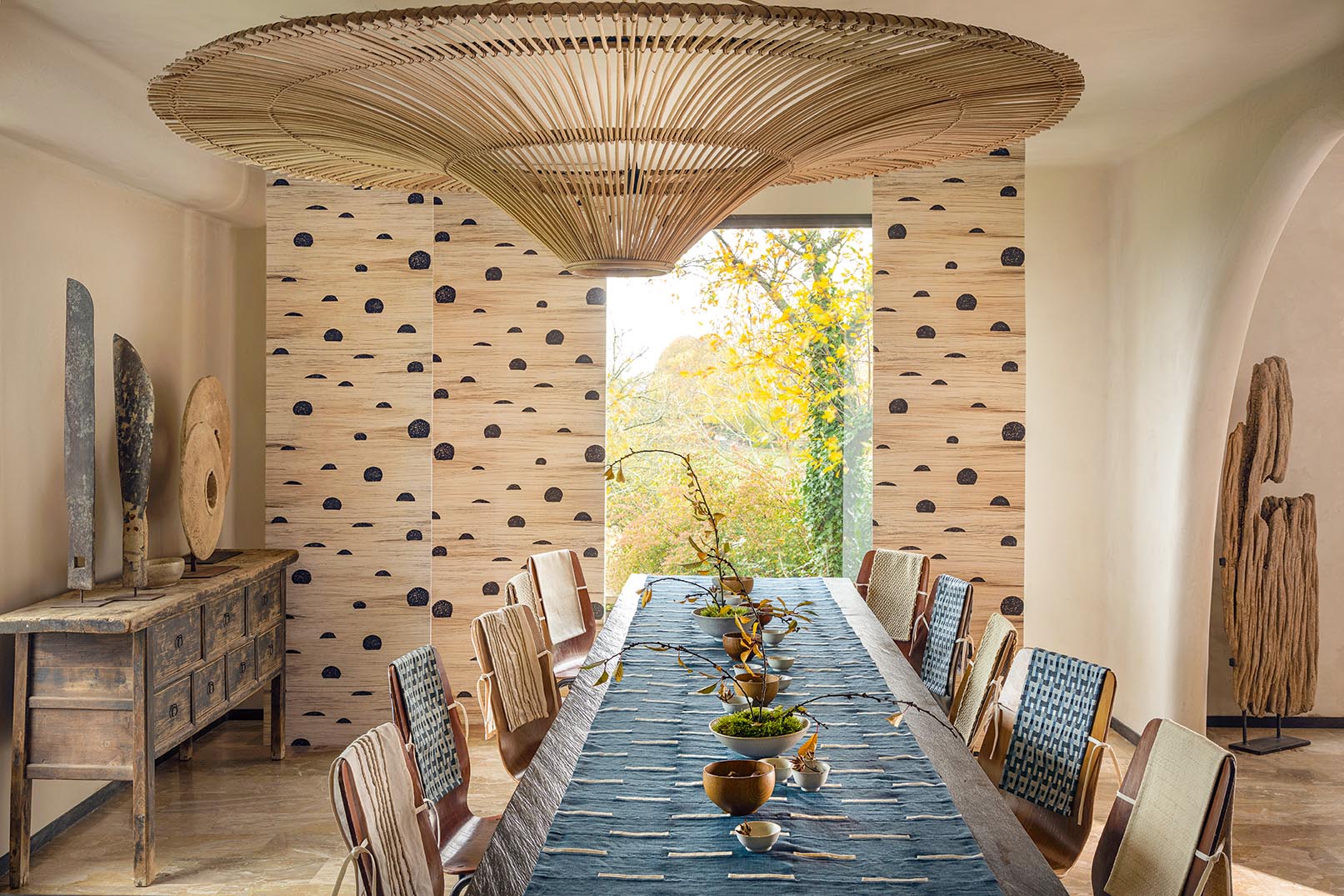 SOLEIL LEVANT! A name like a promise of elsewhere, the discovery of a thousand-year-old art, landscapes and a singular craft: the Far East. Driven by the spirit of Wabi-Sabi, between fullness and the traces of human activity, the collection revisits the real or imaginary bestiary of tigers and dragons of this land, Chinese porcelain, and the techniques and patterns of traditional Japanese or Tibetan clothing. It invites poetic escapism through the interplay of textures, inks, shapes and colours in subtle harmonies.