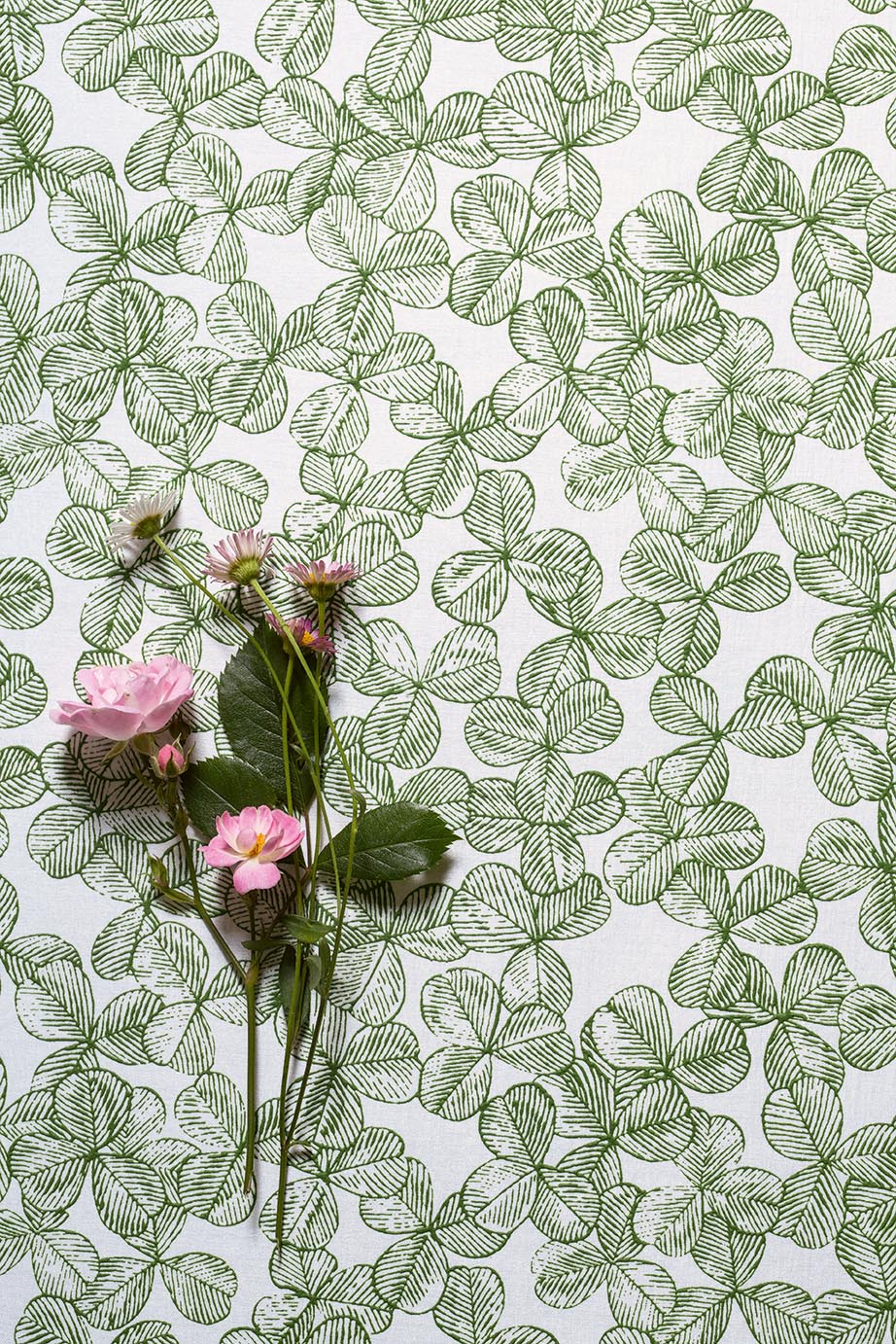 A pattern of shamrocks printed in swelling ink on a silky backing. This contrasting texture adds volume to the wall.