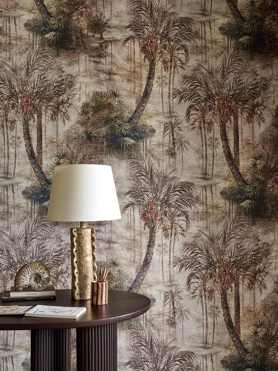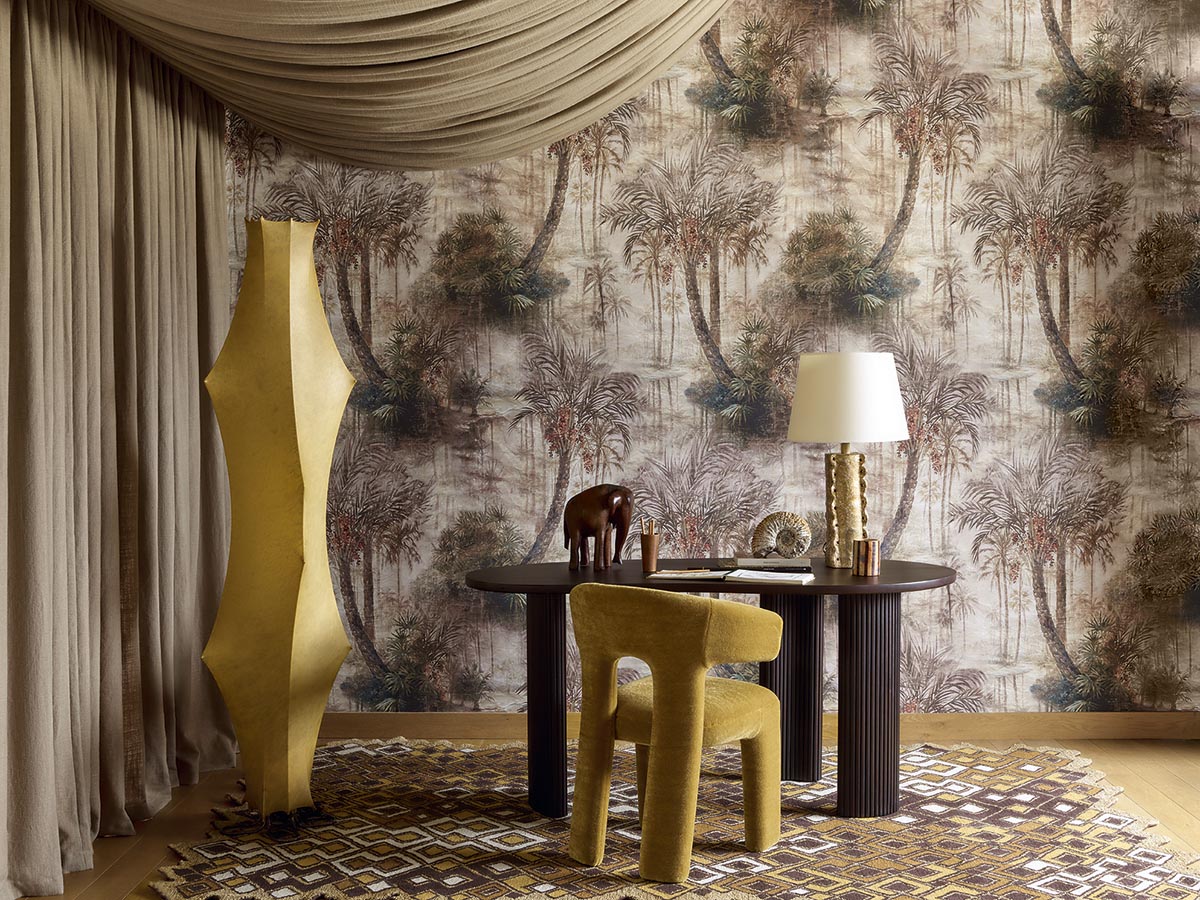 A wallpaper with the allure of grisaille, UBARI poetically and subtly depicts a misty, dreamy oasis. Available in coordinated fabric under reference F3990 UBARI.