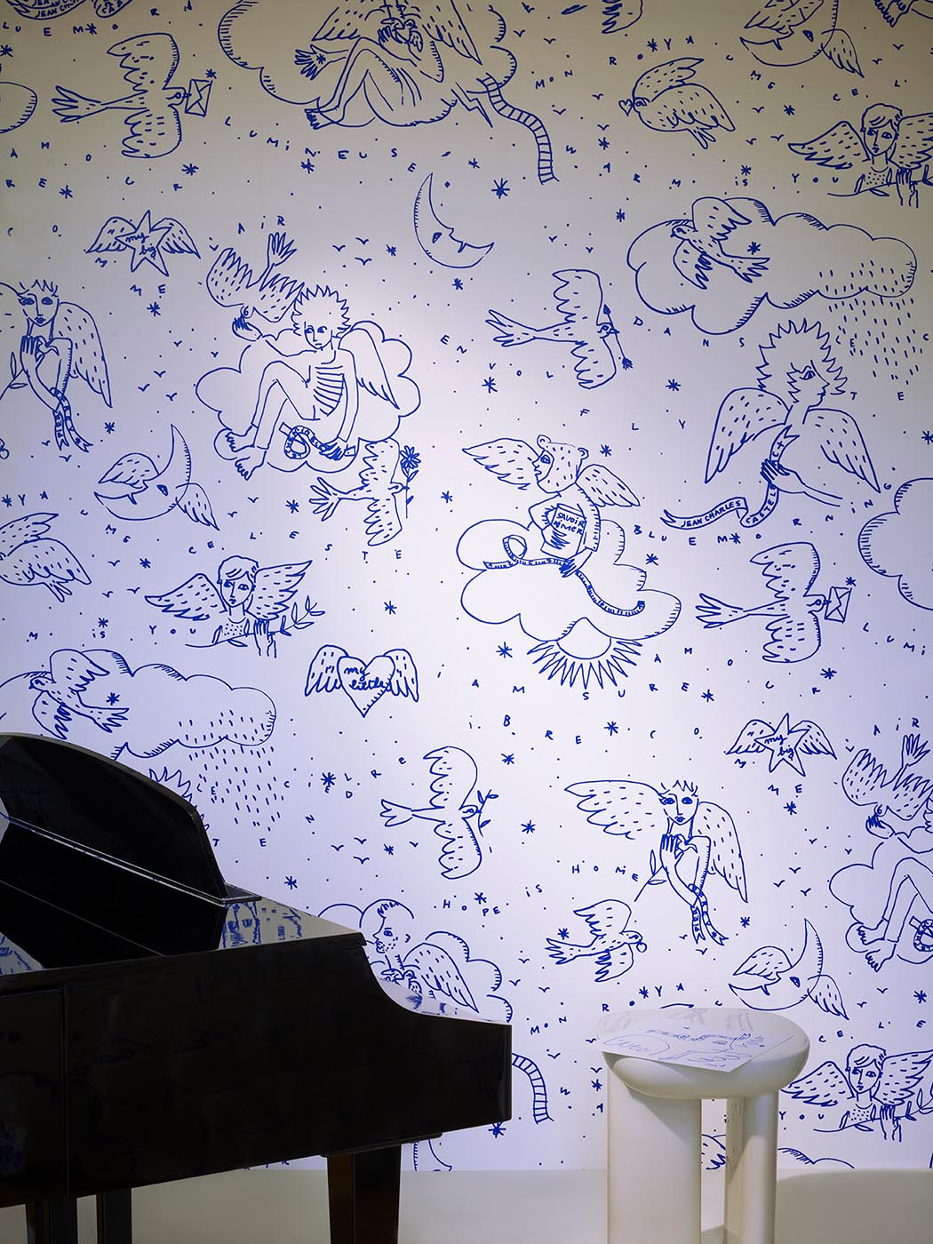 Beyond the visible reside the angels. They share the sky with the birds; the clouds are their cottonwood trees. They hide there at dawn, and the stars light up when their hearts brush against dusk. This design evokes a classic French style: Toile de Jouy. Blue for dawn, printed on a glazed non-woven, and gold, printed on a fibrous non-woven with a metallic sheen, for the dusk.