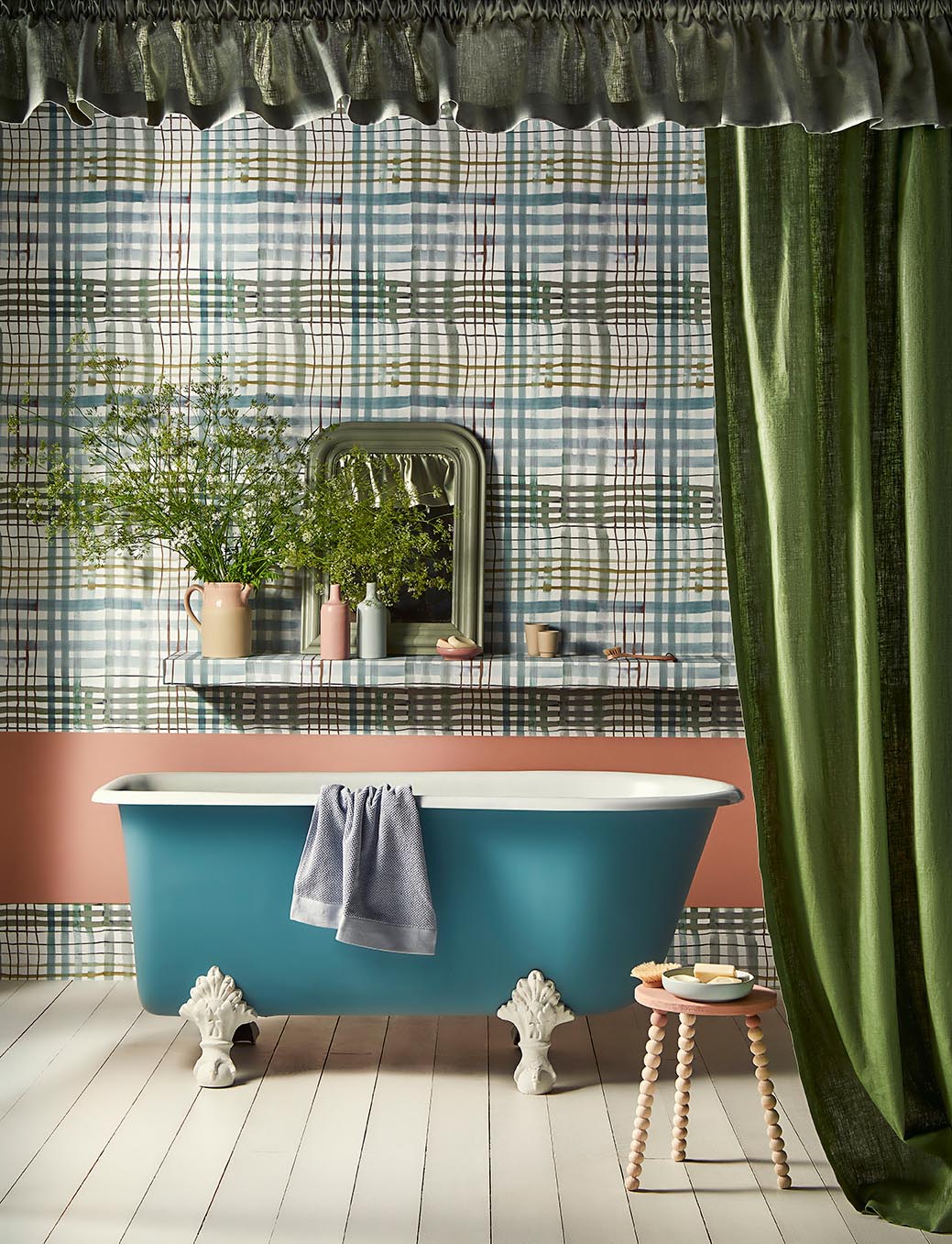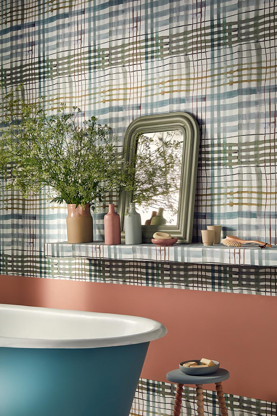 This large contemporary check is drawn with a random watercolor line. Midsommar means “midsummer”, when nature reaches its peak of fertility. It is inspired by a Swedish pagan festival.