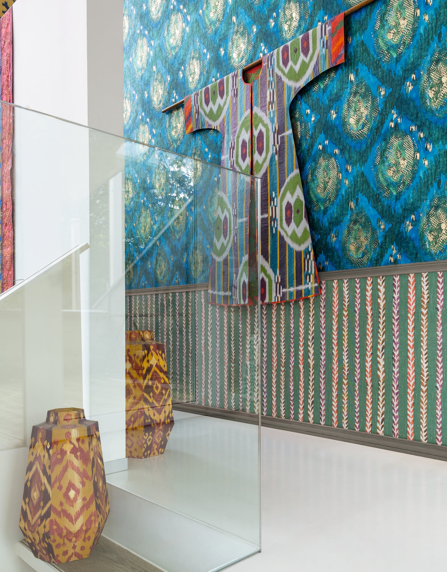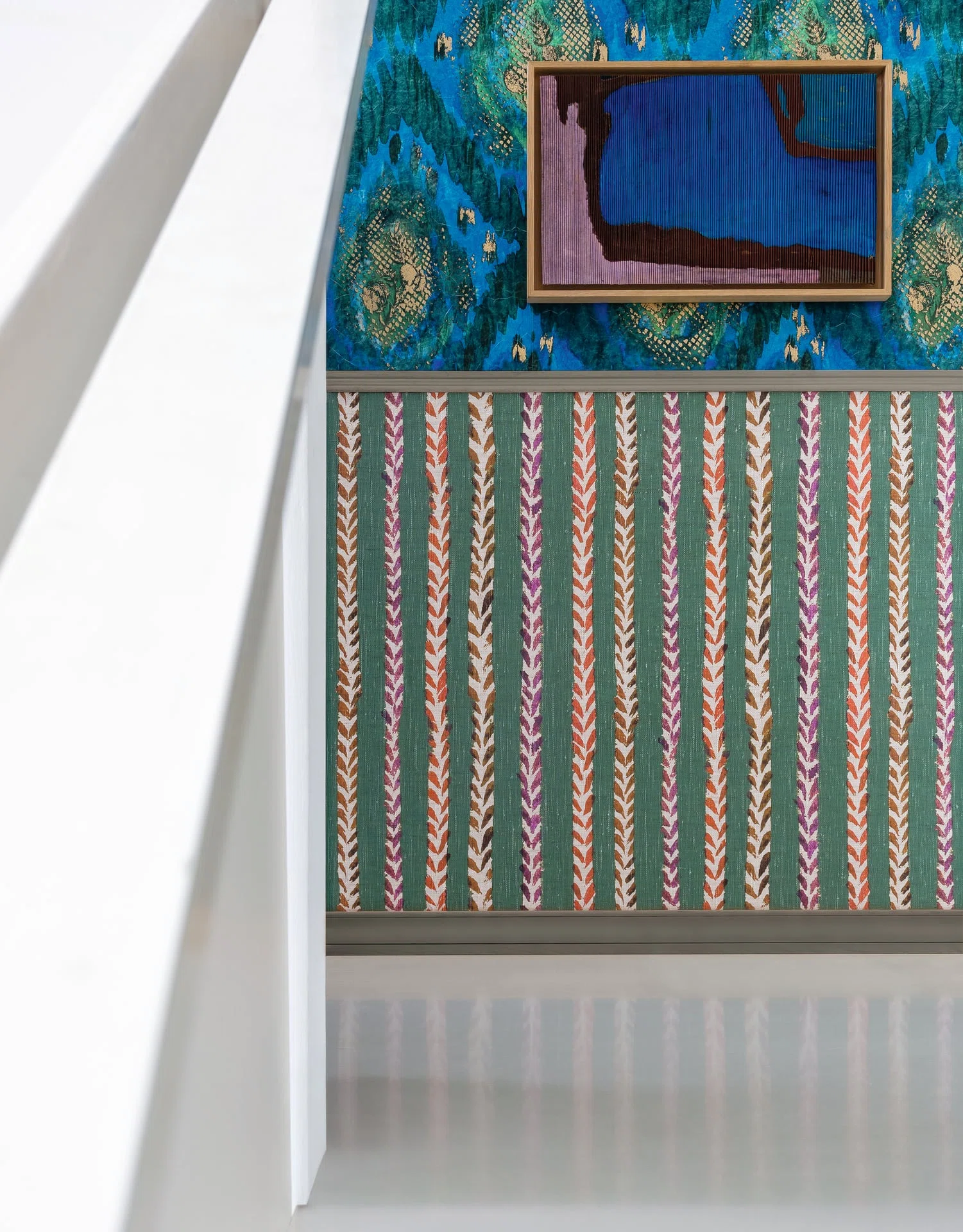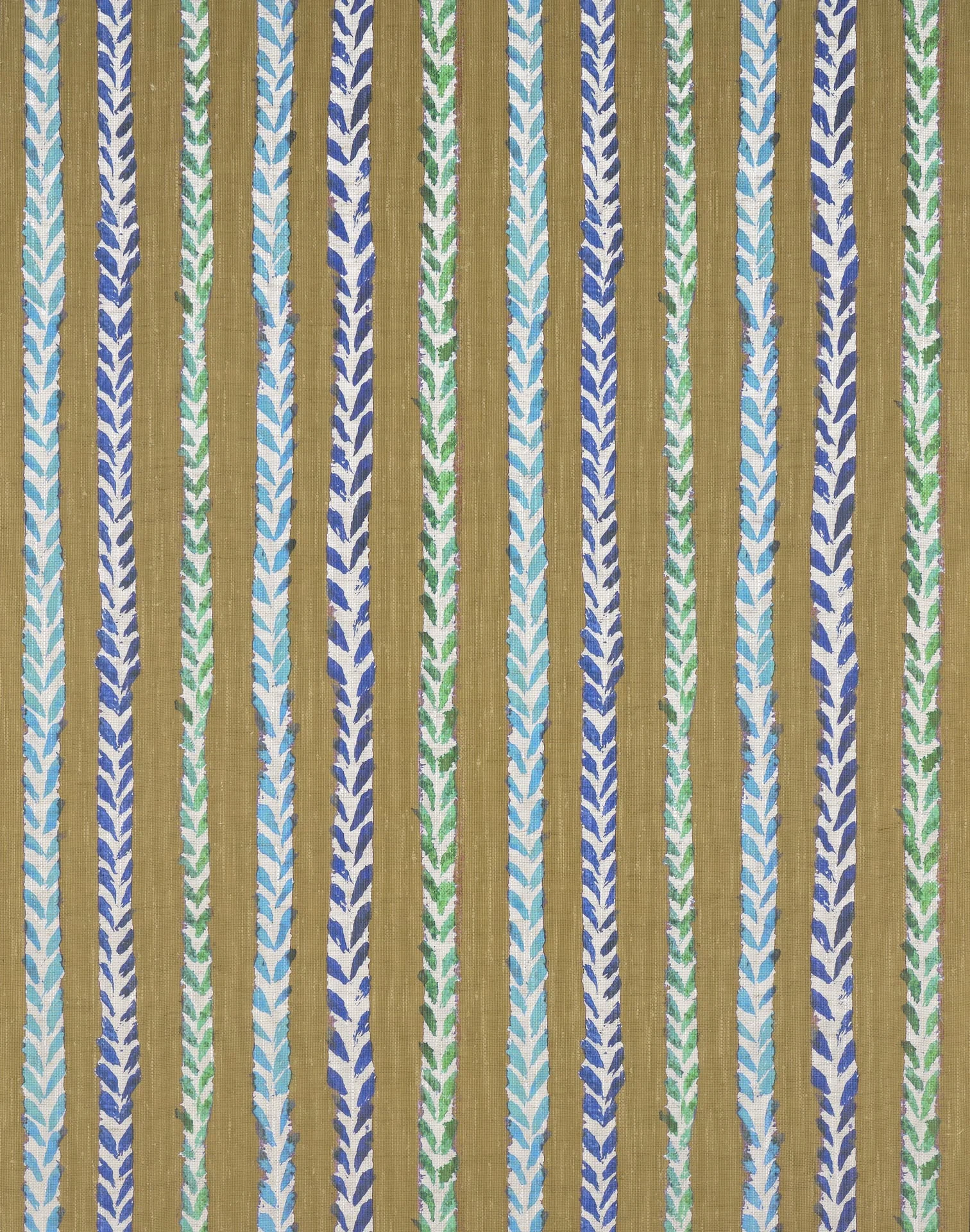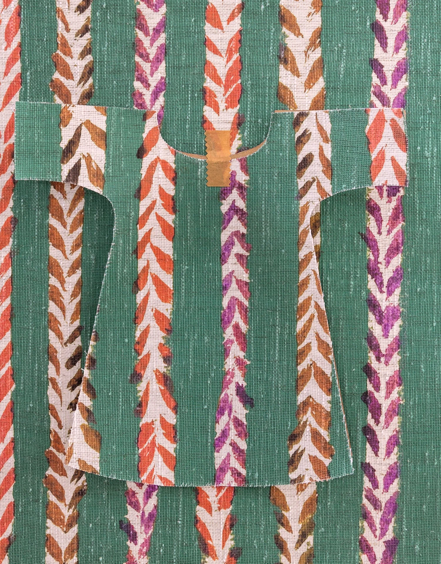 The slightly irregular red and purple chevrons evoke the impressions of stylized leaves or feathers.This motif conveys both apparent simplicity and the depth of Isabelle’s line. The natural stroke is an extension of her hand, a self-evident gesture for her. Always alive, painted with a brush, it allows us to feel the spontaneity of the movement, its momentum; sometimes it is silence, sometimes it is motif… Printed on a linen textile, the design authentically captures the artist’s hand.