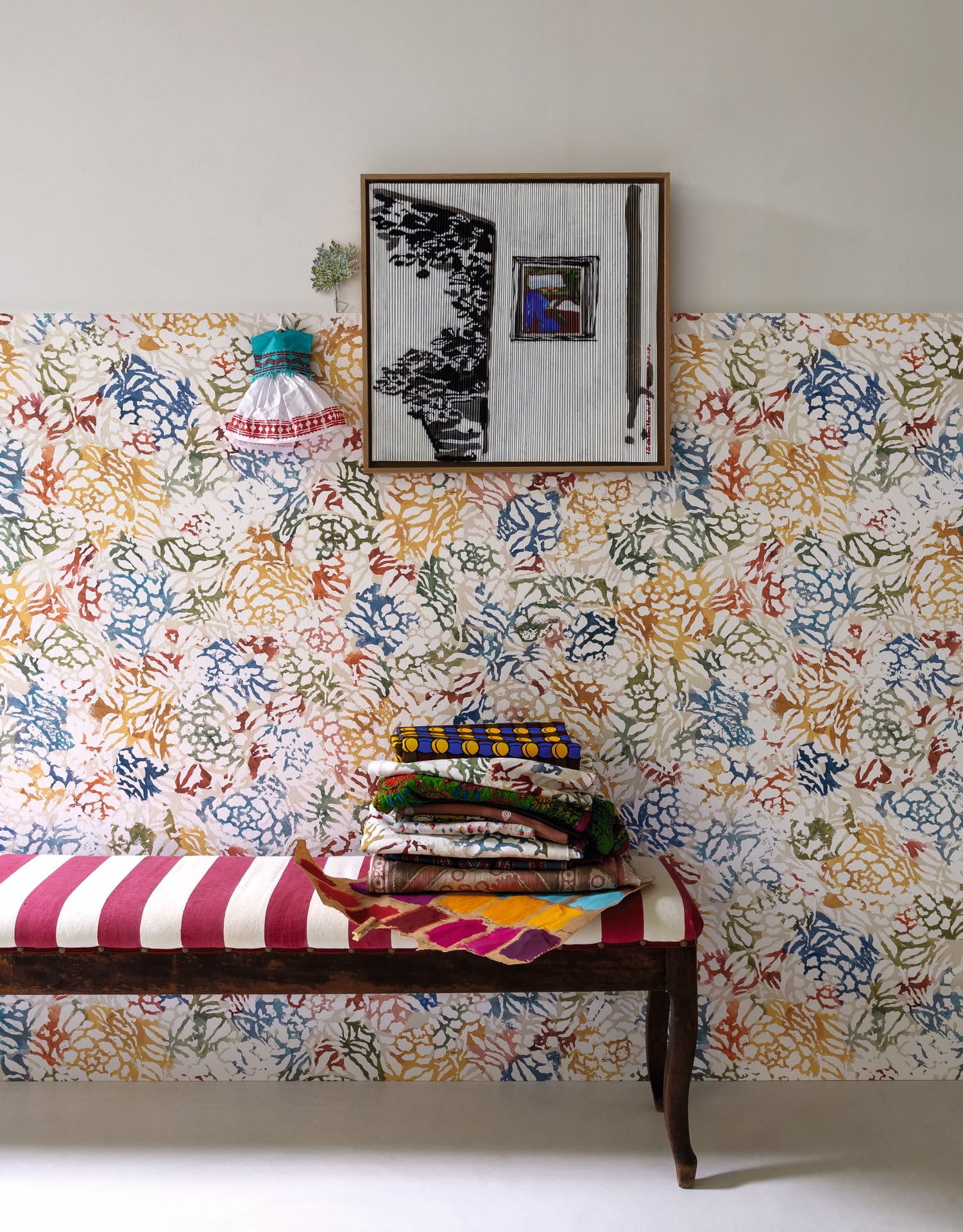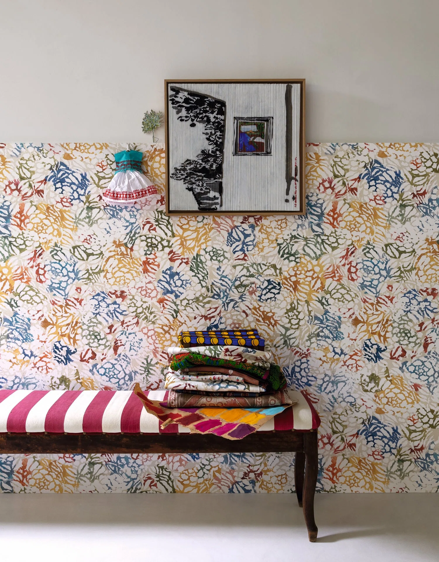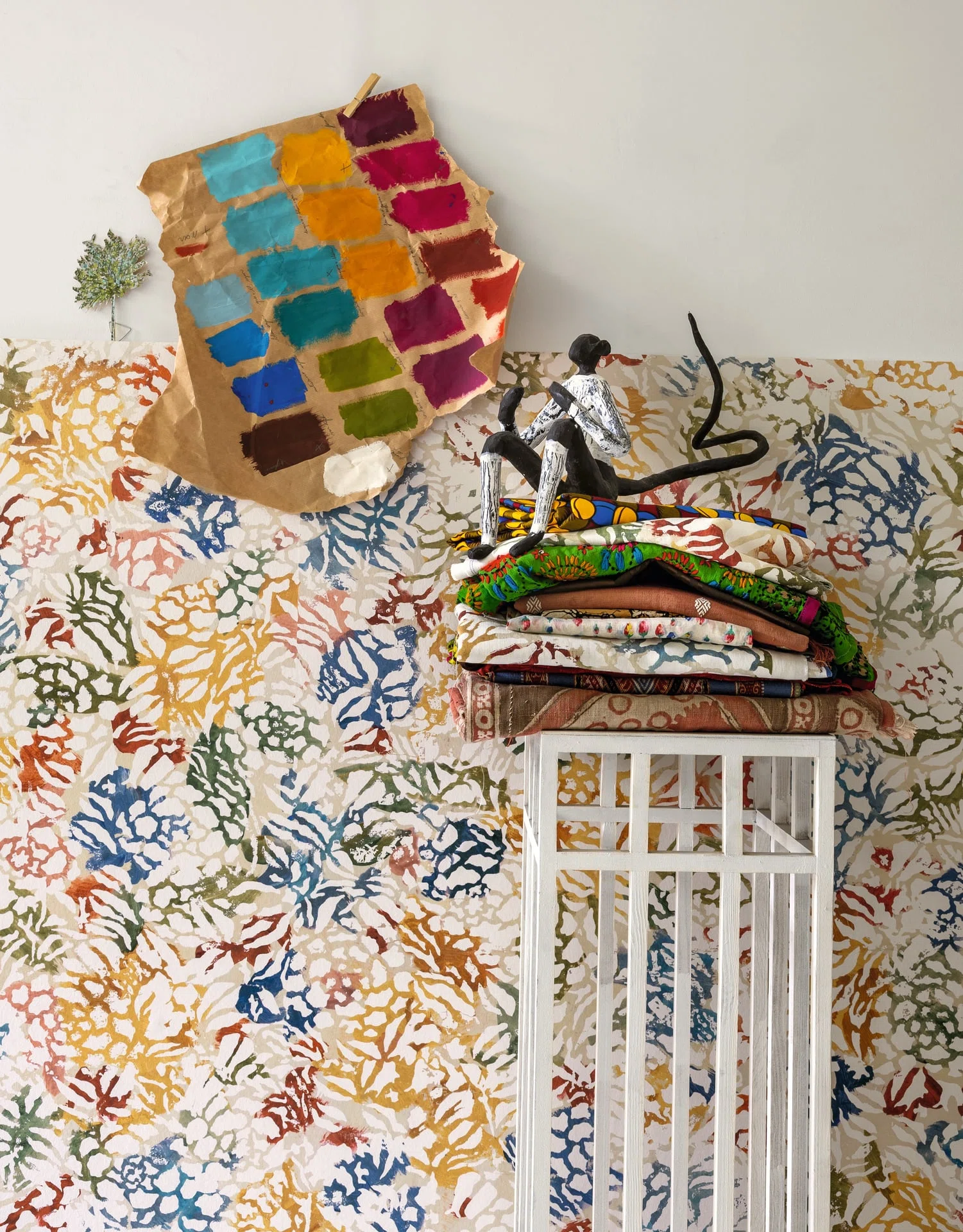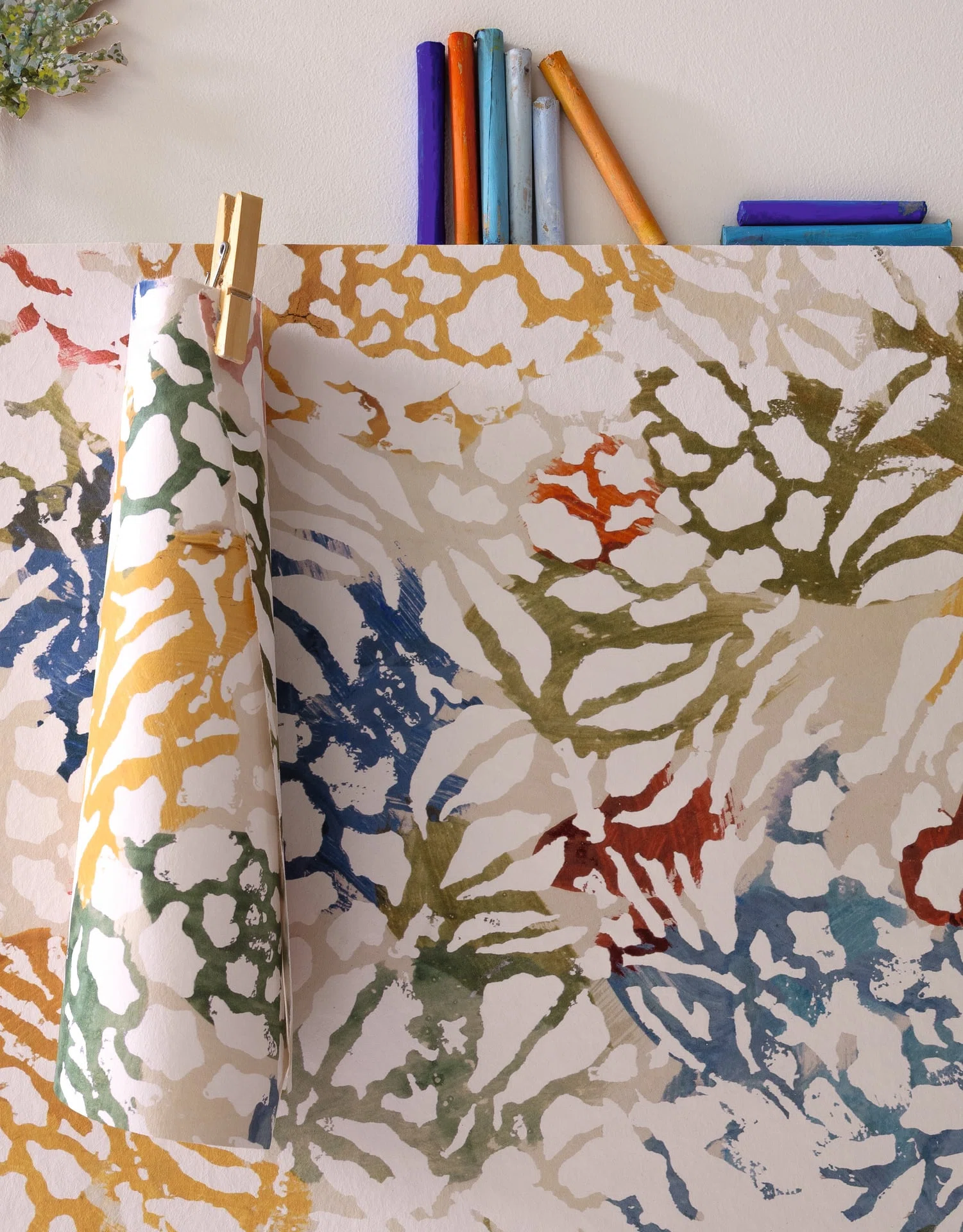 The union of flowers, colour and stencils - three areas of experimentation for Isabelle de Borchgrave. A tribute to nature, so often painted by the artist, with a modern twist. The peony is a symbol of beauty, generosity and femininity. This motif embodies what characterises Isabelle so well: the joy of bringing flowers into life and the importance of decorating one's home with flowers. An organic rhythm, accentuated by matte white ink and the natural, fibrous texture of the support.