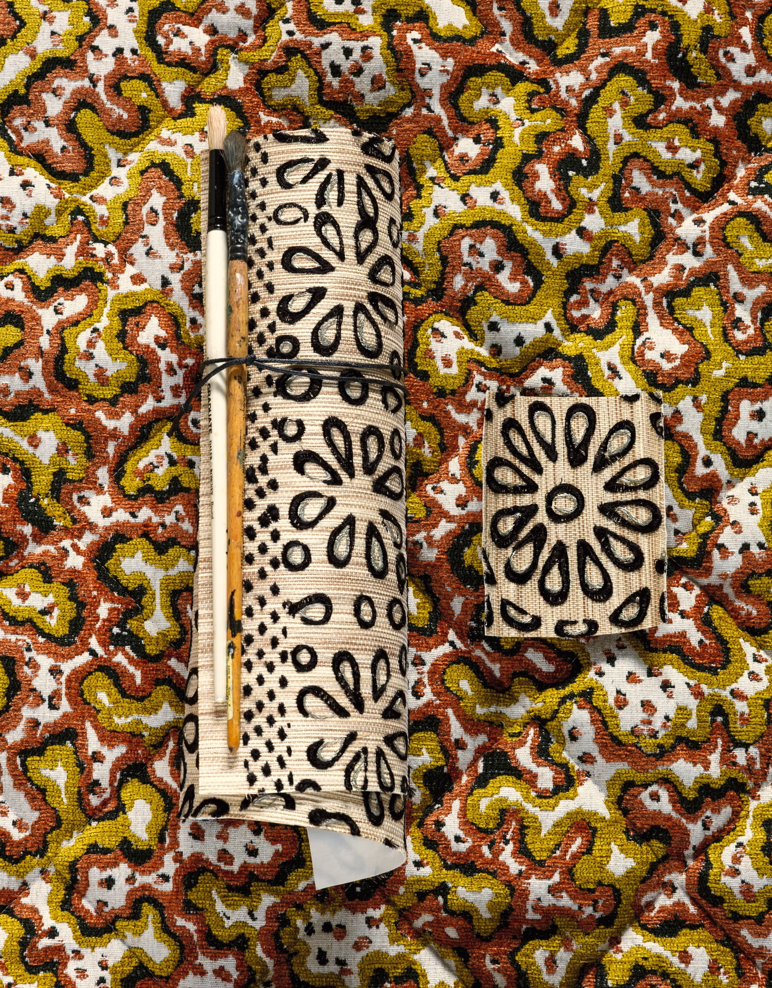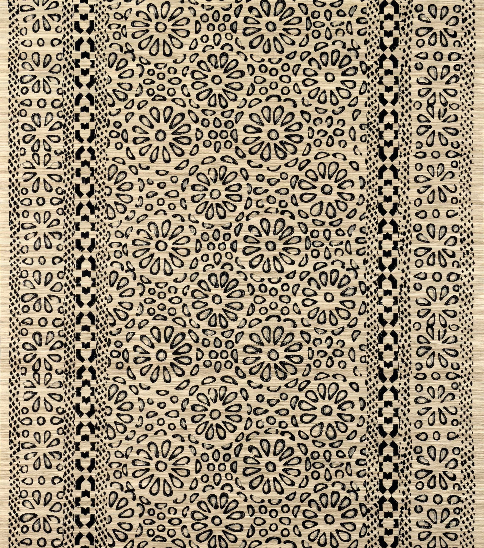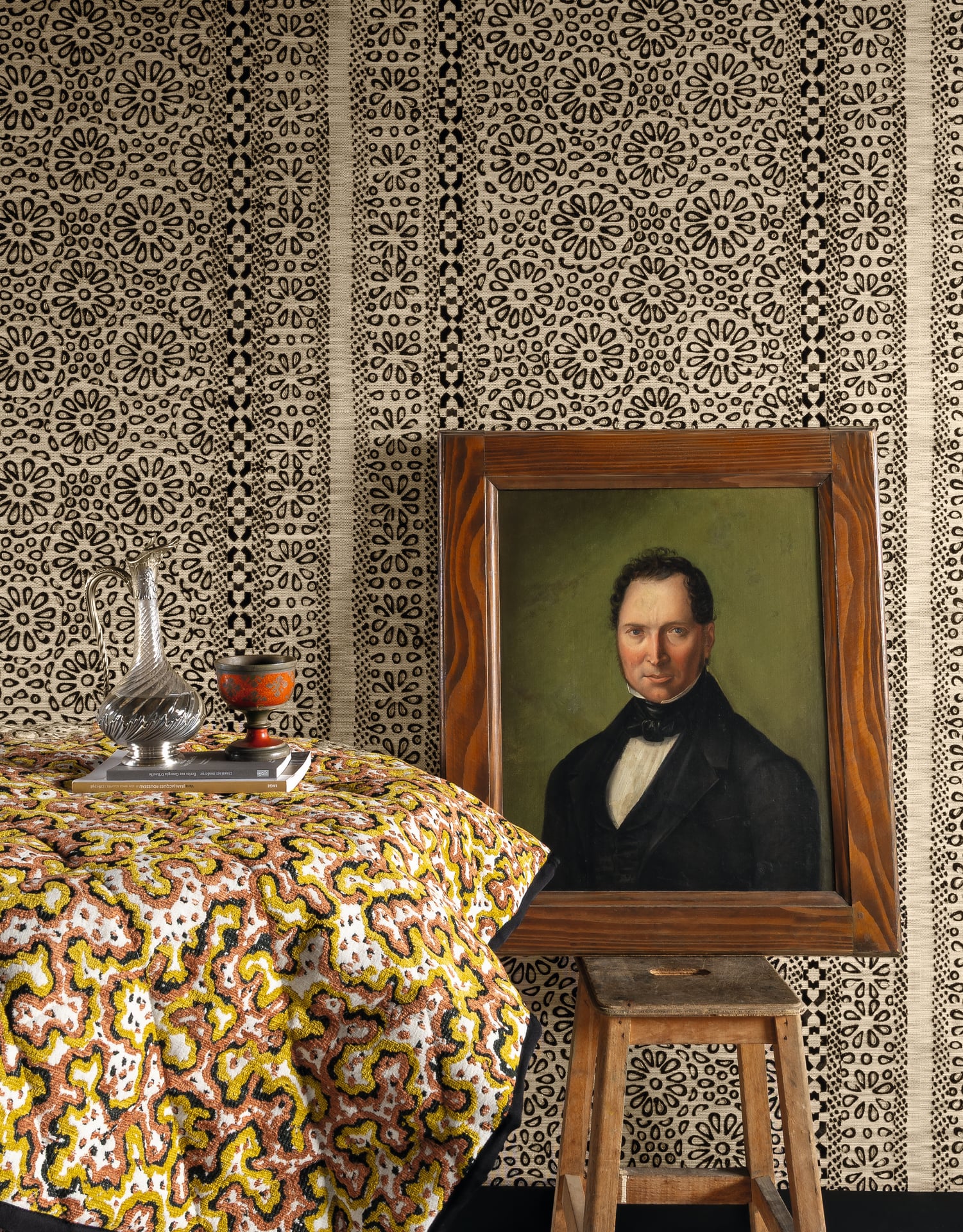 In Isabelle de Borchgrave's universe, the mashrabiya embodies a poetic boundary between interior and exterior, between the intimate and the visible, allowing just enough light to pass through to double her work with its reflection on the floor. The artist pays homage to Oriental architecture, where the mashrabiya becomes an artistic filter through which she expresses her fascination with world cultures, travel and her love of detail sublimated through the embroidery technique on sisal backed non-woven fabric, creating a wall motif that shimmers like a jewel.