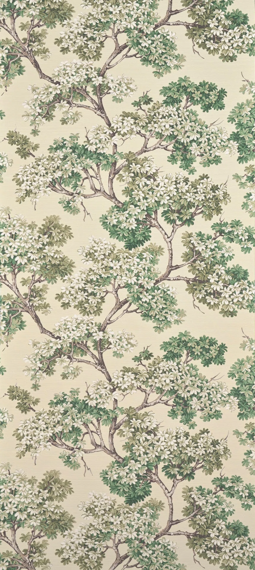 Printed on pearlescent vinyl with a silk embossing, this motif of intertwined foliage, reminiscent of the Sophora at the Petit Trianon, captivates with its classic, free-flowing, and timeless design. The printing on a pearlescent background adds depth without diminishing its character or charm.
