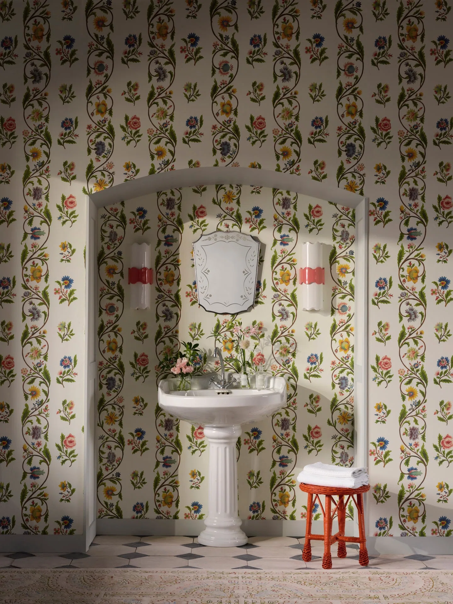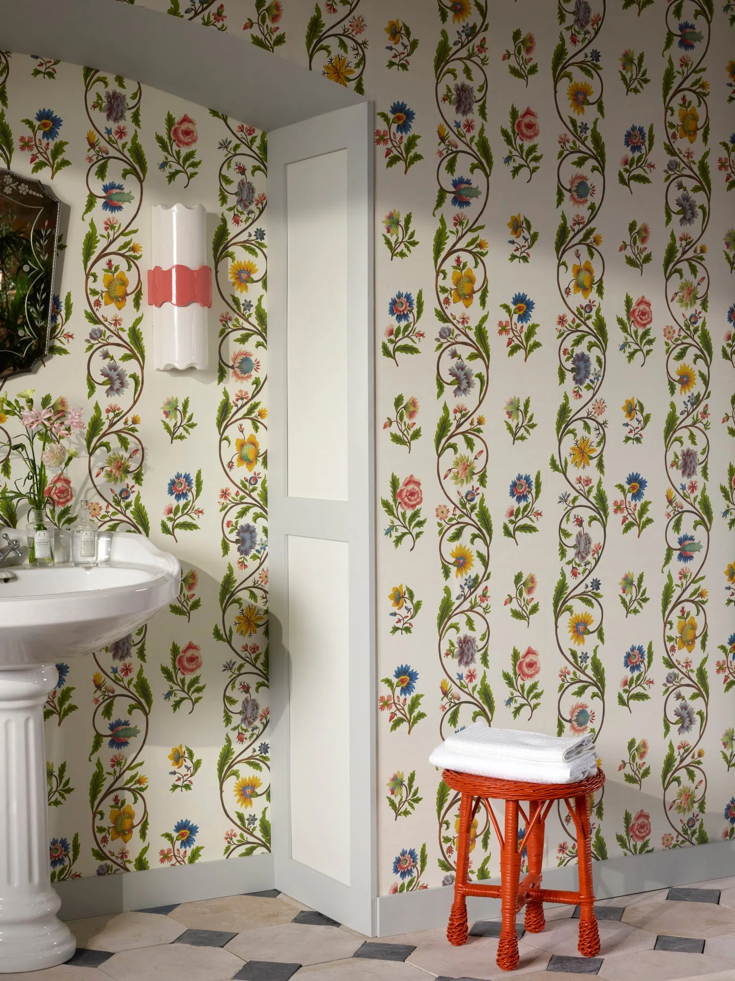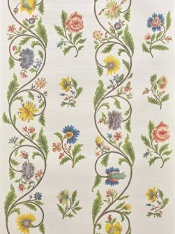 This motif, painted on silk and composed of delicate flowers — carnations, roses, or peonies — arranged in garlands and vertical bands, is preserved in the archives of Maison Pierre Frey. Reimagined as a charming floral stripe, printing on silk-embossed vinyl preserves its original elegance.