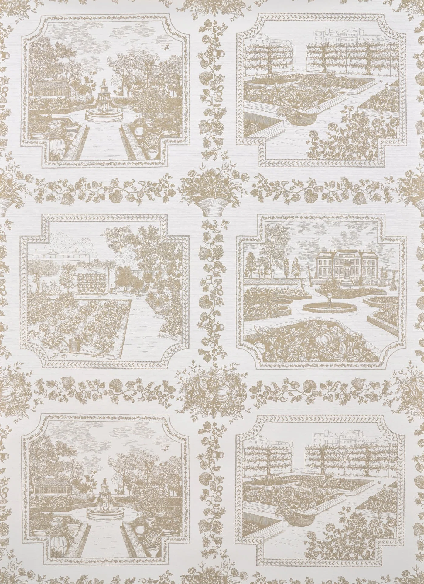 Inspired by the classic Toile de Jouy, Pauline Channet exquisitely depicts the kitchen gardens of château grounds, each detail carefully wrought. The wide-width printing on a high-performance vinyl with a straw-embossed texture gives it a resolutely contemporary look.