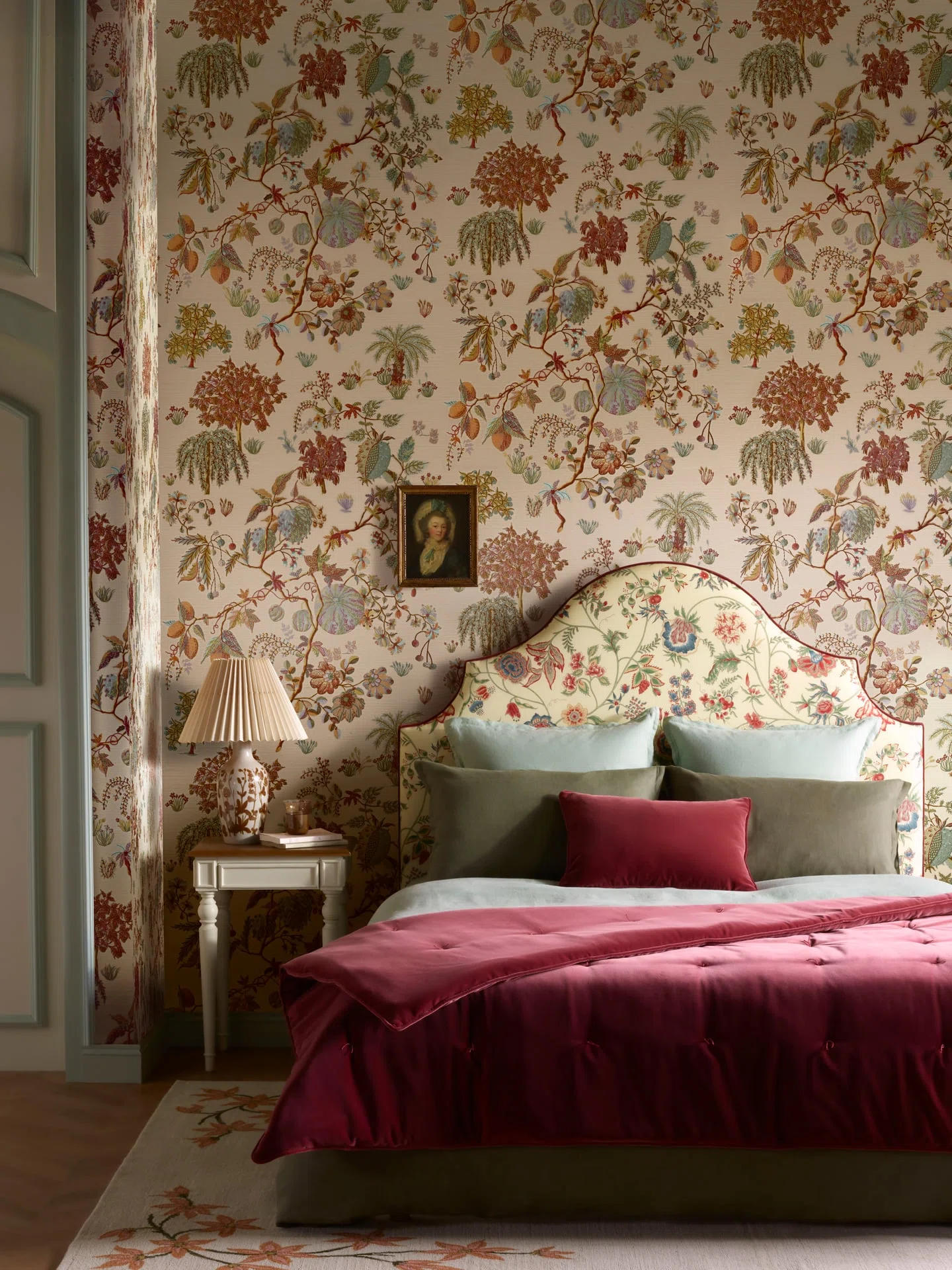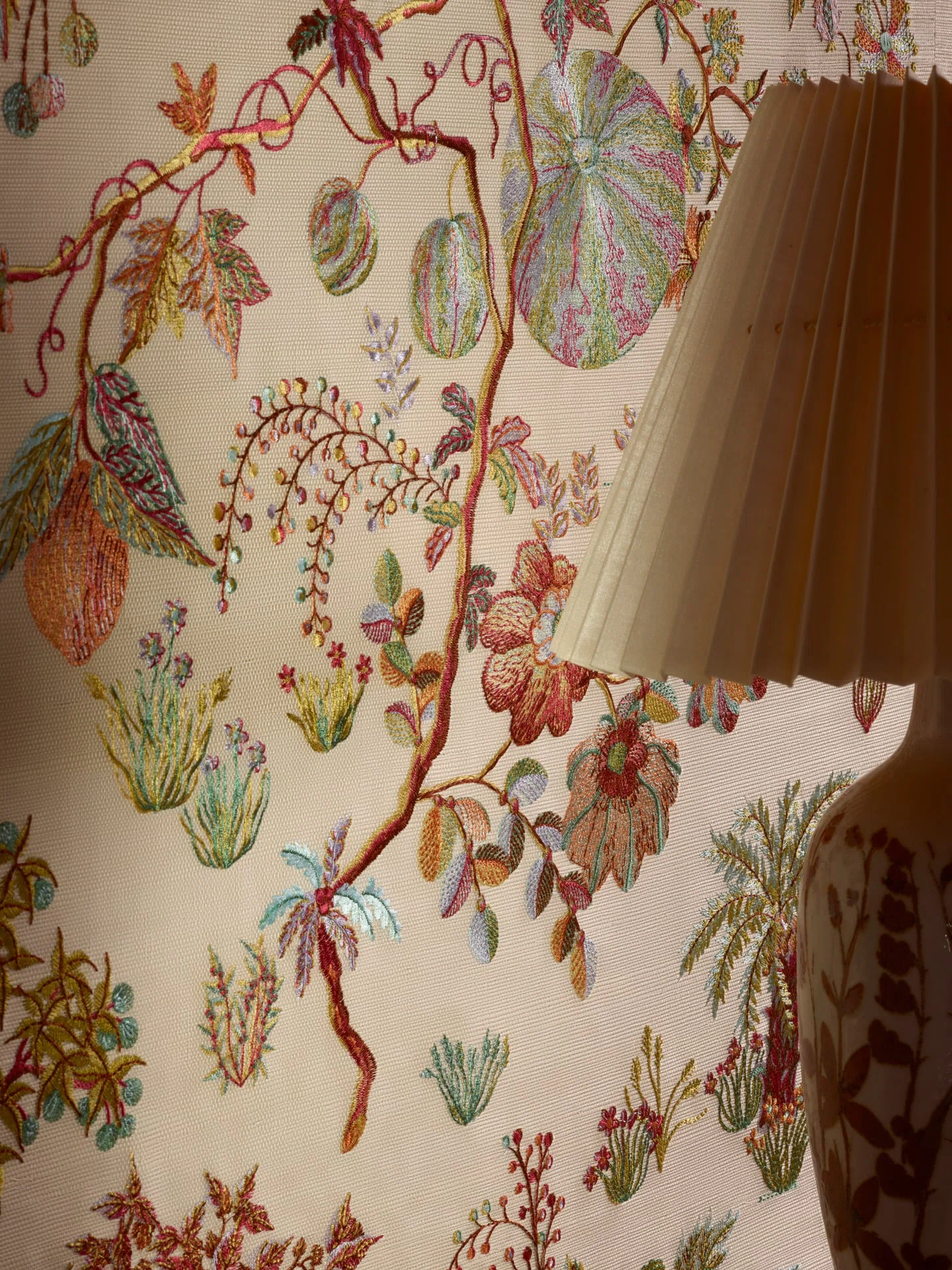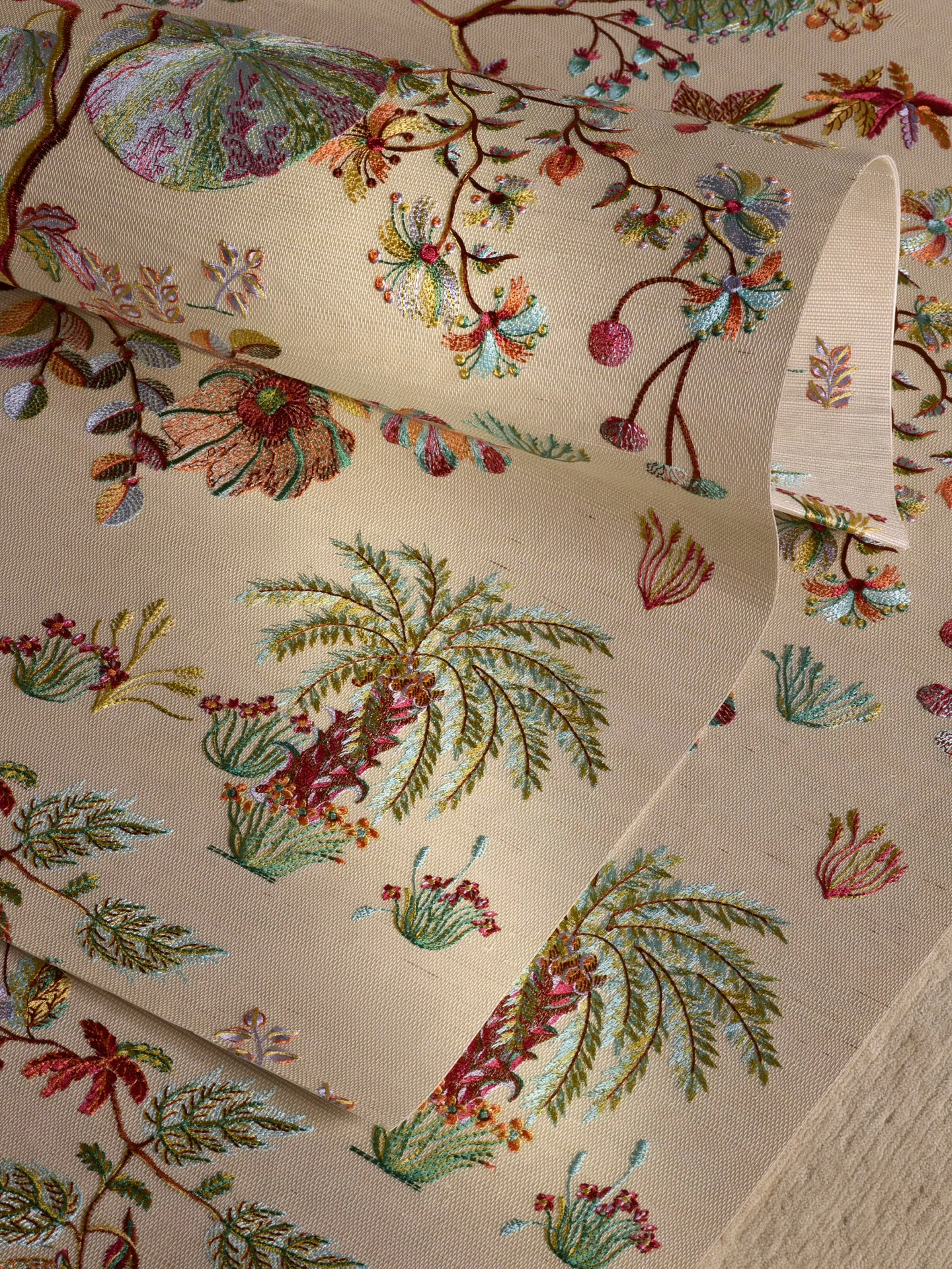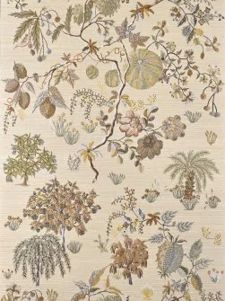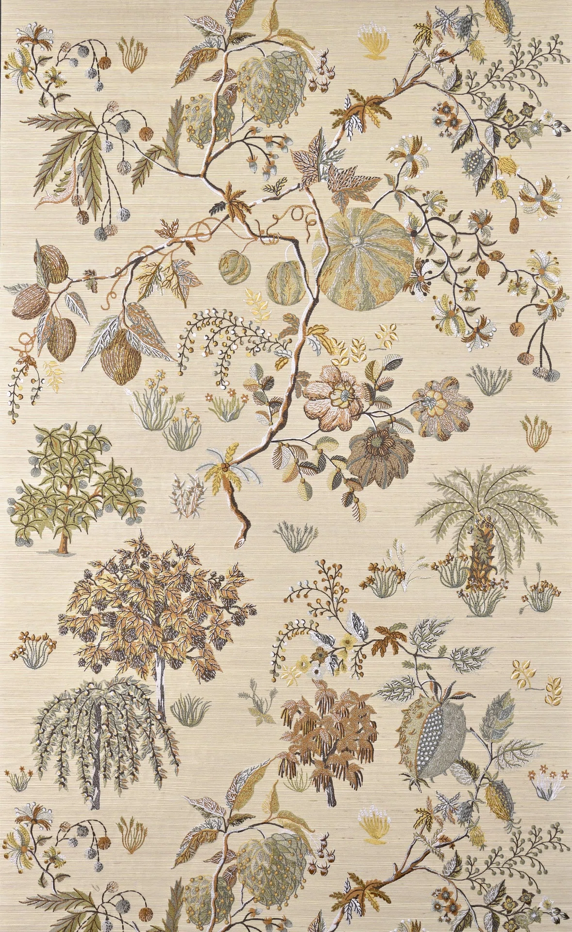 This exquisite embroidered wall covering on sisal, laminated onto a non-woven backing, brings orchard gardens to life with their fruits, flowers, and shrubs. Conceived by Sarah Bréassier, the design’s thousand delicate details transform it into a motif of rare distinction. The wall is adorned in its finest splendor.